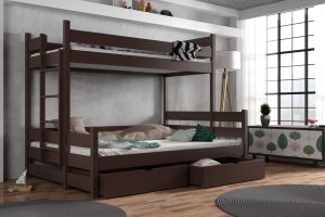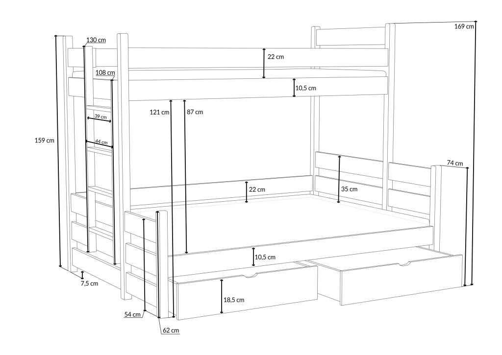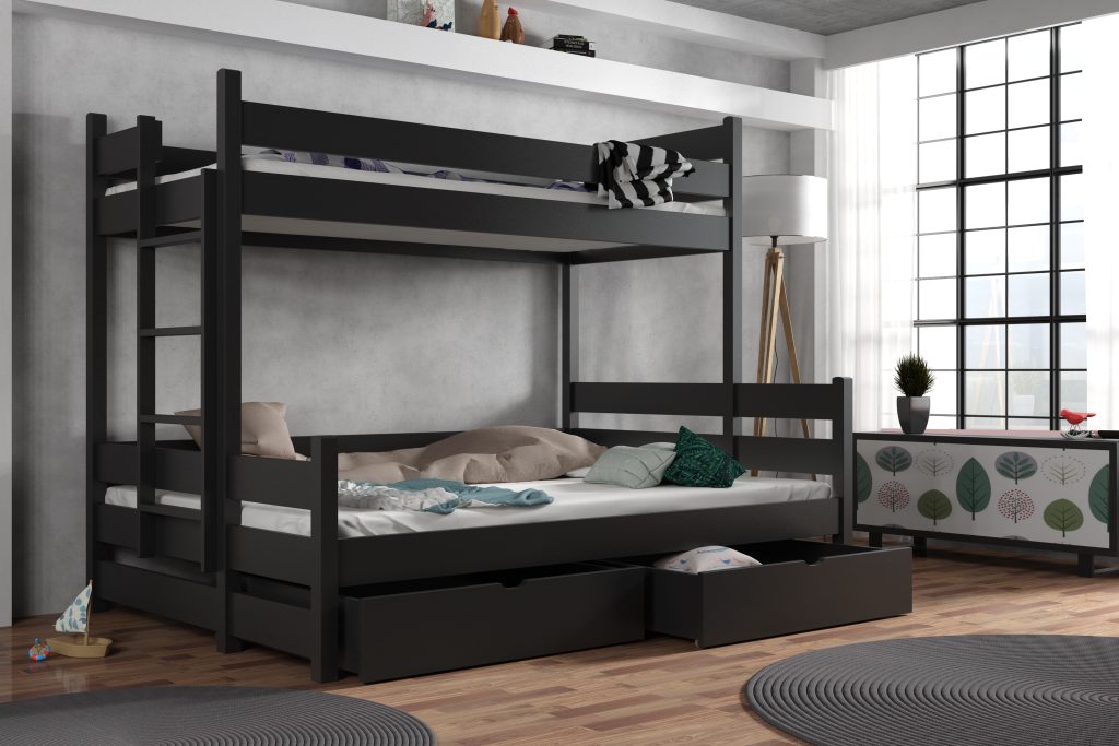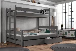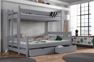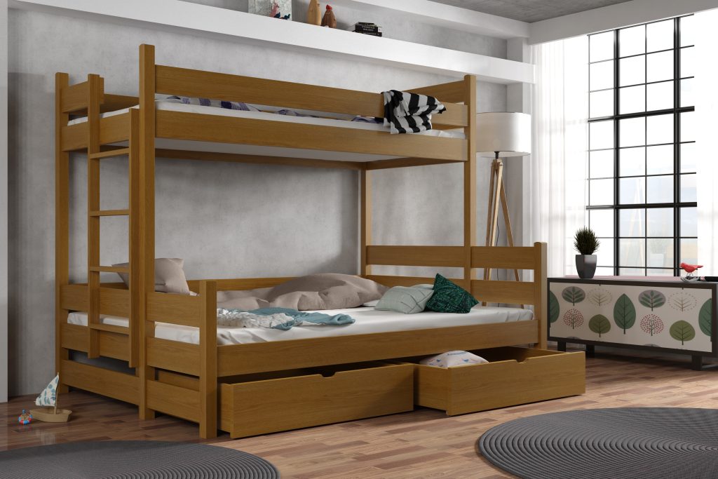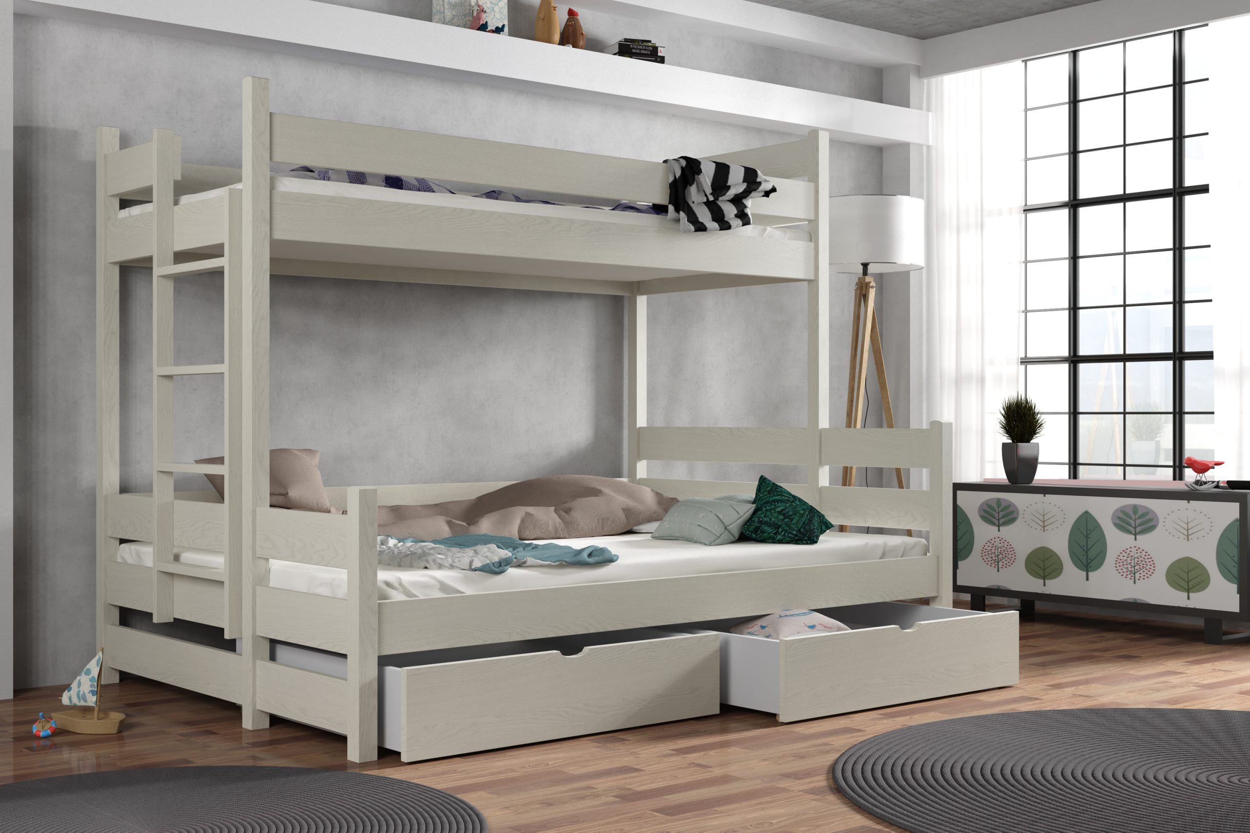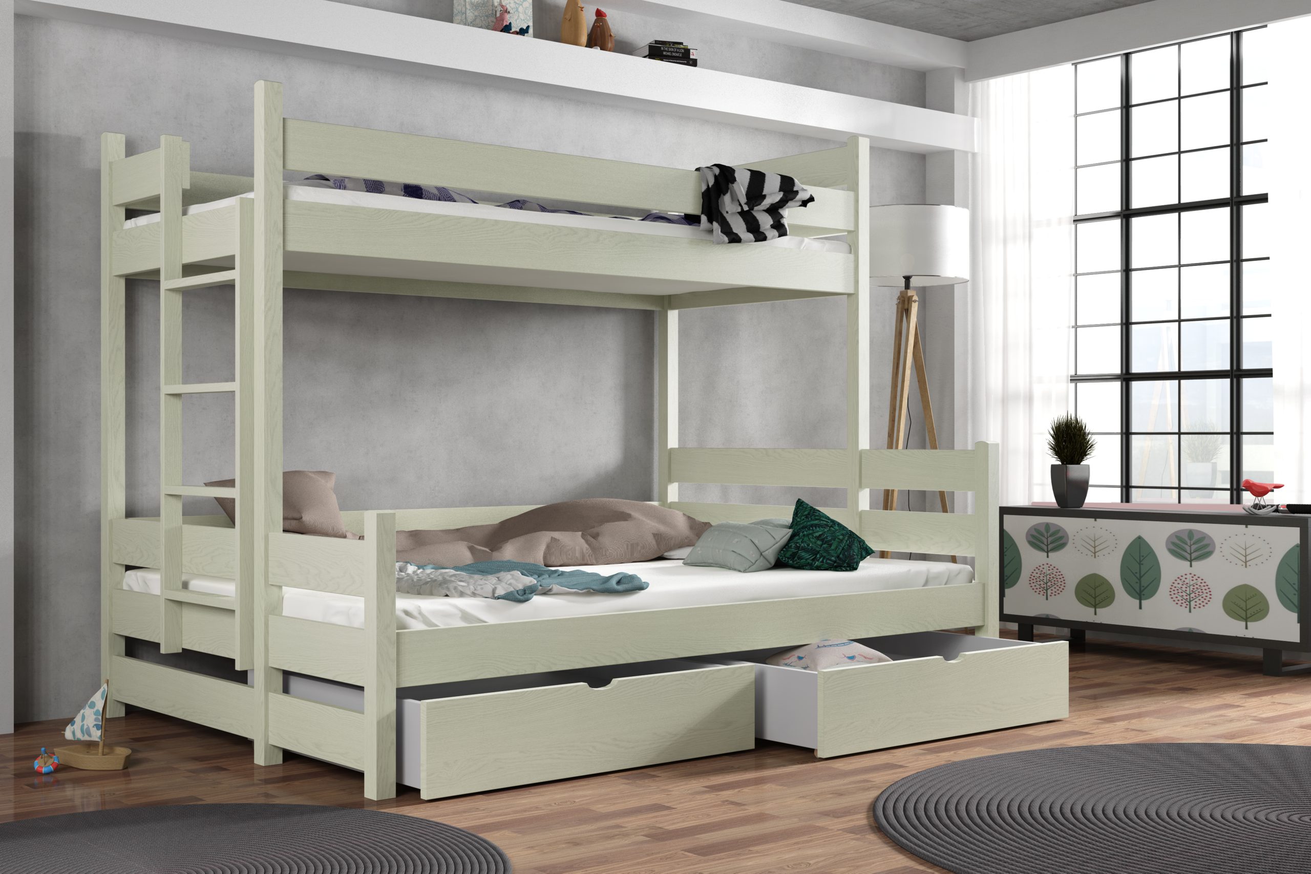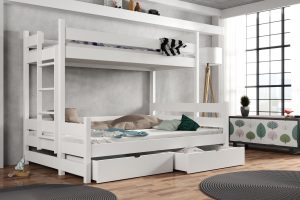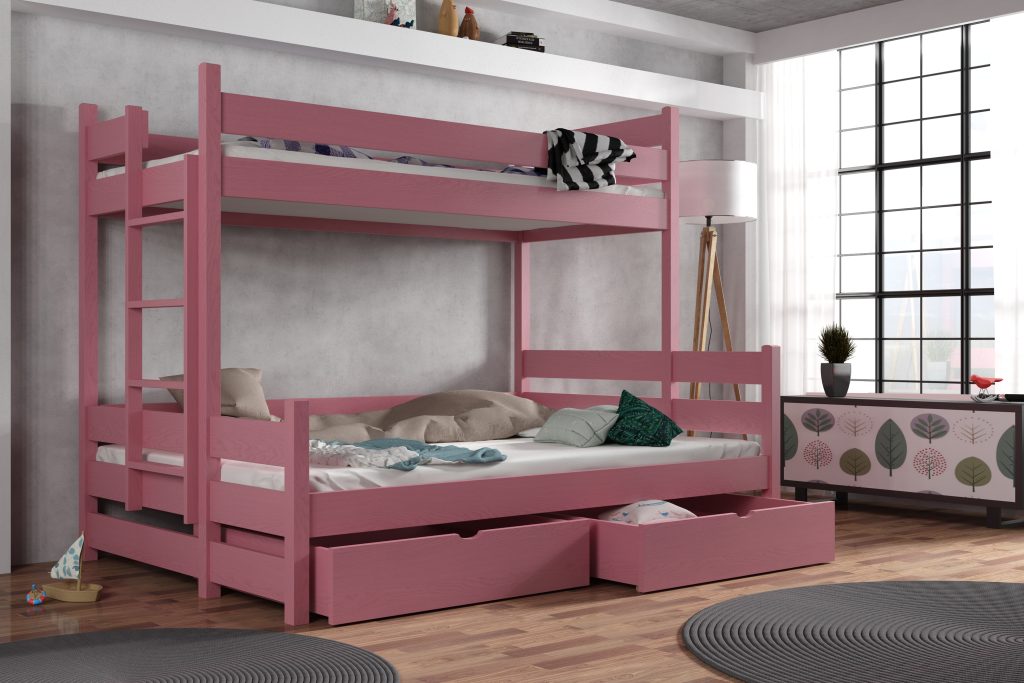 Łóżko potrójne Albert z litego drewna sosnowego oferuje przestronny dolny materac mieszczący trójkę dzieci lub dorosłego gościa, a harmonijne połączenie smukłej bryły, bezpiecznych barierek i drabinki tworzy elegancką, przytulną aranżację każdego pokoju. Opcjonalne szuflady na pościel lub zabawki i możliwość wyboru spośród 6 rozmiarów i 12 kolorów pozwalają dostosować mebel do indywidualnych potrzeb.