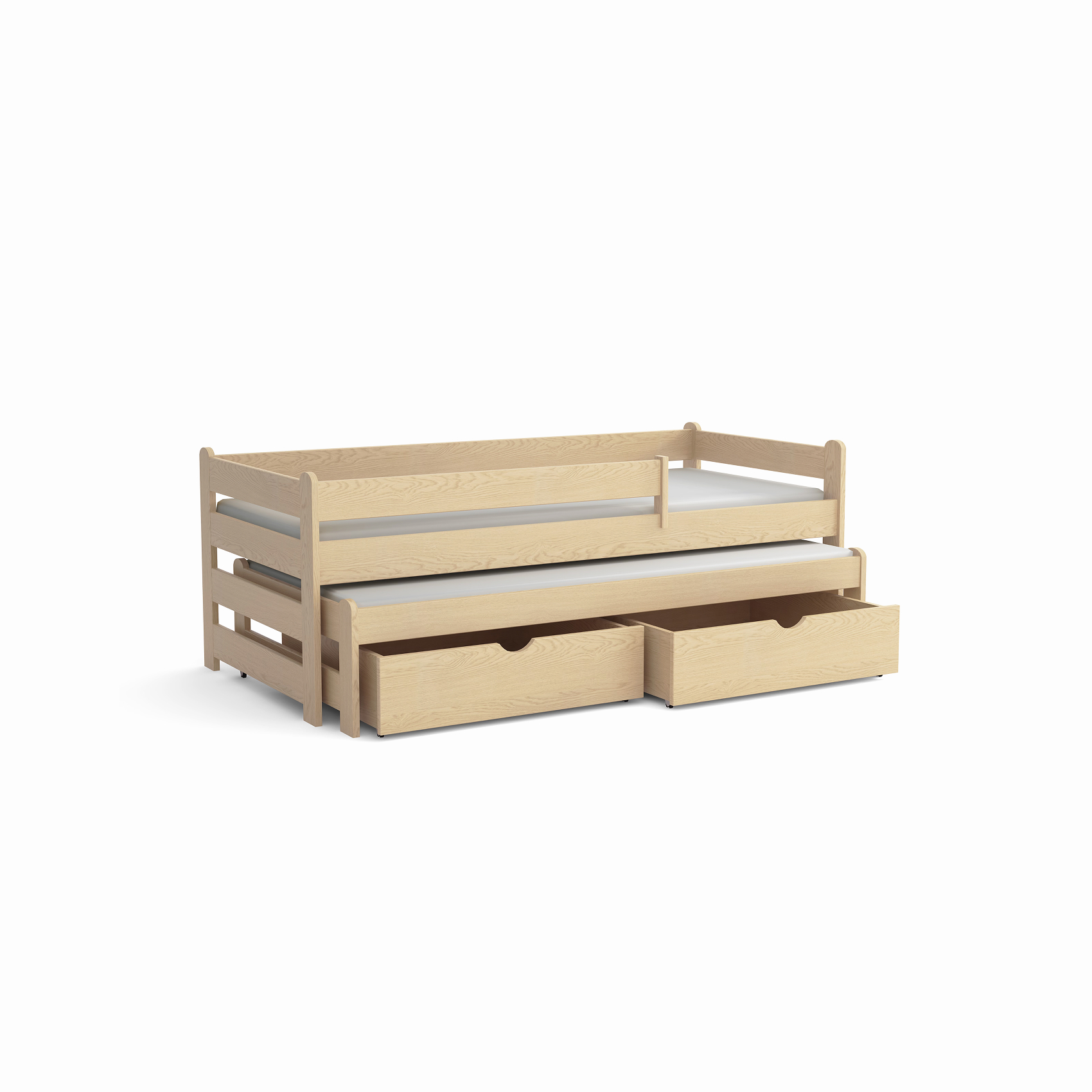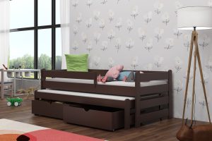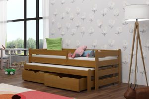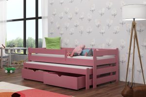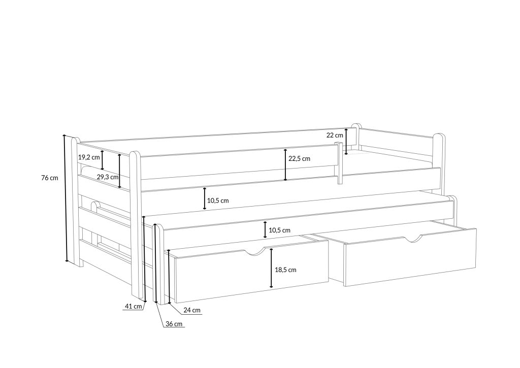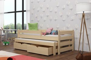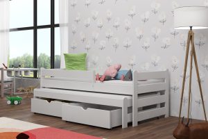Łóżko Aleks wyróżnia się wytrzymałością i odpornością na uszkodzenia, dzięki zastosowaniu najwyższej jakości drewna sosnowego. Zaokrąglone zagłówki dbają o bezpieczeństwo najmłodszych, a opcjonalne szuflady pozwalają na wygodne przechowywanie niezbędnych rzeczy. Model dostępny jest w 11 rozmiarach i 12 kolorach, co ułatwia dopasowanie do różnych aranżacji. Warto pamiętać, że biały kolor z czasem może delikatnie się zmieniać pod wpływem intensywnego nasłonecznienia. Szuflady i barierkę można dobrać według własnych potrzeb.