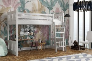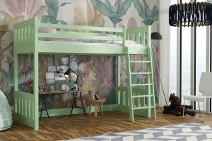Wysoka antresola to sposób na maksymalne wykorzystanie przestrzeni w pokoju. Na górze znajduje się wygodne miejsce do snu, a pod spodem – wolna strefa, którą możesz zaaranżować według potrzeb dziecka. Może to być kącik do nauki z biurkiem, miejsce do zabawy, czy też praktyczna przestrzeń do przechowywania z pojemnikami lub regałem.