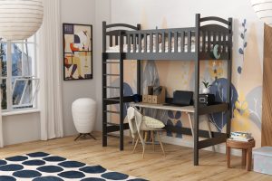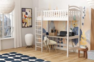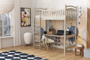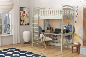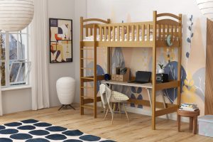 - Przeznaczenie: łóżko z antresolą – idealne do pokoju dziecięcego, zapewnia przestrzeń do spania oraz strefę zabawy lub nauki pod spodem