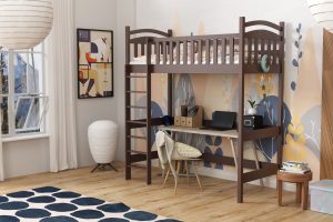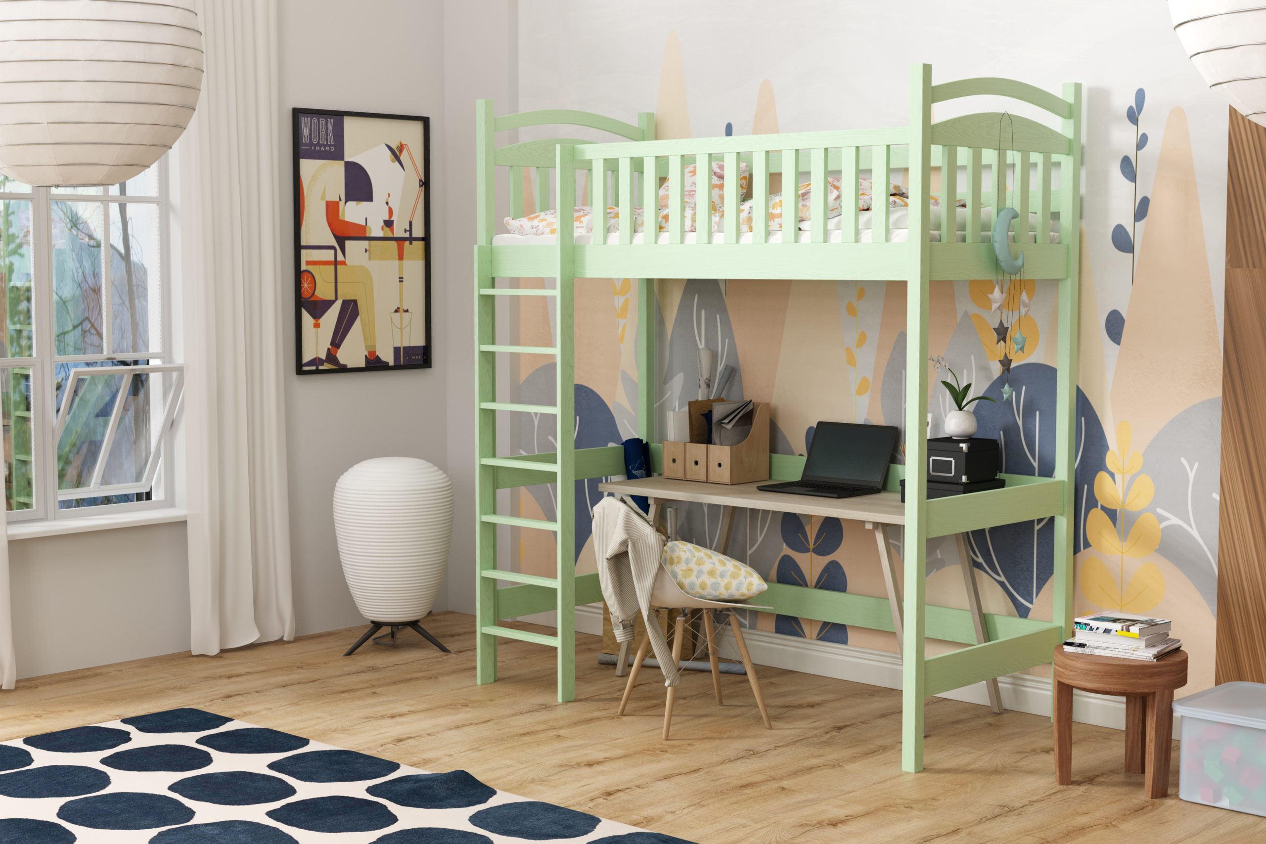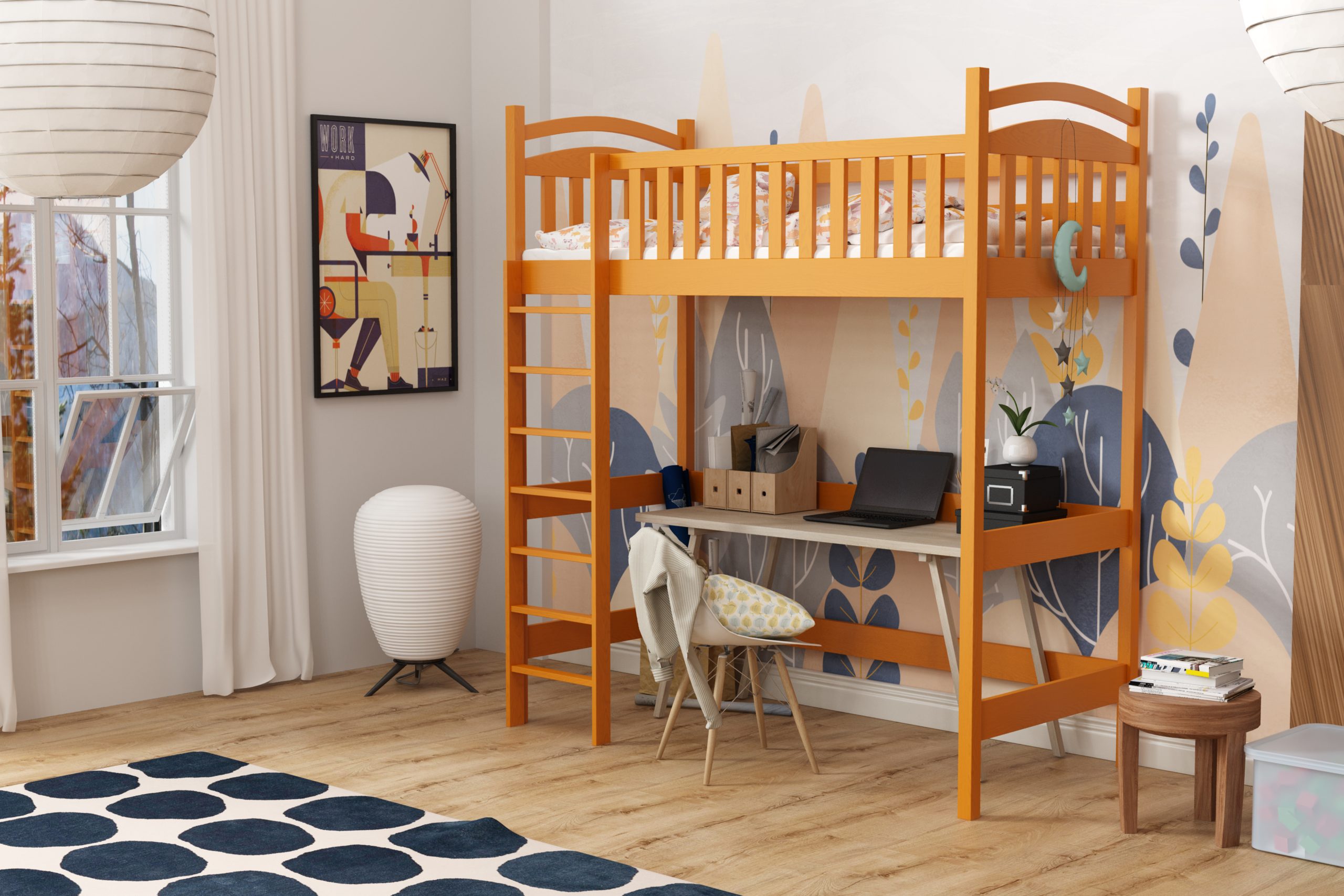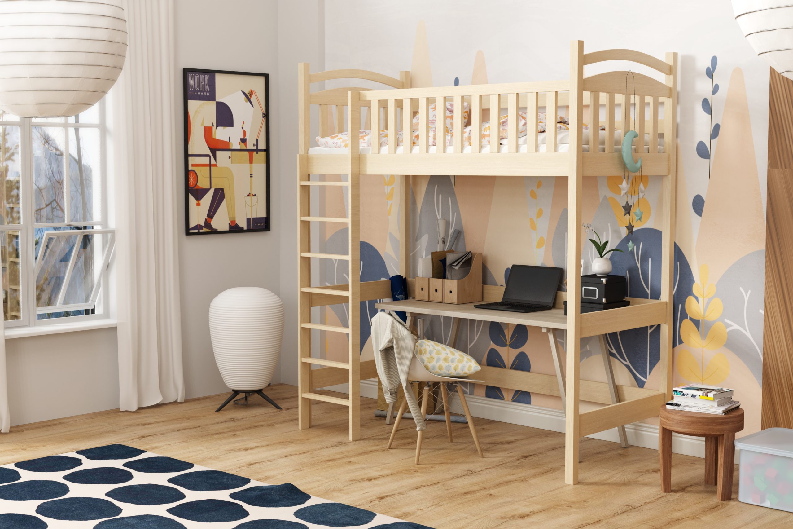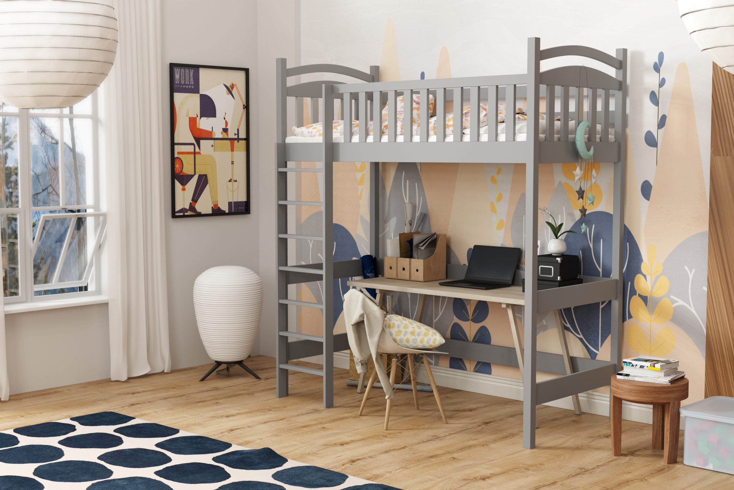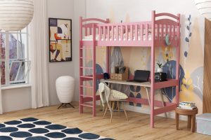 Łóżko na antresoli Anita to przestronne, wysokie łóżko z litego drewna sosnowego, które łączy wygodne miejsce do spania z funkcjonalną strefą pod spodem – idealną na biurko, kącik czytelniczy lub kreatywne zajęcia.