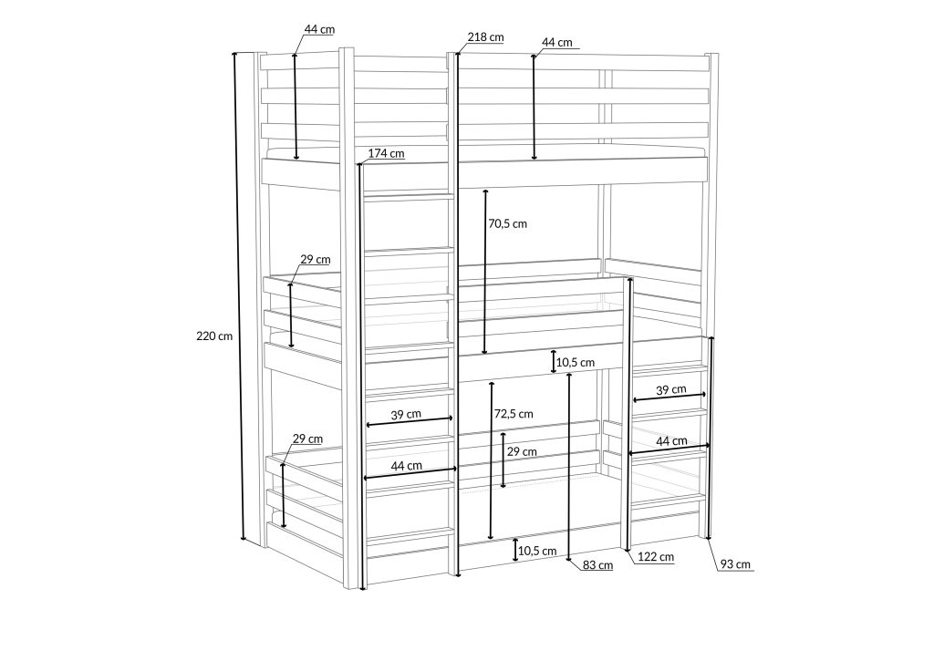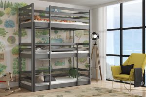 Szukasz funkcjonalnego i oszczędzającego miejsce mebla do pokoju dziecięcego? Łóżko piętrowe Arizona zostało zaprojektowane z myślą o rodzinach z trójką dzieci. Dzięki niemu każde z Twoich pociech zyska komfortowe miejsce do spania, a Ty zaoszczędzisz cenną przestrzeń, którą możesz wykorzystać według własnych potrzeb – na strefę zabawy, nauki lub przechowywania.