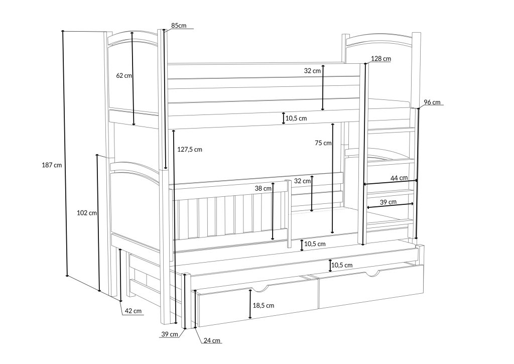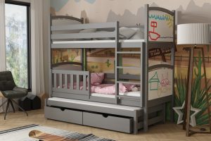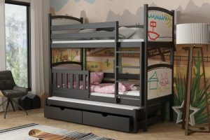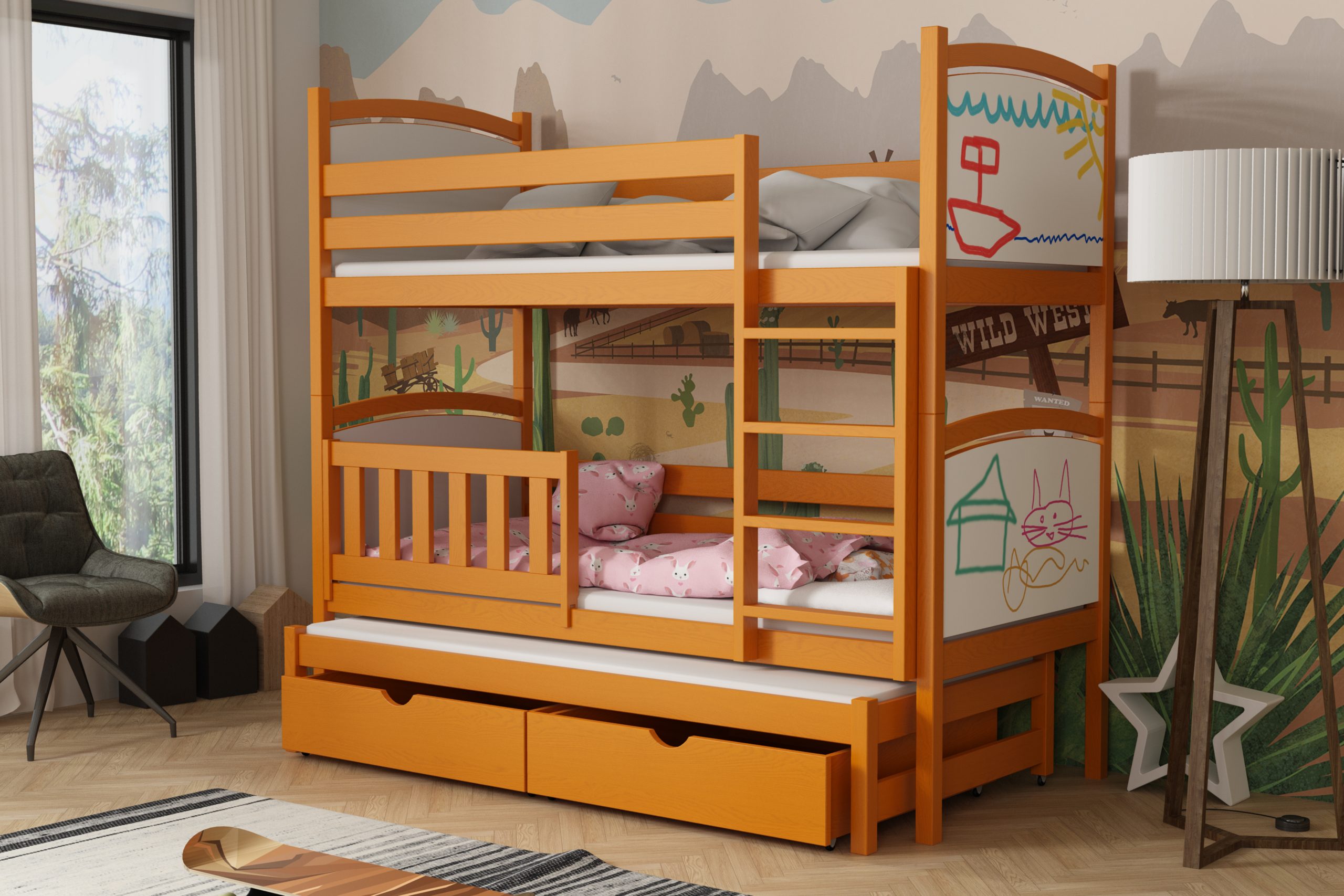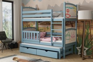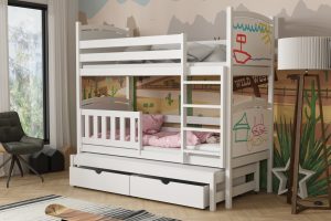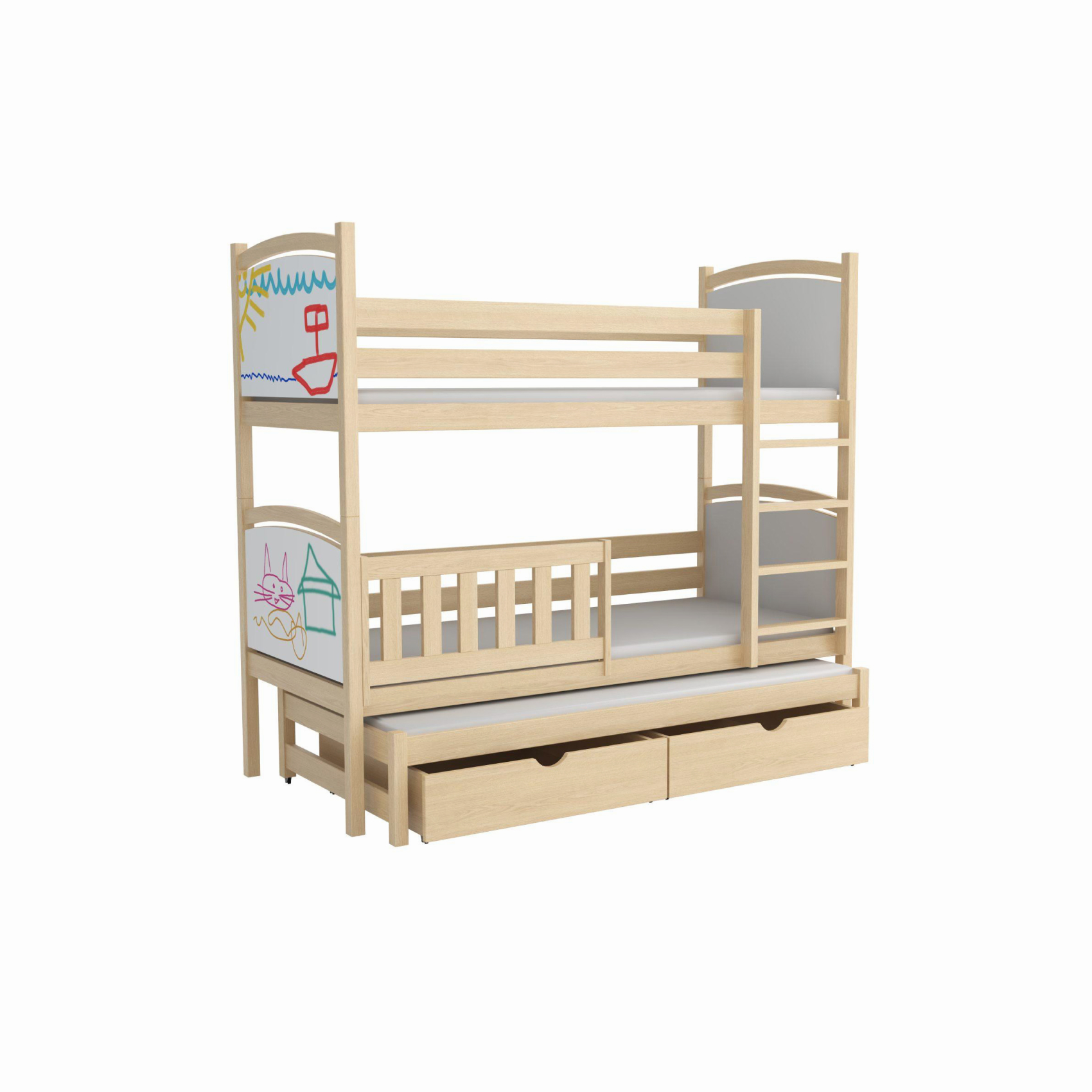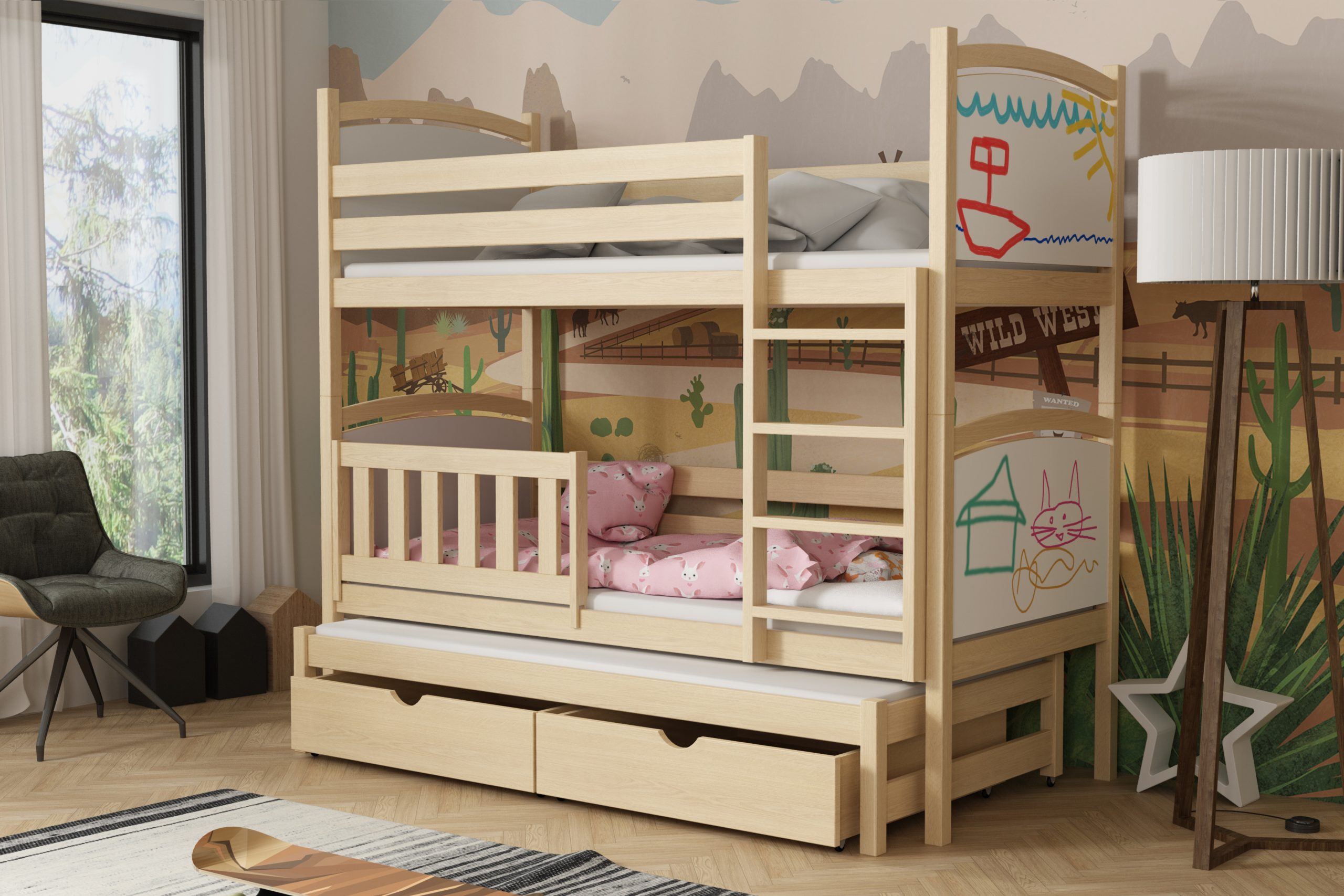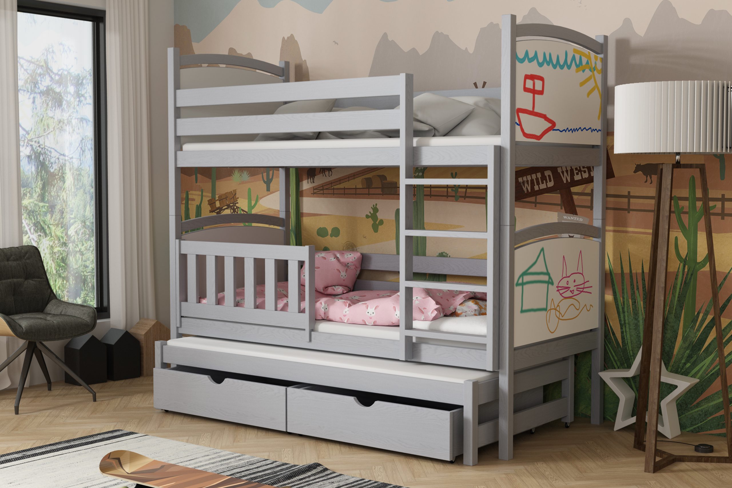 Łóżko potrójne Floryda łączy przestrzeń do spania dla trzech osób, dwie pojemne szuflady i tablice suchościeralne, oferując prosty, harmonijny design i praktyczną zabawę.
