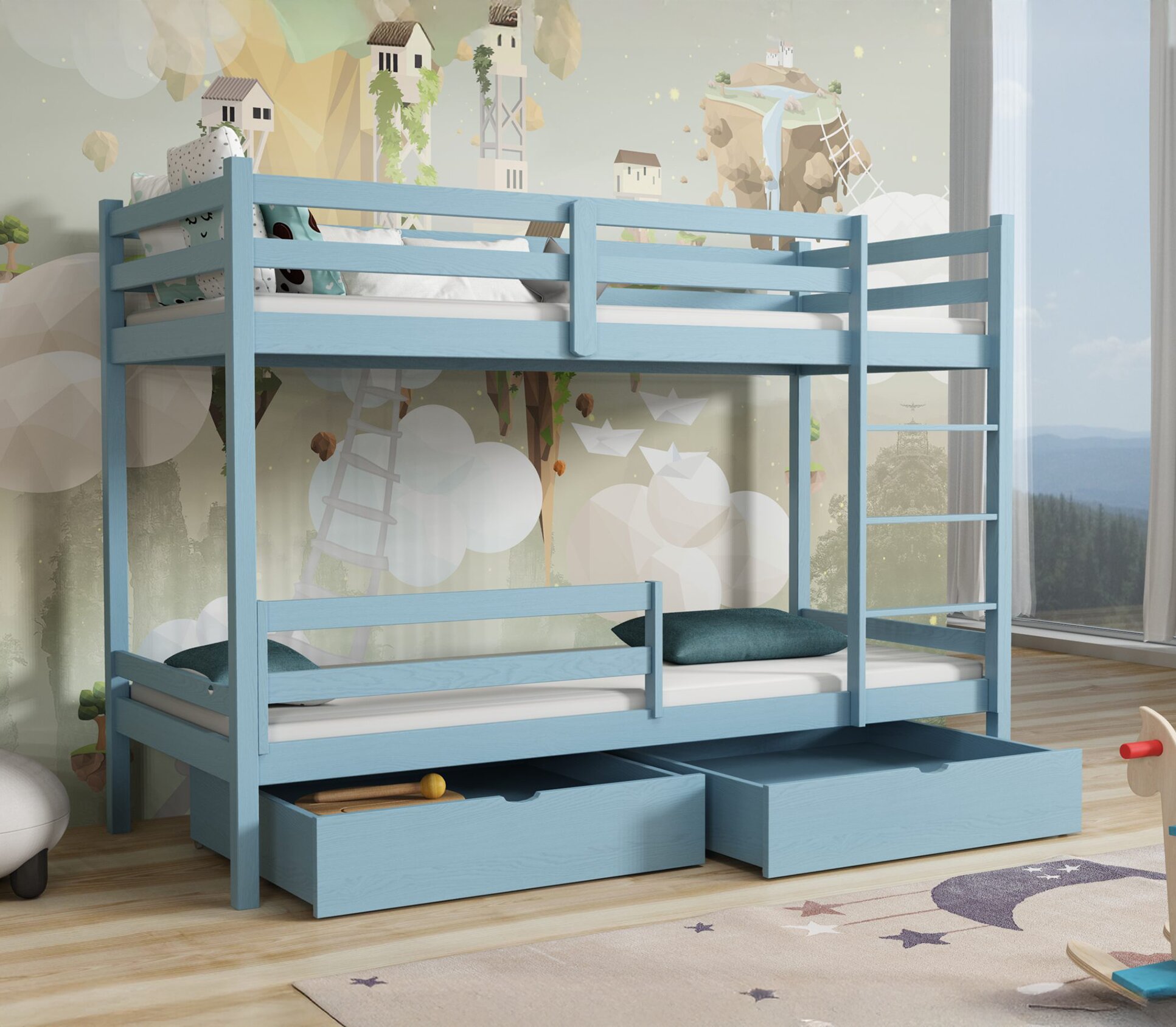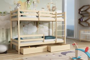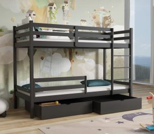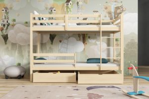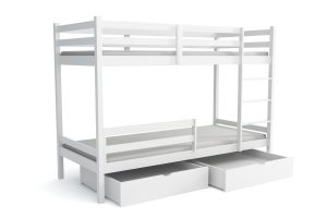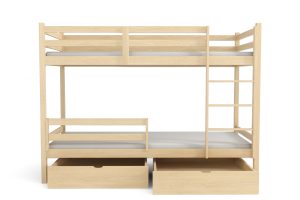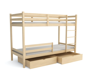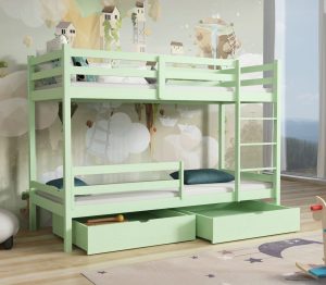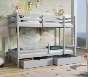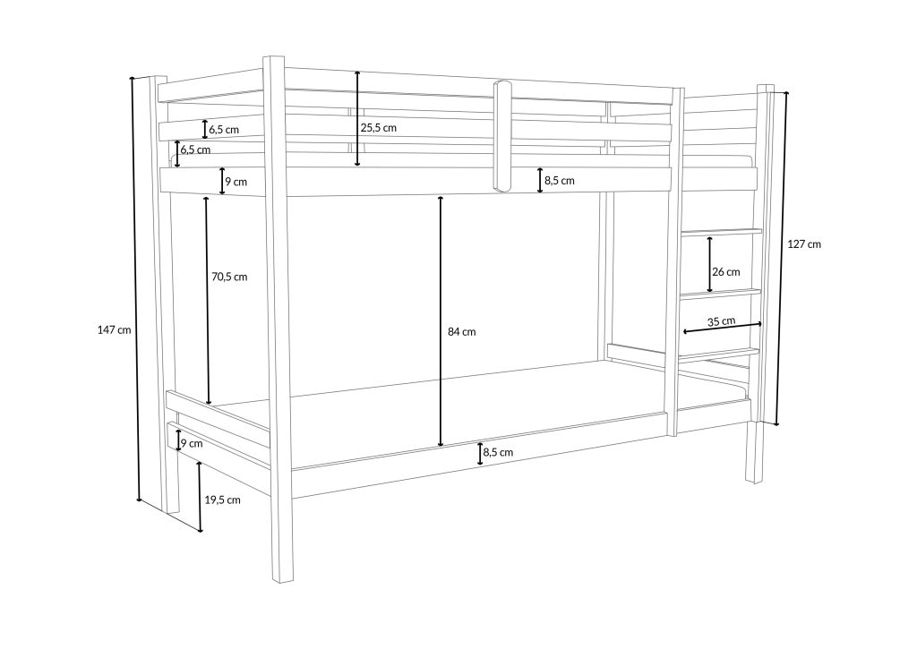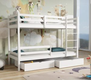 Górne łóżko wyposażono w barierkę ochronną, chroniącą przed przypadkowym upadkiem, natomiast dolne łóżko ma otwartą konstrukcję, co zapewnia łatwy dostęp z każdej strony – szczególnie praktyczne, gdy dzieci bawią się wspólnie. Klasyczny design łóżka dostępny jest w różnych kolorach i rozmiarach, co pozwala na idealne dopasowanie do wystroju pokoju oraz indywidualnych upodobań dzieci. Wysokie nóżki oraz praktyczna wnęka znajdująca się pod stelażem dolnego materaca ułatwiają utrzymanie porządku w pokoju, umożliwiając robotom sprzątającym dotarcie do trudno dostępnych miejsc. Jest to szczególnie istotne, zwłaszcza w przypadku dzieci cierpiących na alergię na kurz.