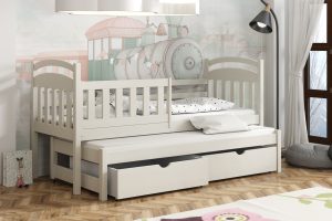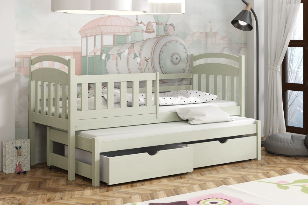 Łóżko Kacper to lekka, łukowo zaoblona konstrukcja z litego drewna sosnowego, wyposażona w wysuwane posłanie i pojemne szuflady, która oszczędza miejsce i zapewnia bezpieczny, komfortowy sen.