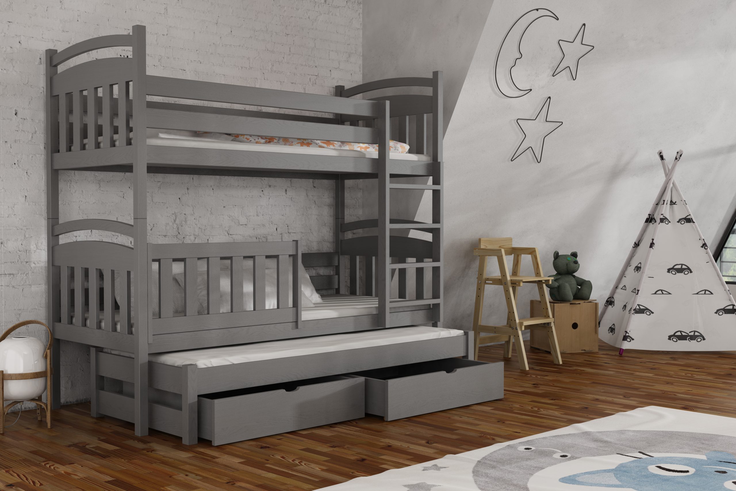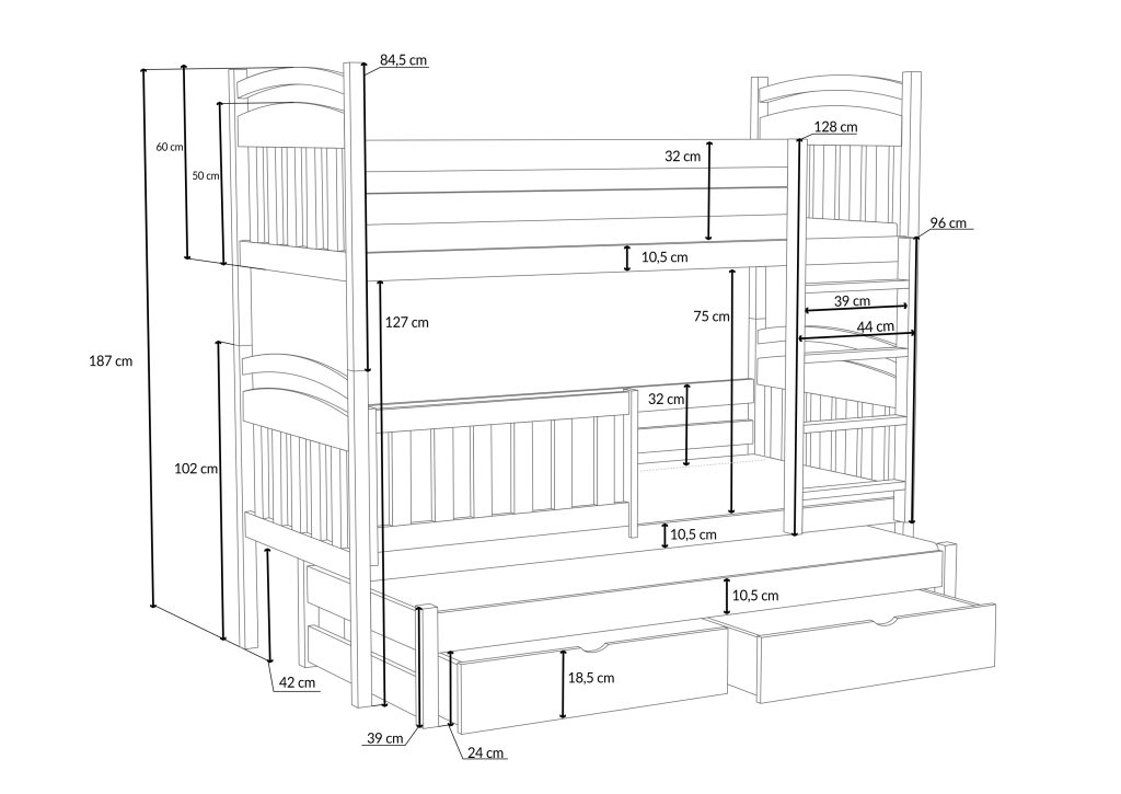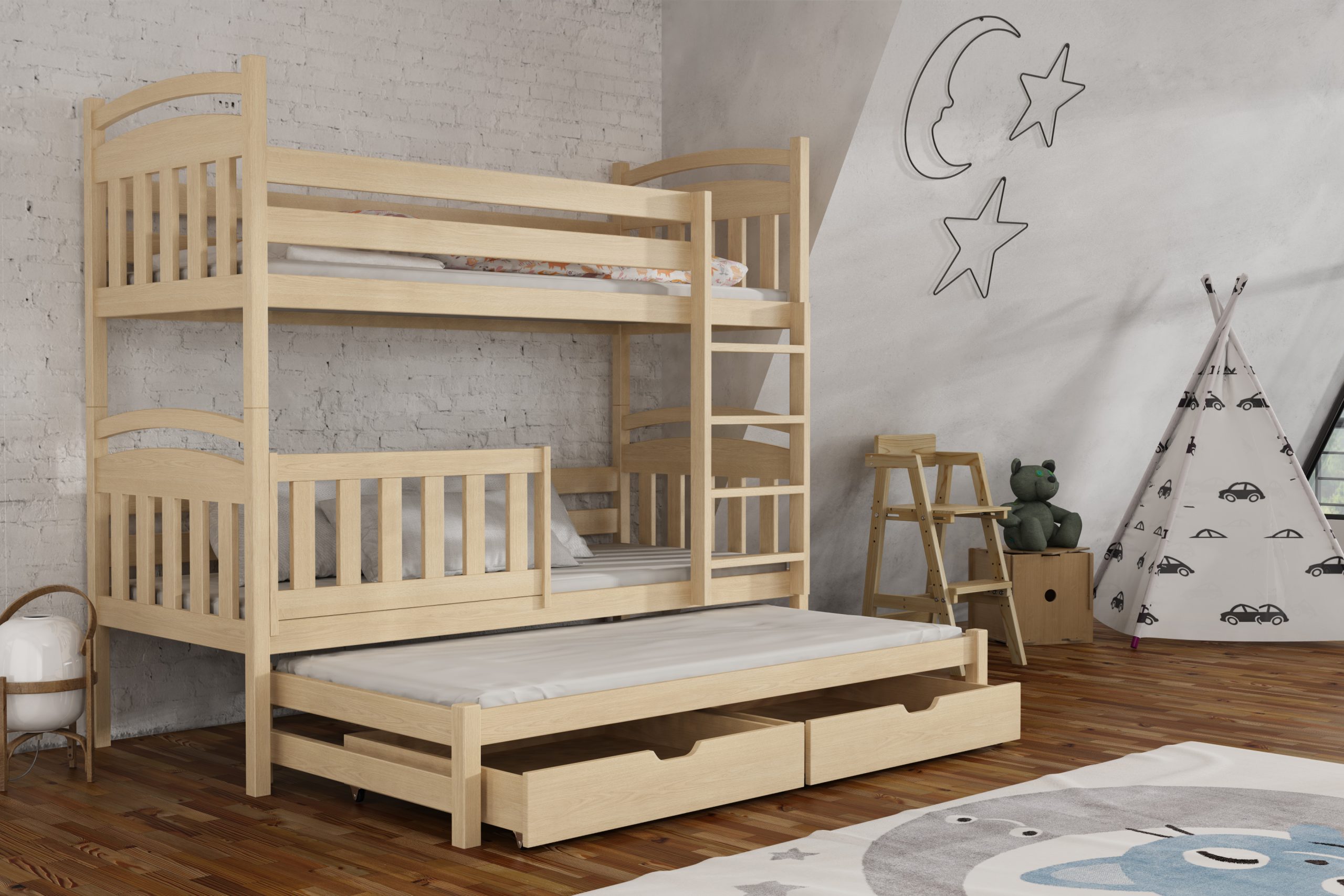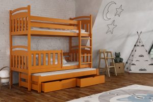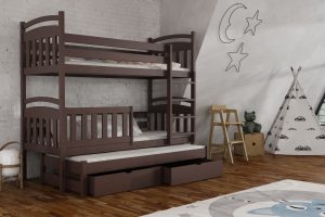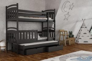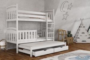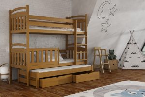 Łóżko potrójne Konrad to solidne i przestronne rozwiązanie, które pomieści aż trzy osoby, łącząc wygodę, bezpieczeństwo i oszczędność miejsca w dziecięcym pokoju.