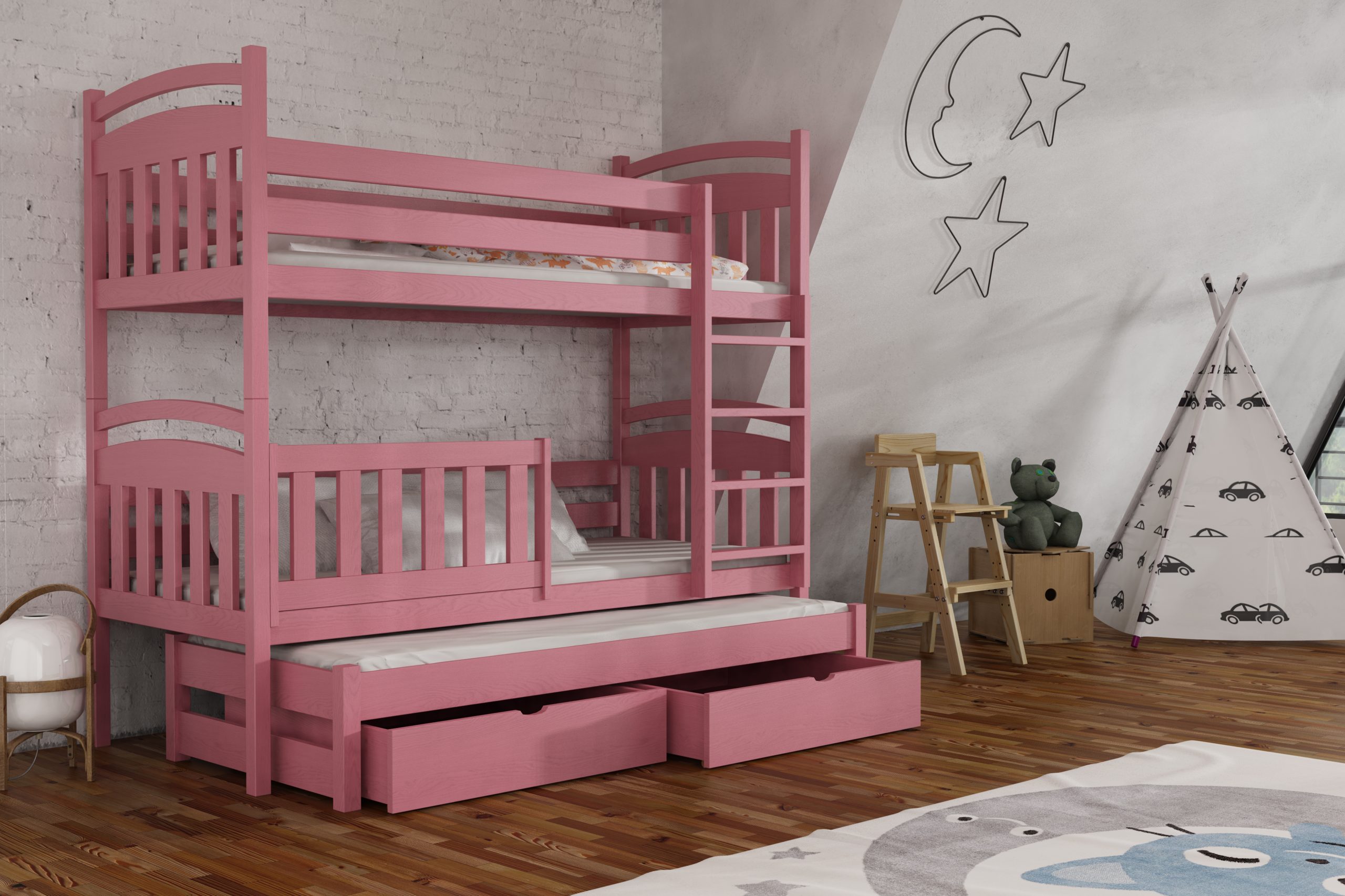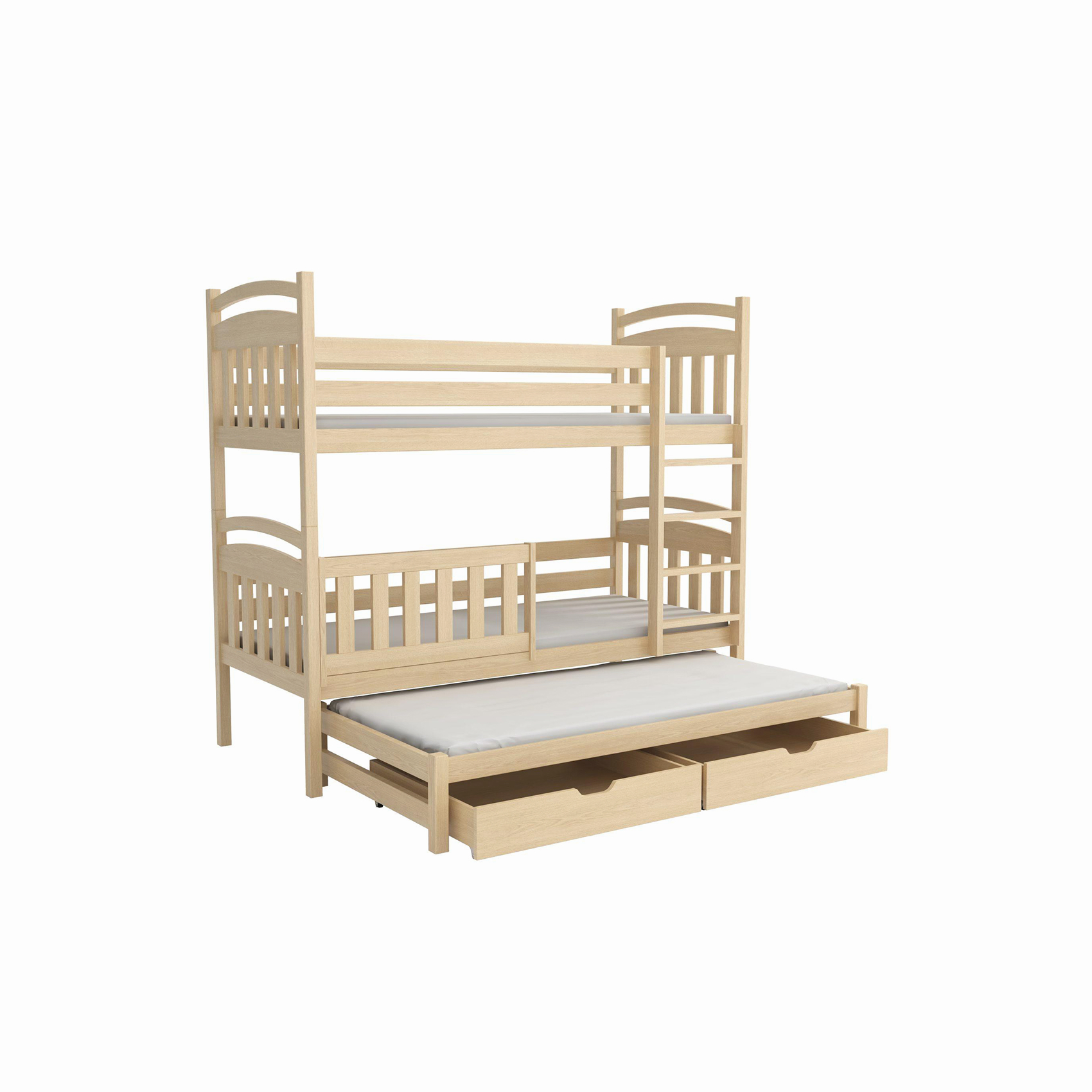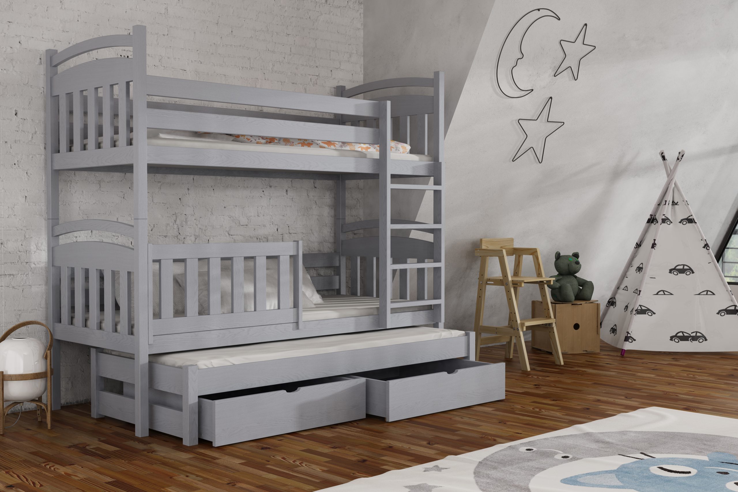 Łóżko potrójne Konrad to solidne i przestronne rozwiązanie, które pomieści aż trzy osoby, łącząc wygodę, bezpieczeństwo i oszczędność miejsca w dziecięcym pokoju.