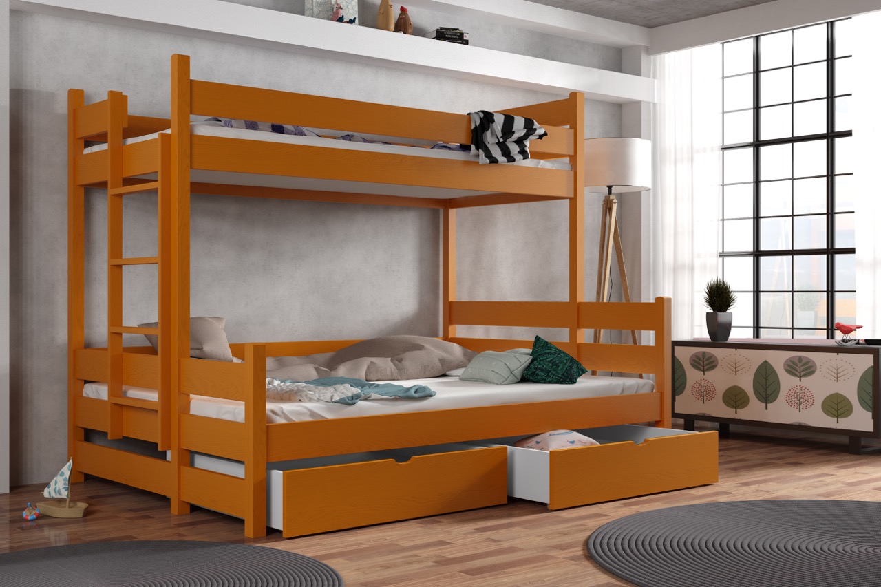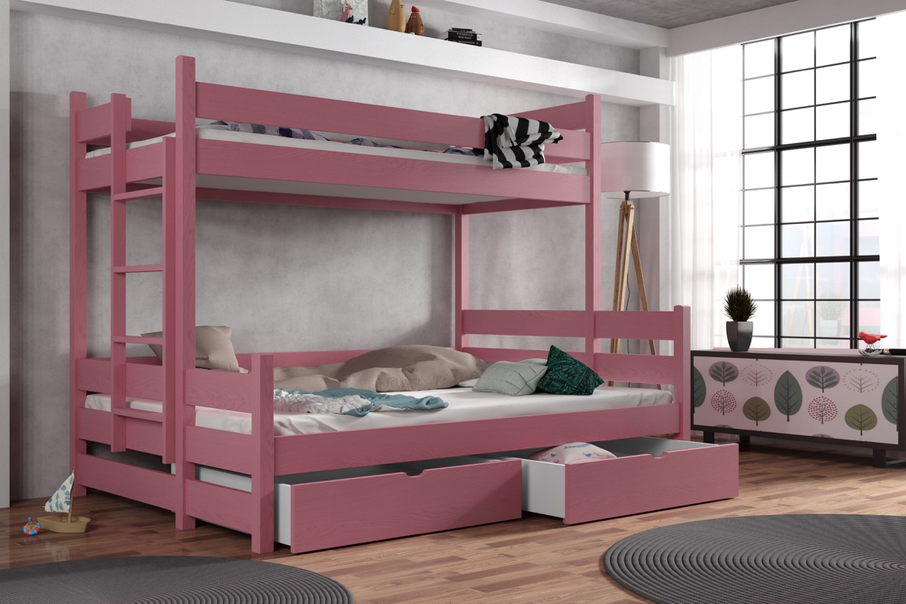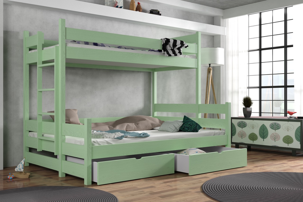 Łóżko potrójne Albert z litego drewna sosnowego oferuje przestronny dolny materac mieszczący trójkę dzieci lub dorosłego gościa, a harmonijne połączenie smukłej bryły, bezpiecznych barierek i drabinki tworzy elegancką, przytulną aranżację każdego pokoju. Opcjonalne szuflady na pościel lub zabawki i możliwość wyboru spośród 6 rozmiarów i 12 kolorów pozwalają dostosować mebel do indywidualnych potrzeb.