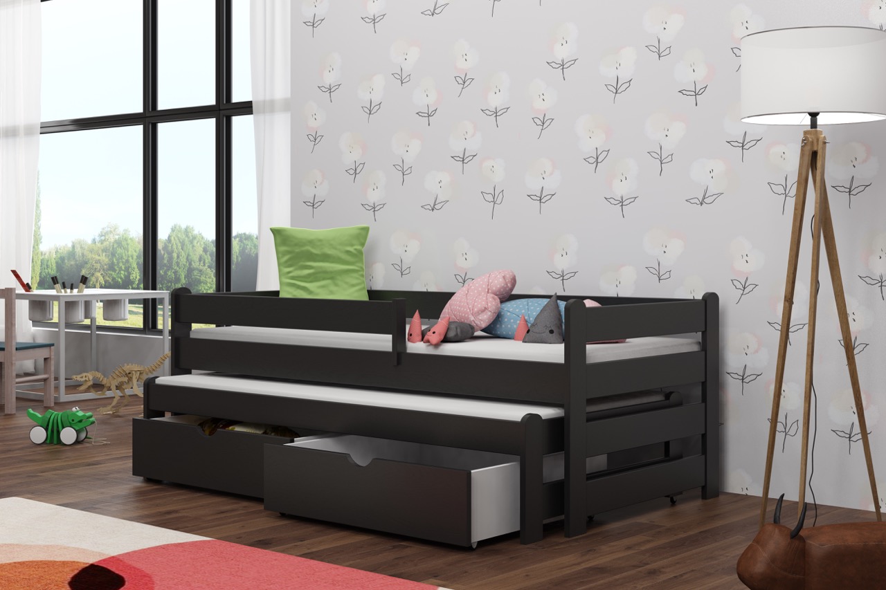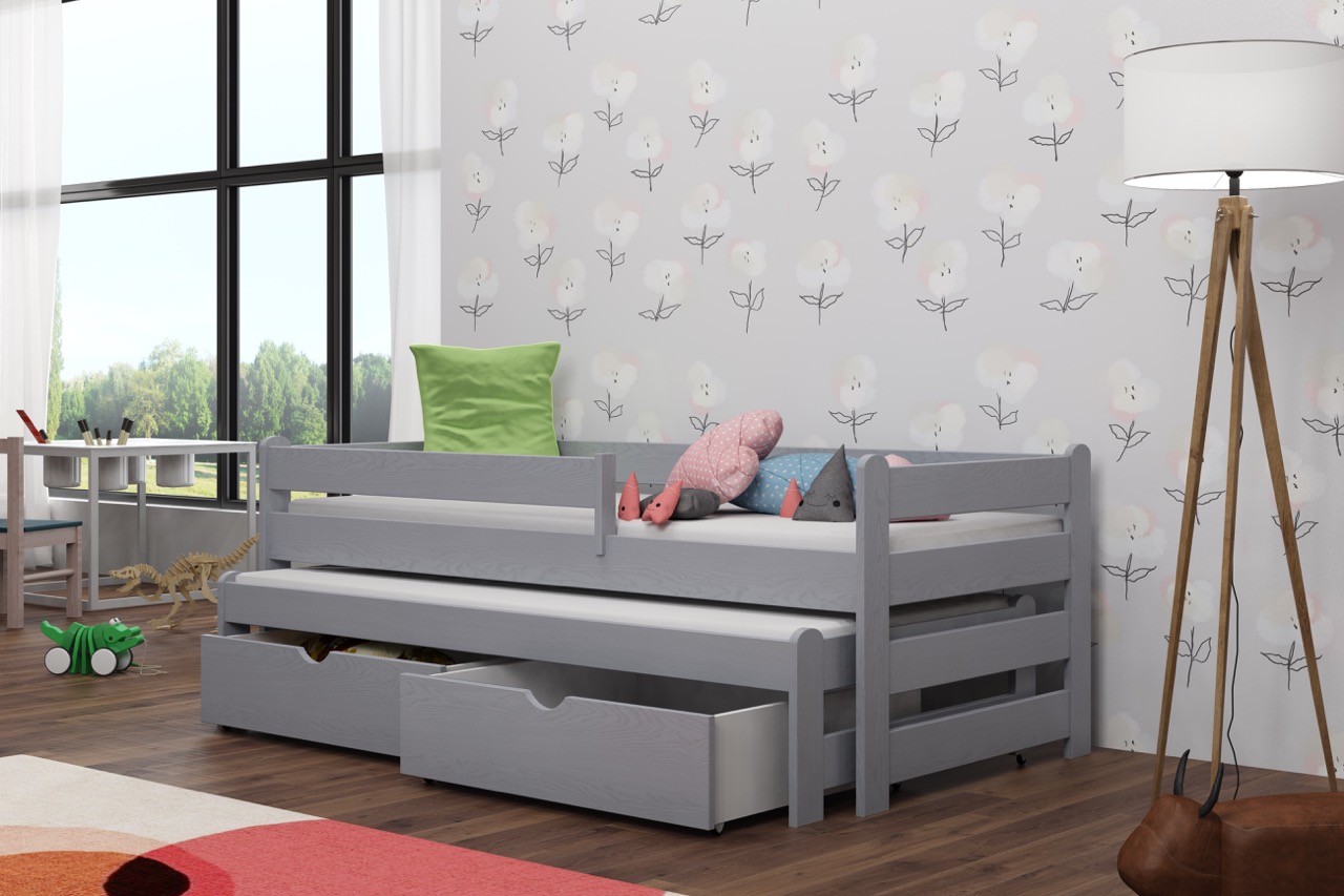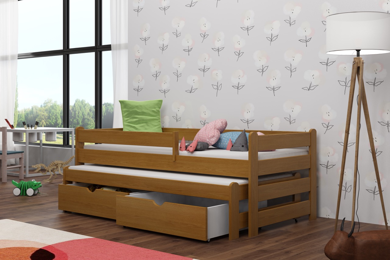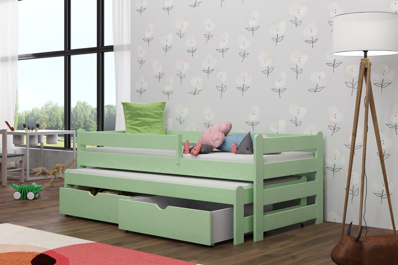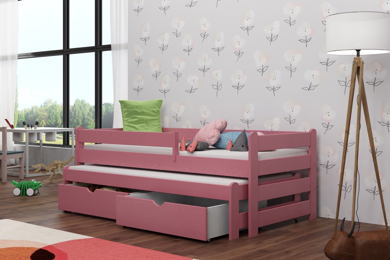 Łóżko Aleks wyróżnia się wytrzymałością i odpornością na uszkodzenia, dzięki zastosowaniu najwyższej jakości drewna sosnowego. Zaokrąglone zagłówki dbają o bezpieczeństwo najmłodszych, a opcjonalne szuflady pozwalają na wygodne przechowywanie niezbędnych rzeczy. Model dostępny jest w 11 rozmiarach i 12 kolorach, co ułatwia dopasowanie do różnych aranżacji. Warto pamiętać, że biały kolor z czasem może delikatnie się zmieniać pod wpływem intensywnego nasłonecznienia. Szuflady i barierkę można dobrać według własnych potrzeb.