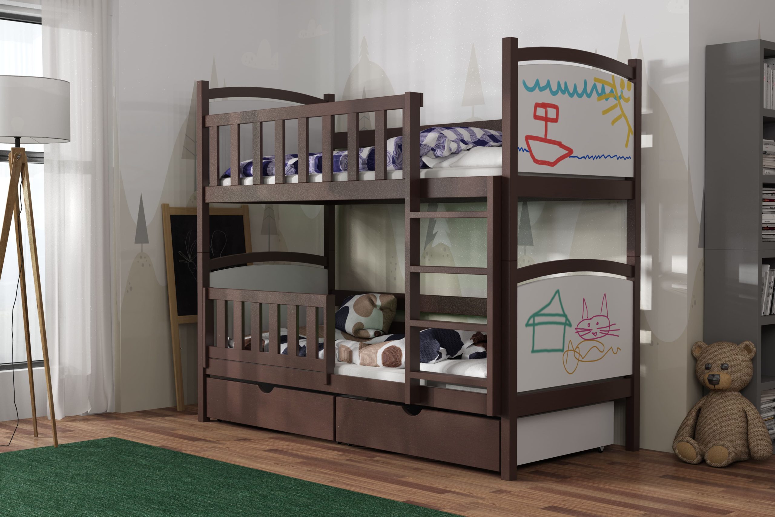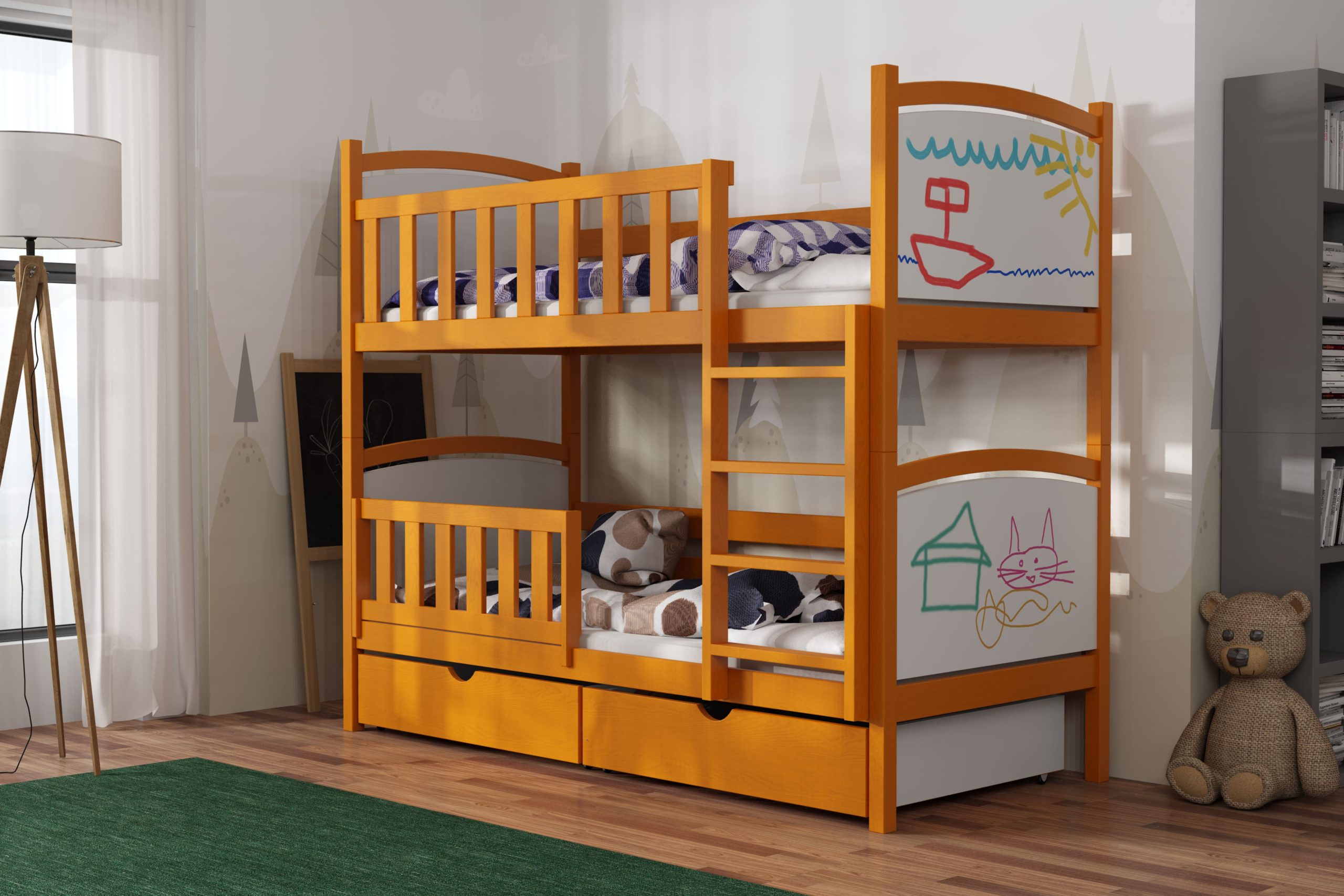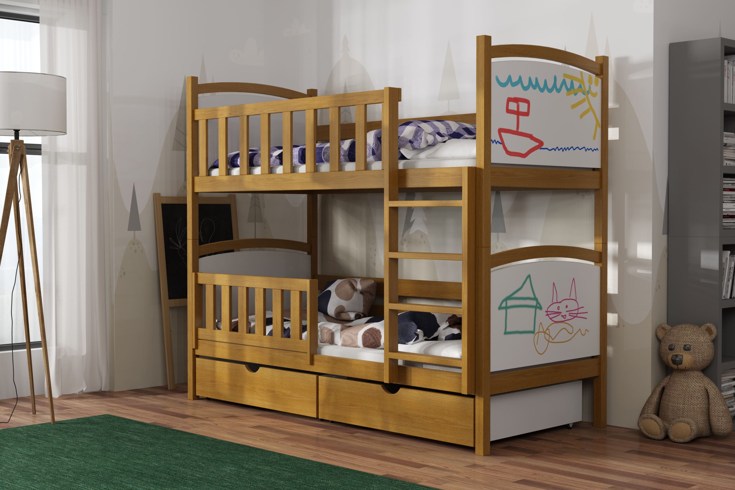 Łóżko piętrowe Bartuś z litego drewna sosnowego łączy stabilną konstrukcję, ochronne barierki i szeroką drabinkę z radosną grafiką zagłówków, zapewniając bezpieczny sen i mnóstwo zabawy.