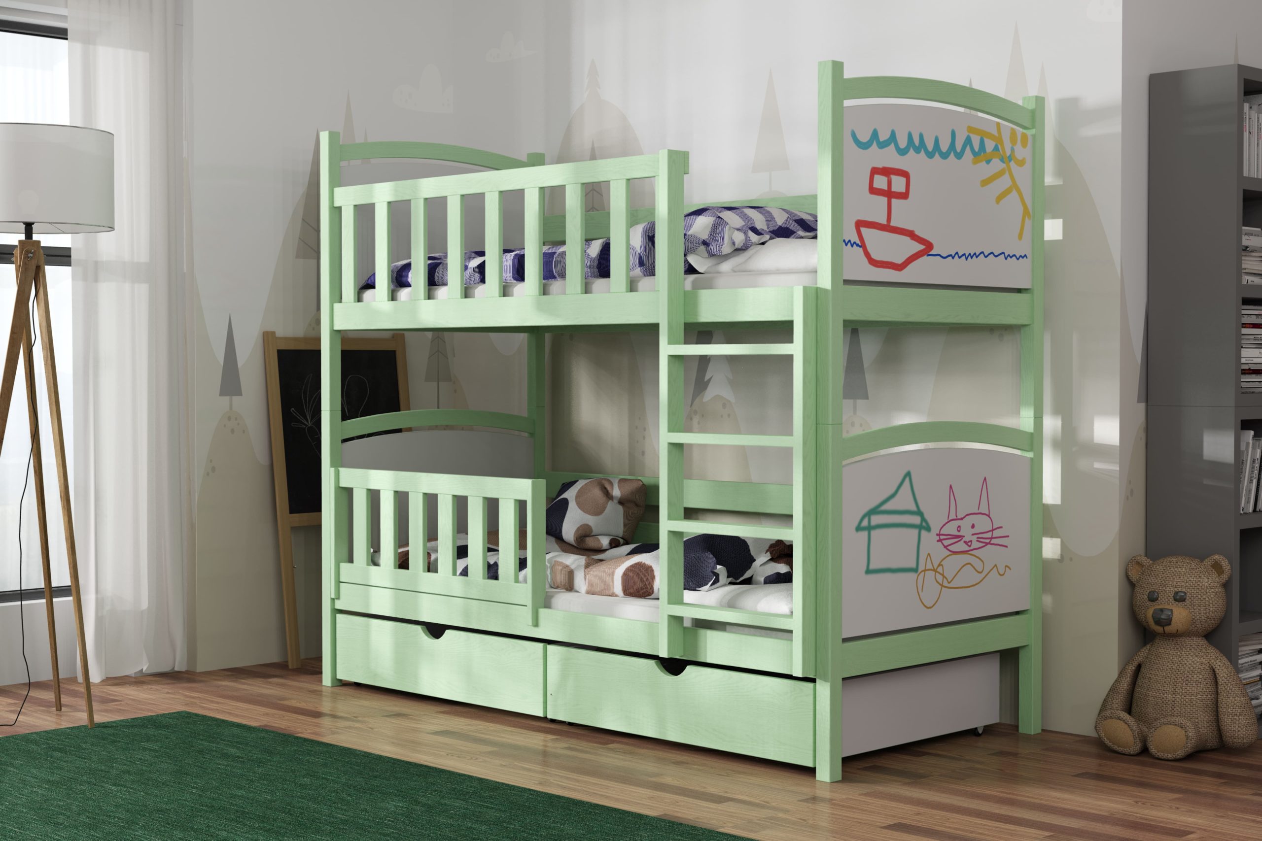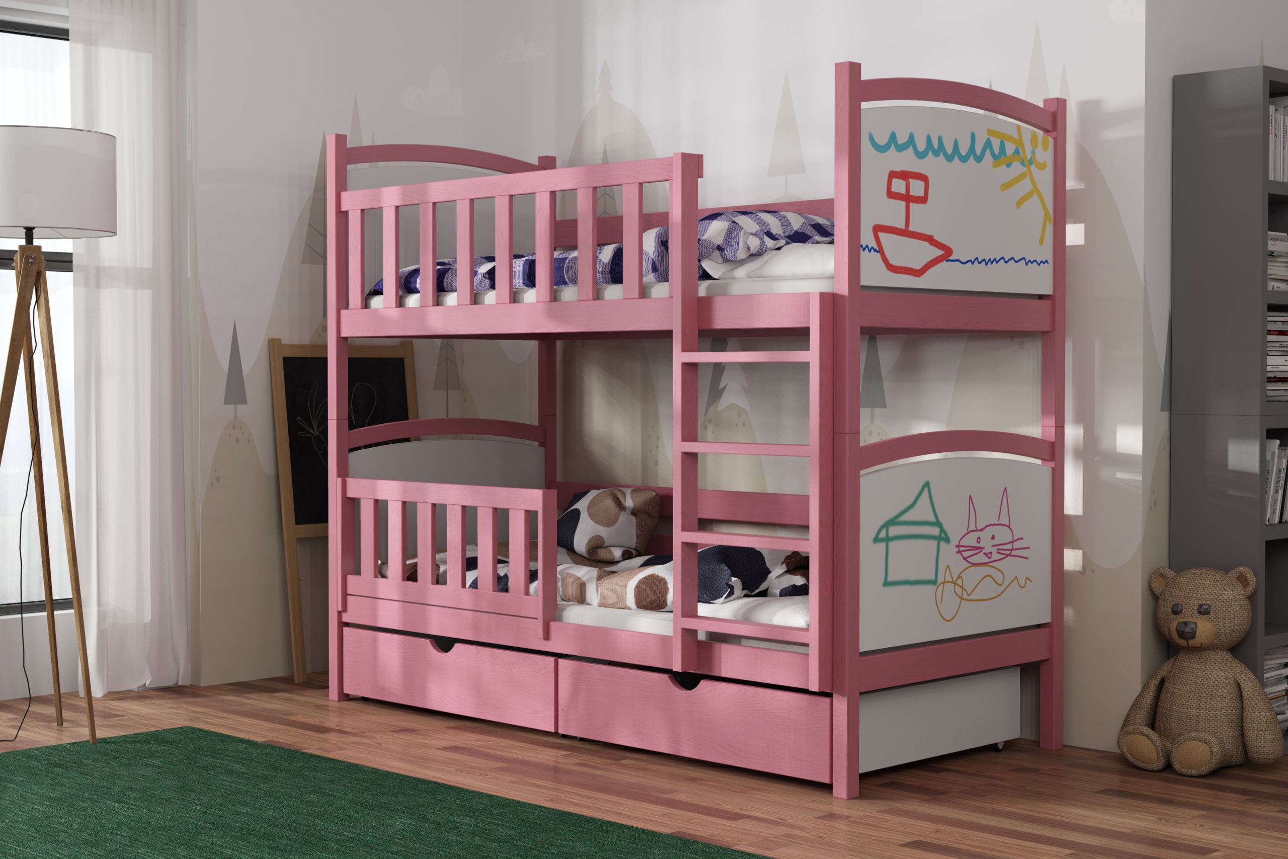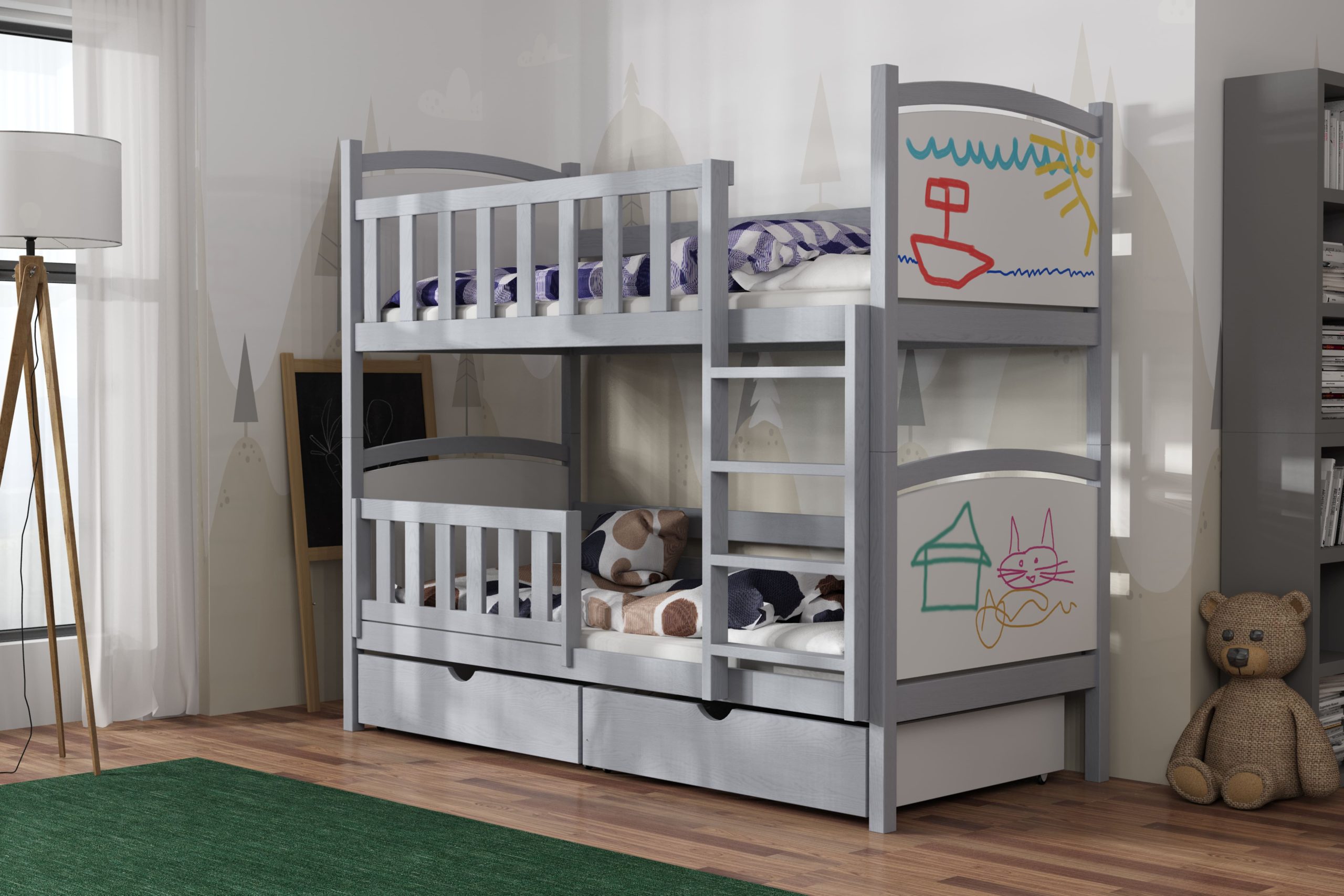 Łóżko piętrowe Bartuś z litego drewna sosnowego łączy stabilną konstrukcję, ochronne barierki i szeroką drabinkę z radosną grafiką zagłówków, zapewniając bezpieczny sen i mnóstwo zabawy.