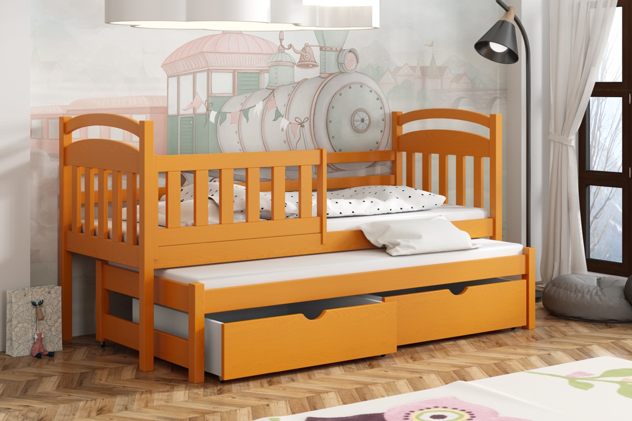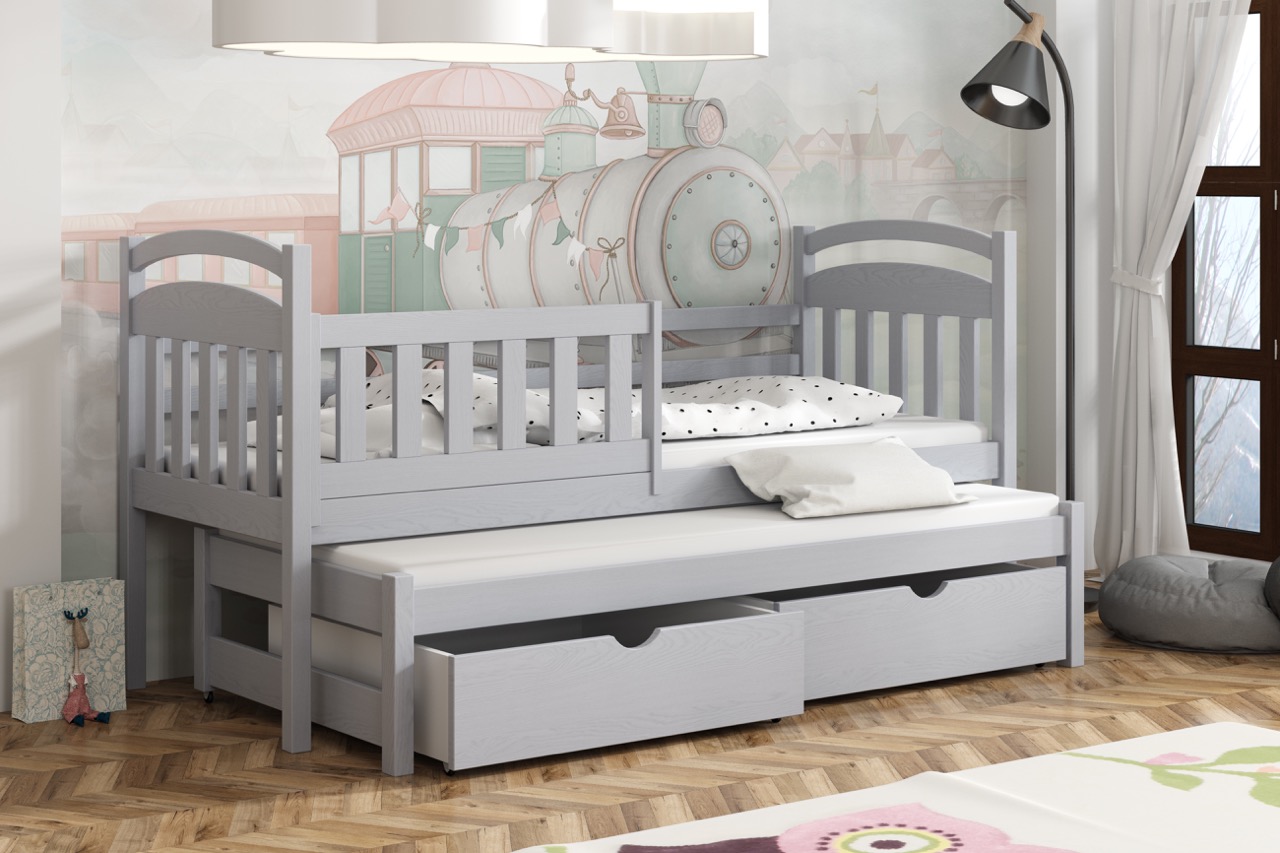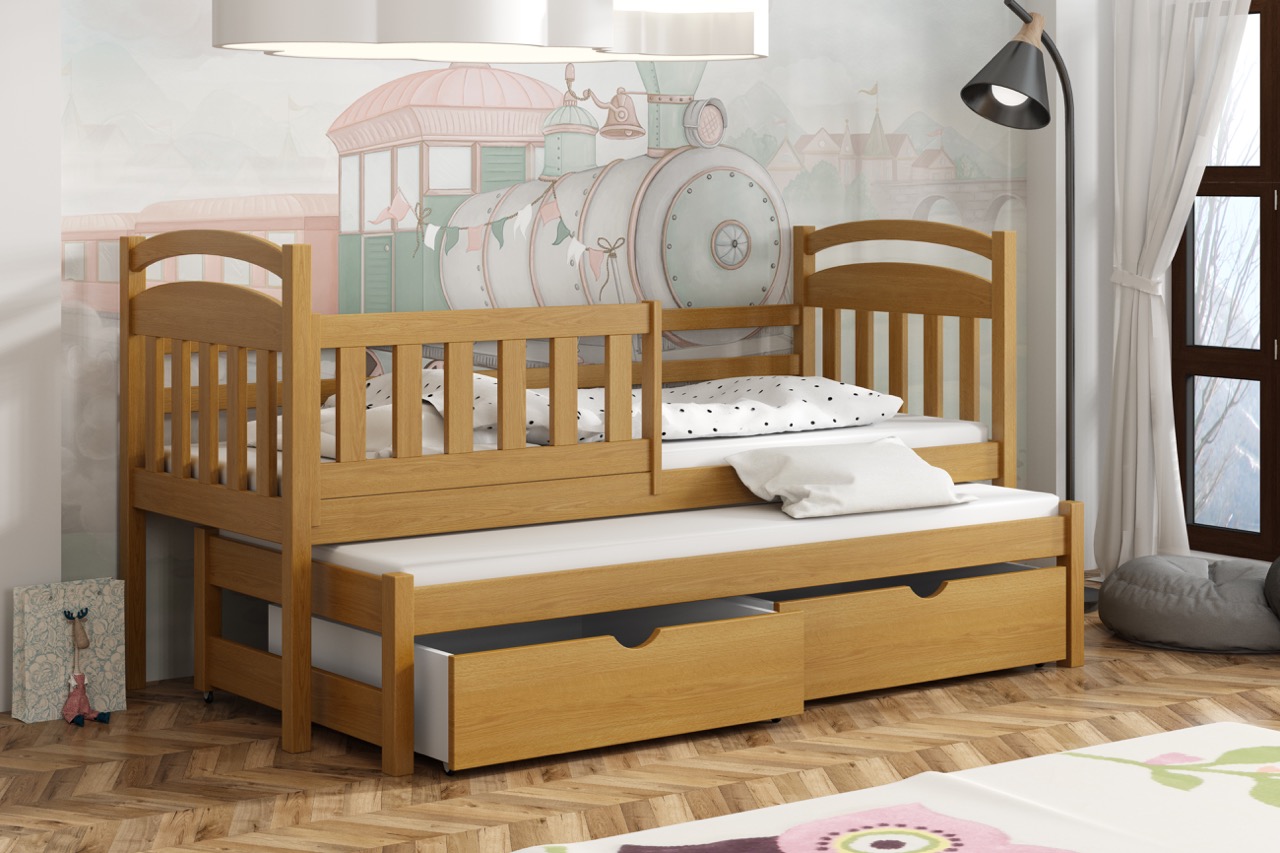 Łóżko Kacper to lekka, łukowo zaoblona konstrukcja z litego drewna sosnowego, wyposażona w wysuwane posłanie i pojemne szuflady, która oszczędza miejsce i zapewnia bezpieczny, komfortowy sen.