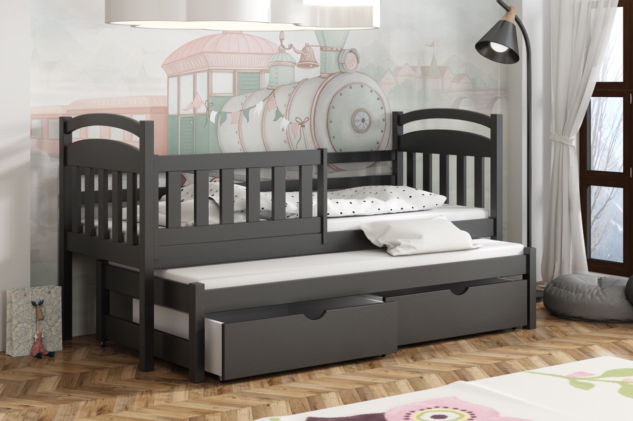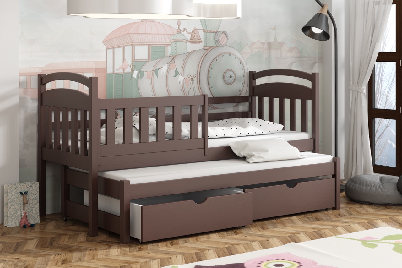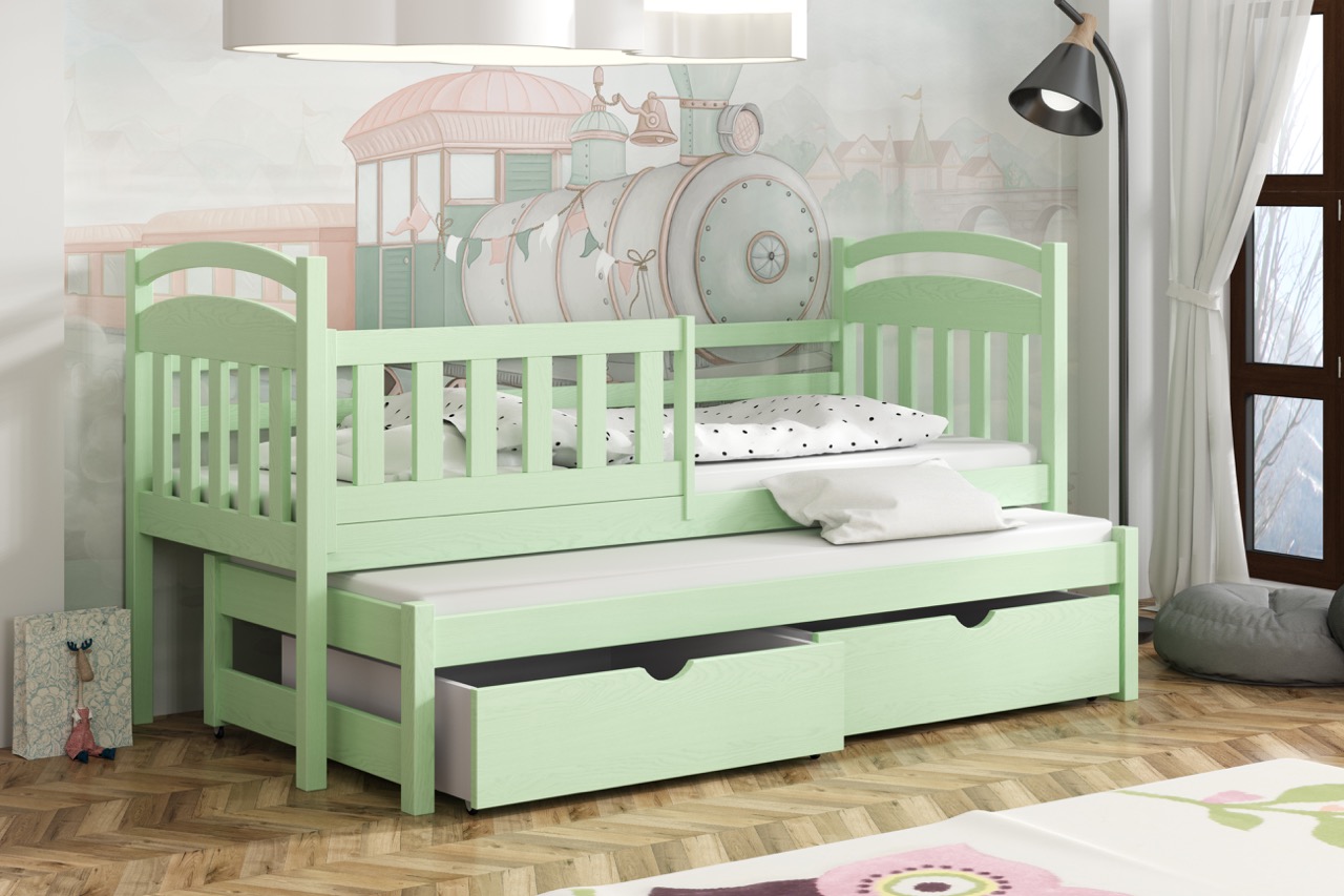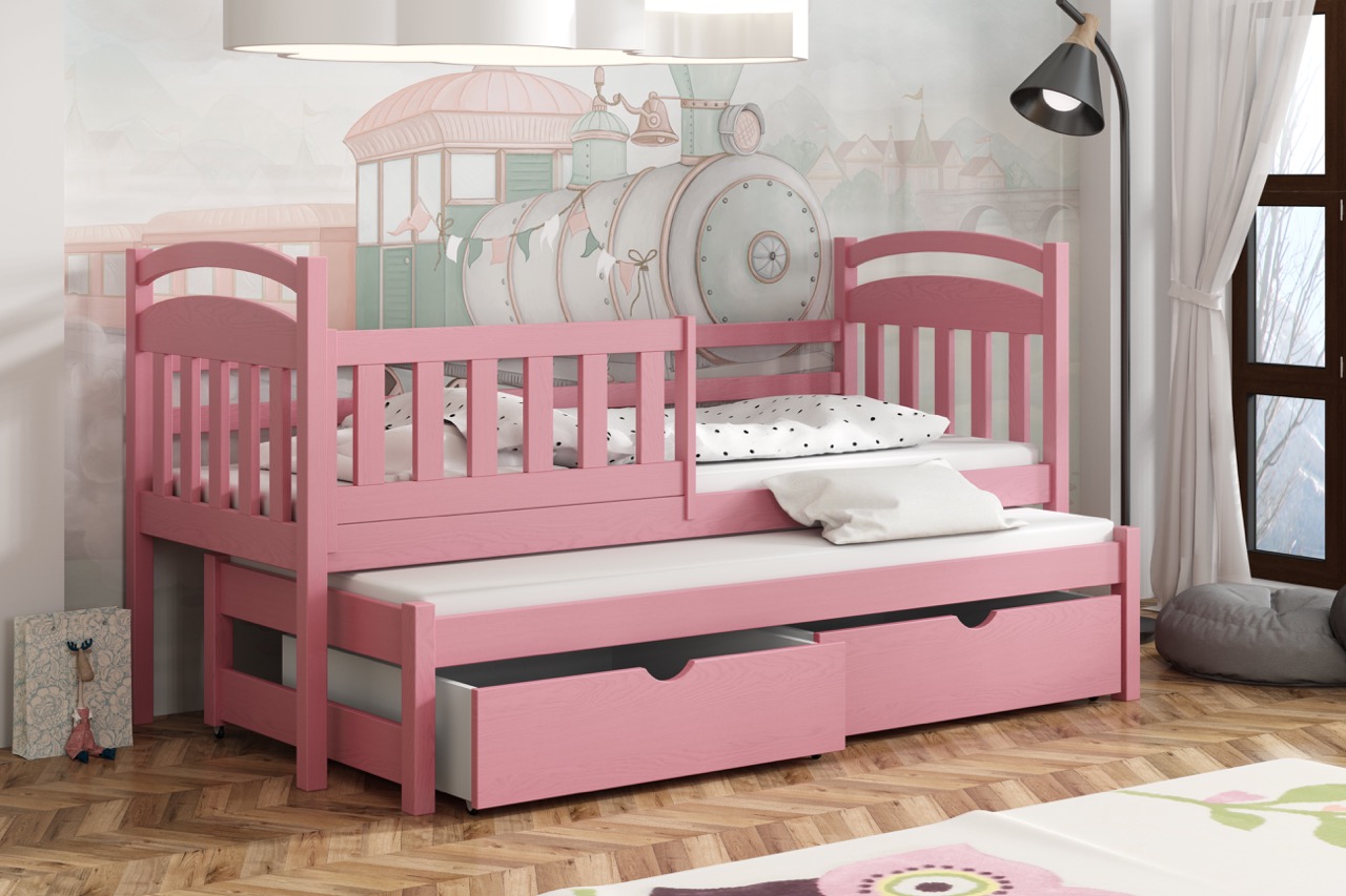 Łóżko Kacper to lekka, łukowo zaoblona konstrukcja z litego drewna sosnowego, wyposażona w wysuwane posłanie i pojemne szuflady, która oszczędza miejsce i zapewnia bezpieczny, komfortowy sen.