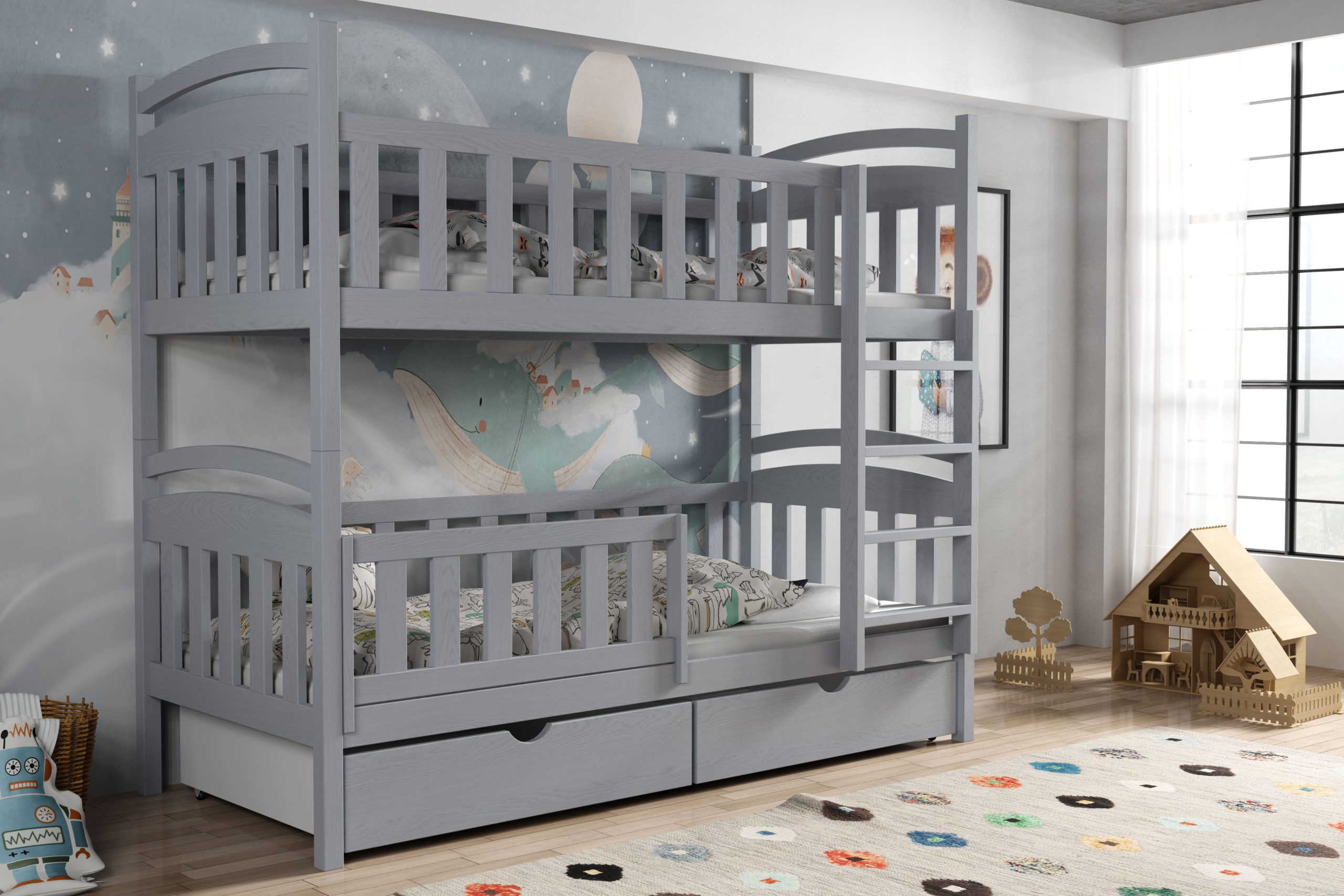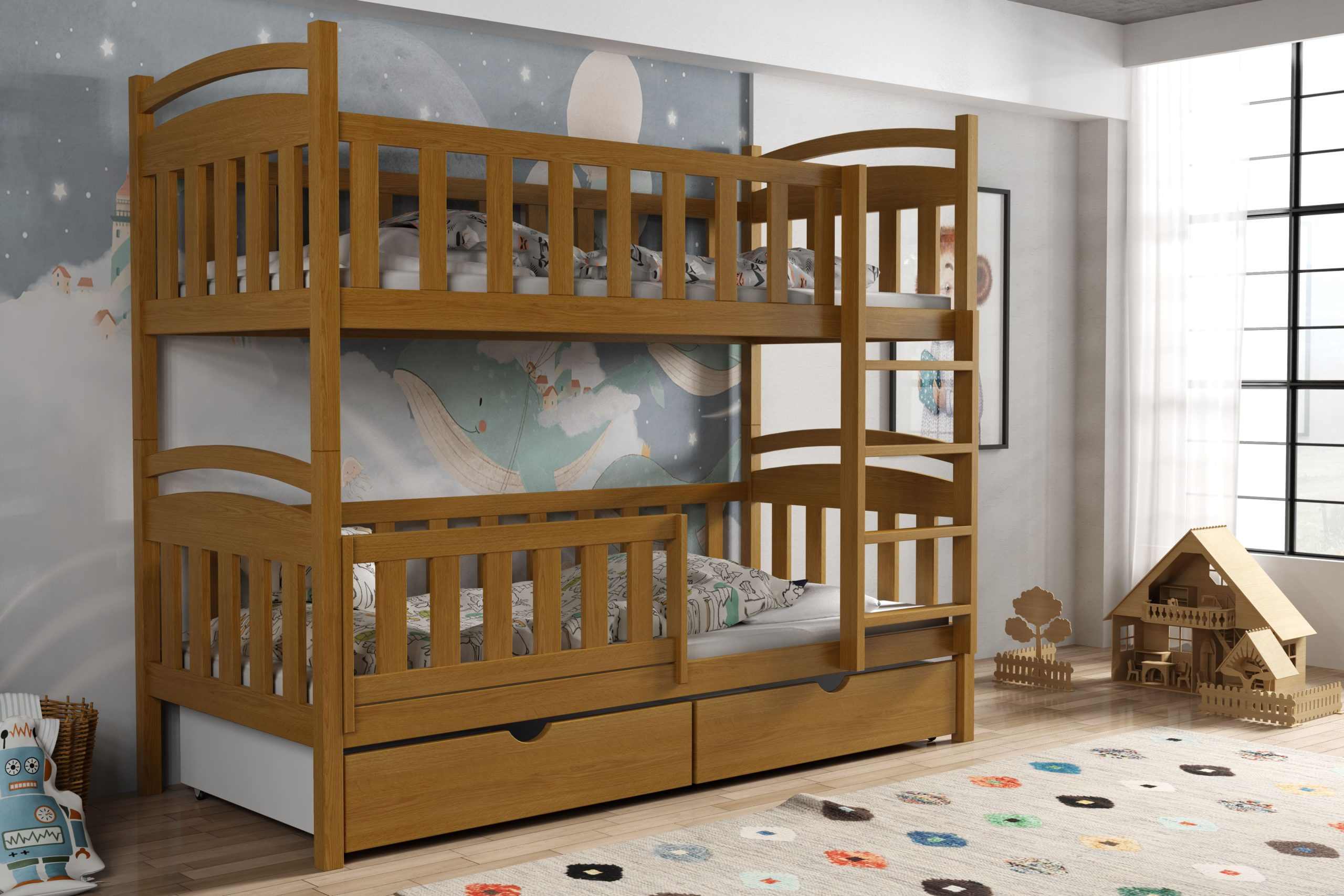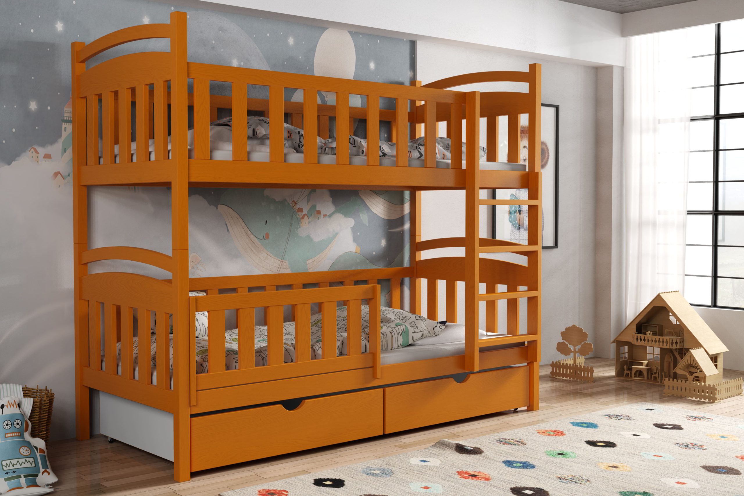 - Przeznaczenie: łóżko piętrowe dla dzieci – solidne, bezpieczne i funkcjonalne rozwiązanie do wspólnego pokoju rodzeństwa.