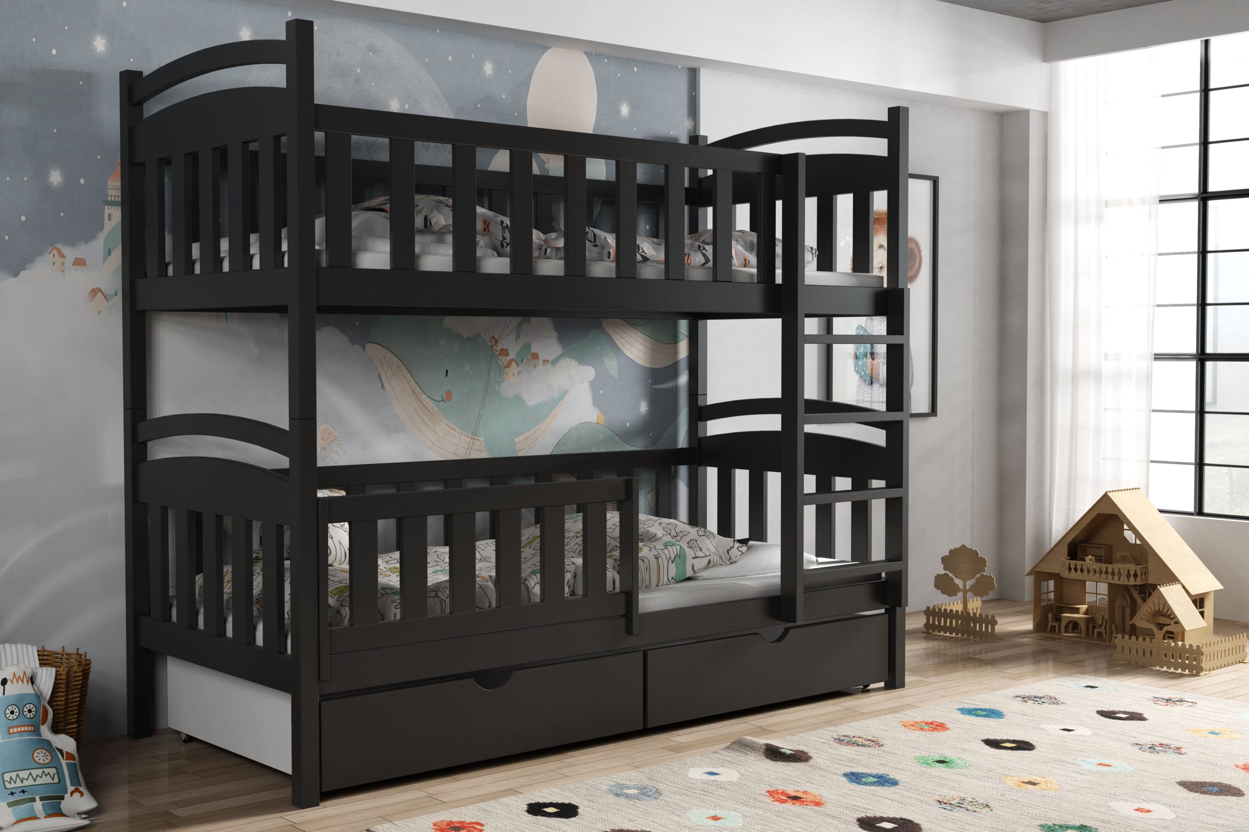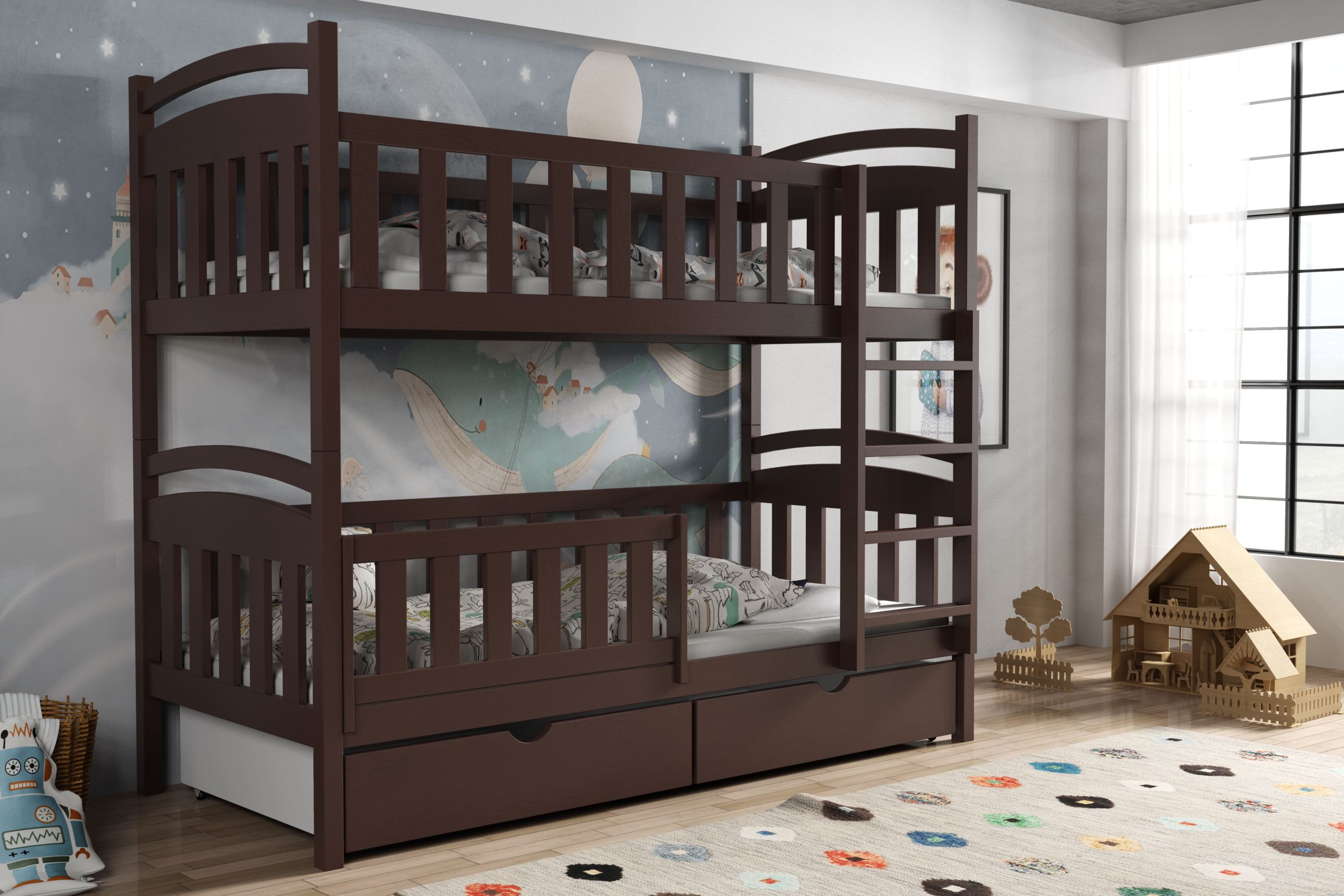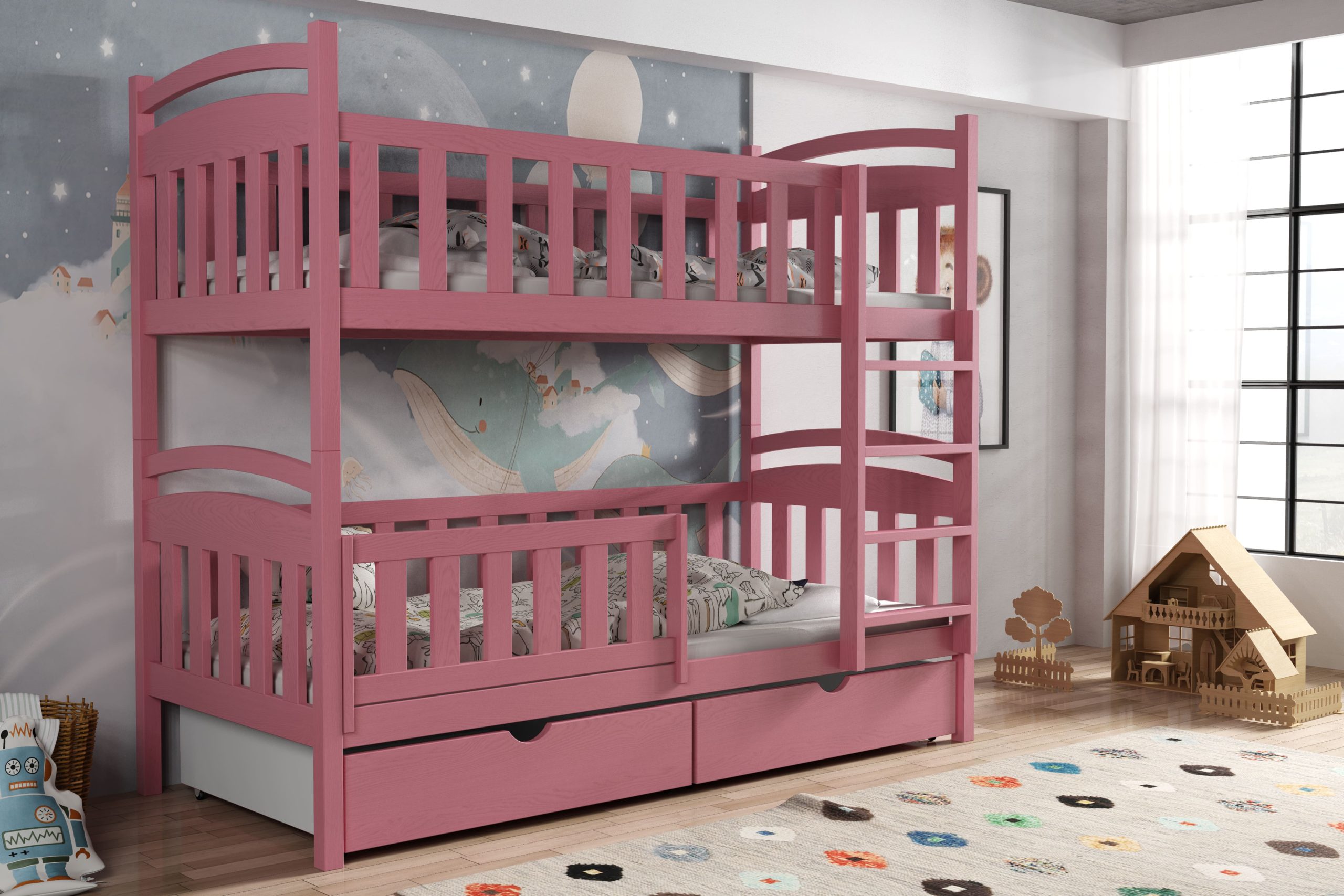 - Przeznaczenie: łóżko piętrowe dla dzieci – solidne, bezpieczne i funkcjonalne rozwiązanie do wspólnego pokoju rodzeństwa.