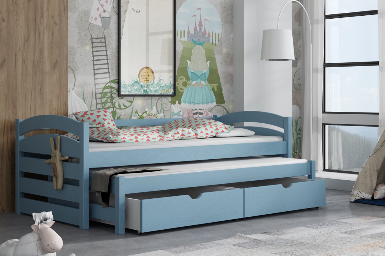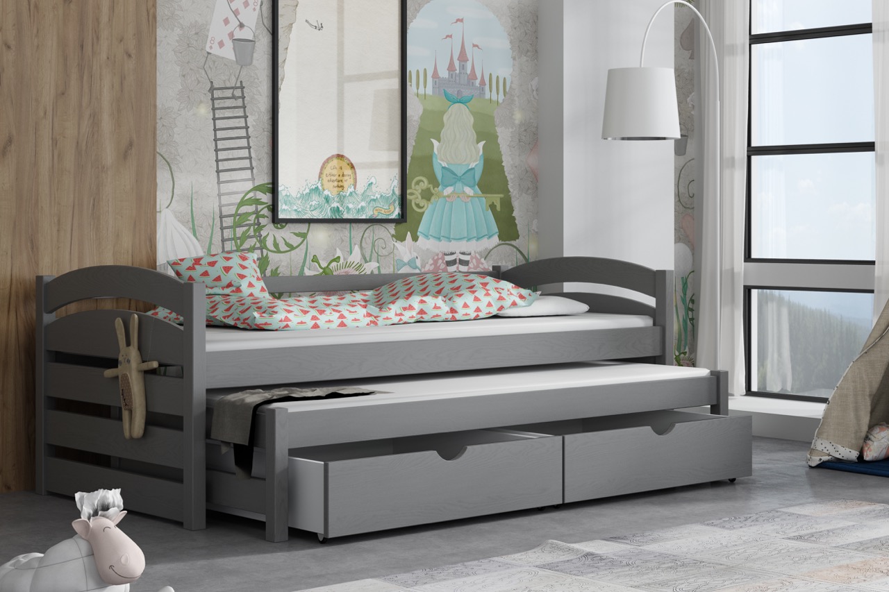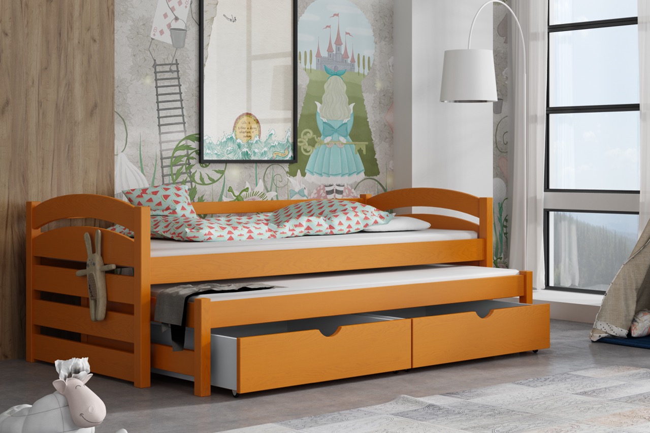 Łóżko Monika to praktyczne i stylowe rozwiązanie 2-w-1: pojedyncze łóżko z wysuwaną częścią do drugiego spania oraz dwiema pojemnymi szufladami, łączące estetykę z funkcjonalnością.