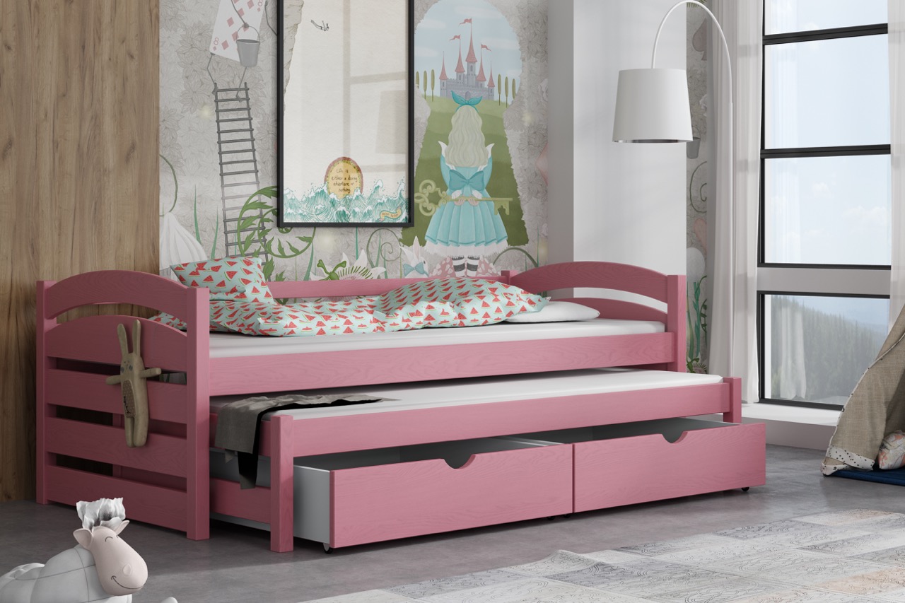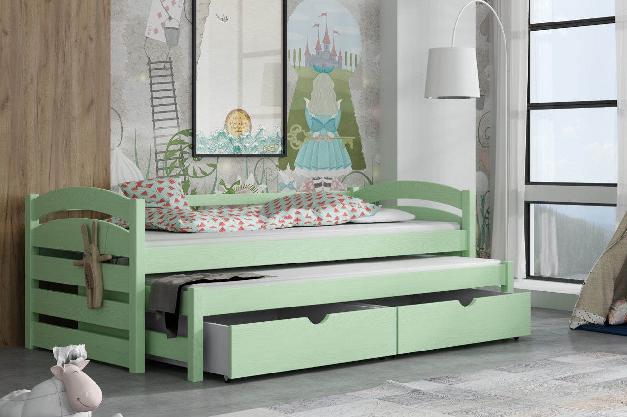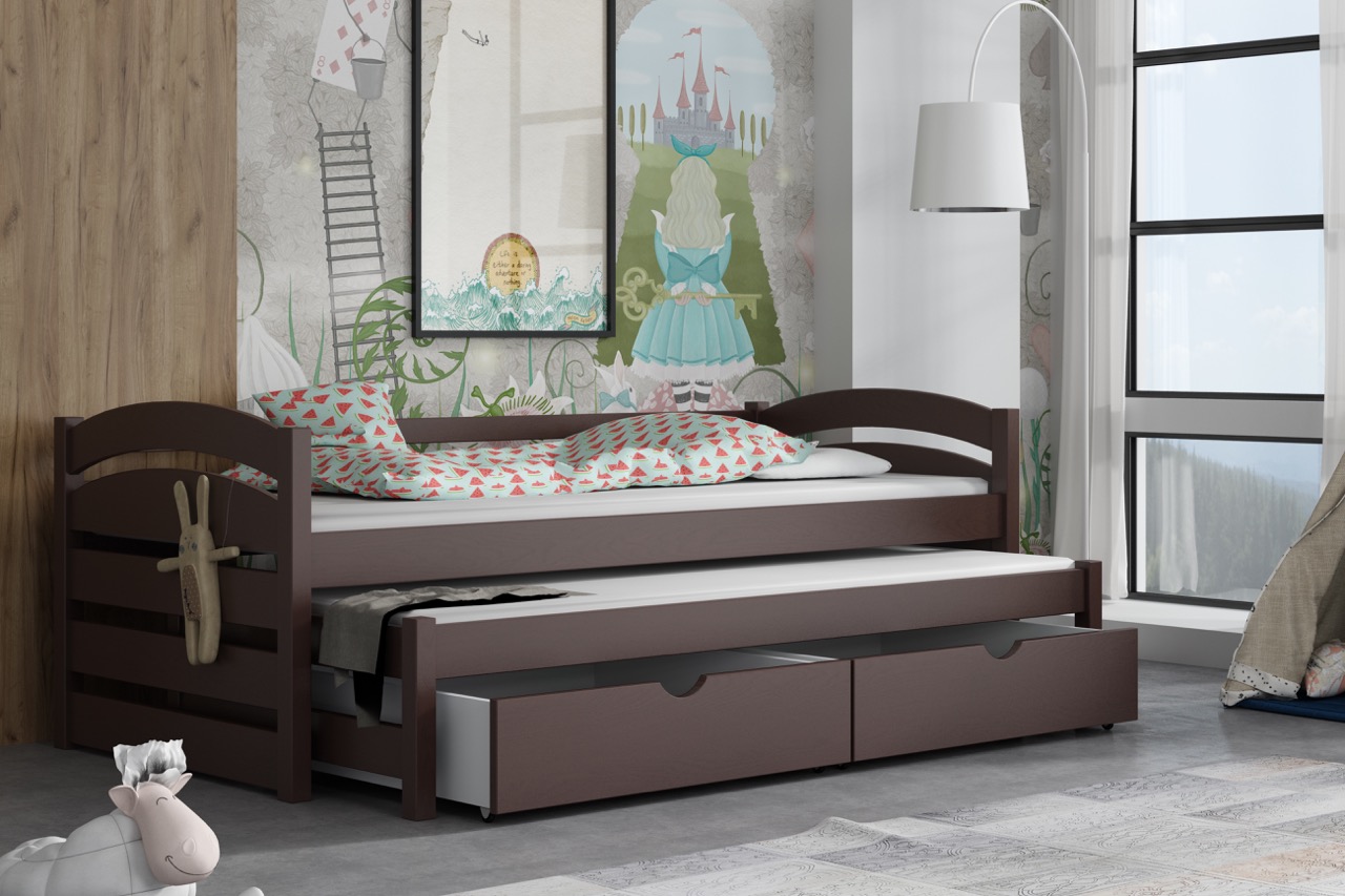 Łóżko Monika to praktyczne i stylowe rozwiązanie 2-w-1: pojedyncze łóżko z wysuwaną częścią do drugiego spania oraz dwiema pojemnymi szufladami, łączące estetykę z funkcjonalnością.
