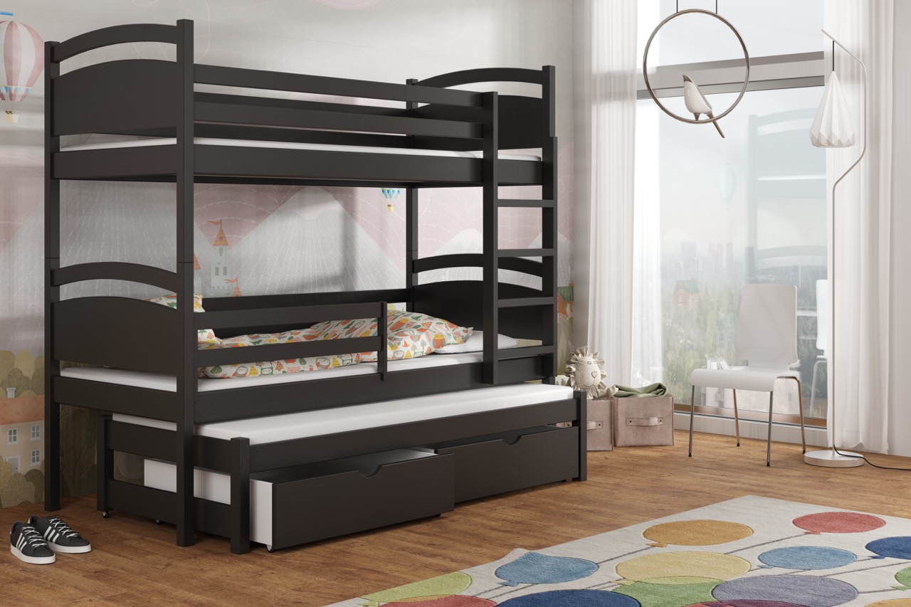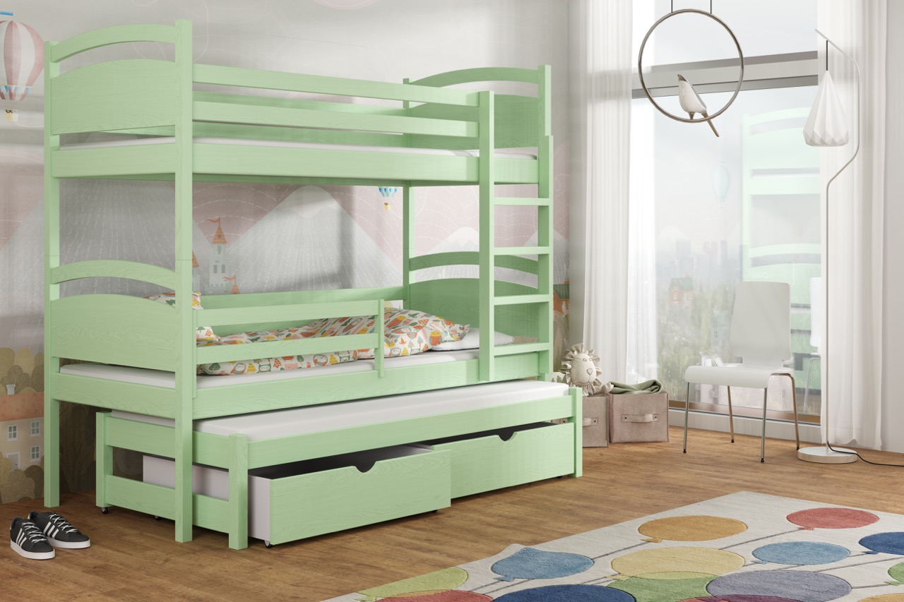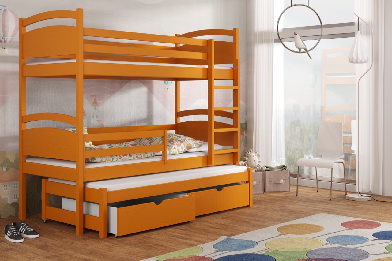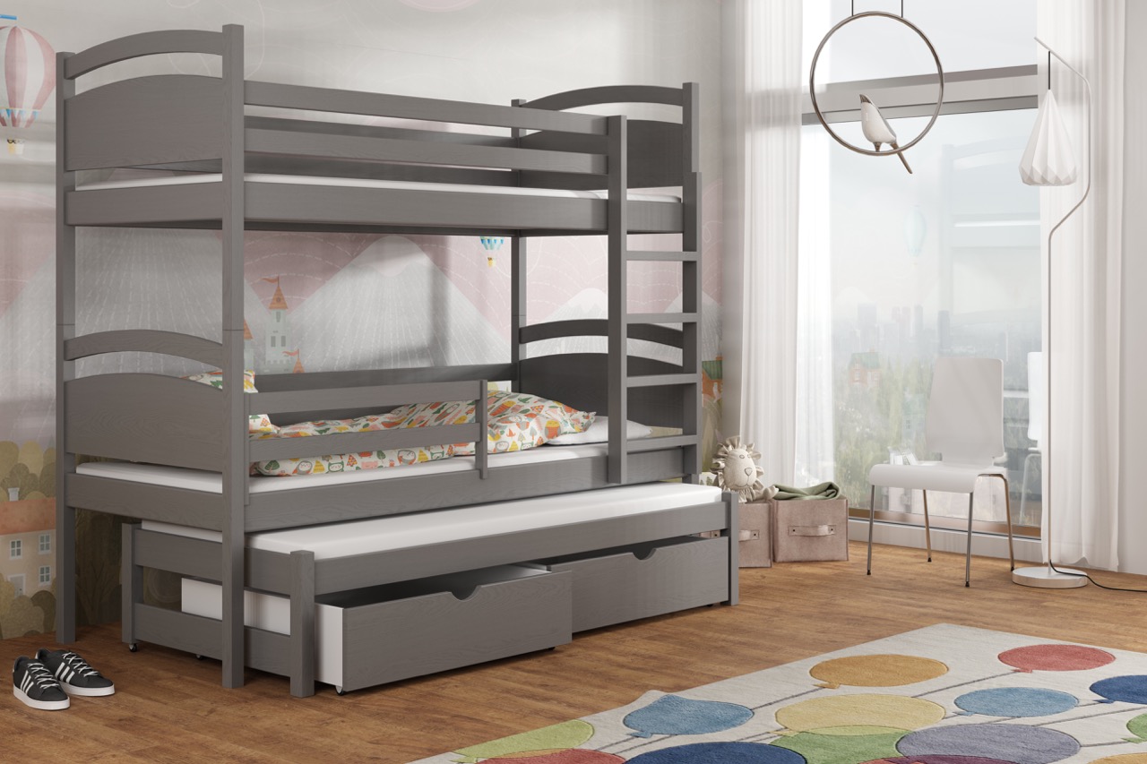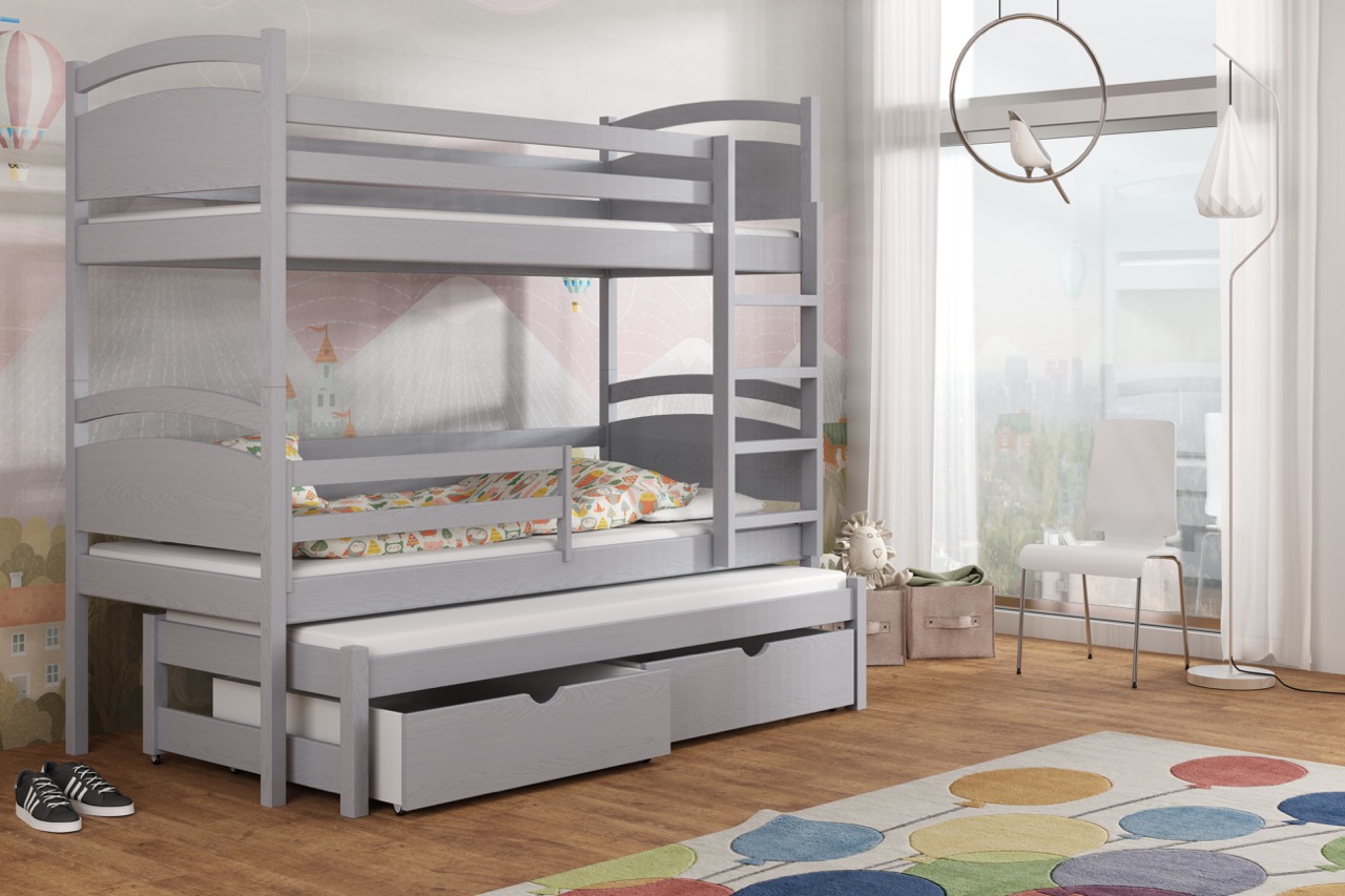 Łóżko potrójne Oliwia to przestronna, sosnowa konstrukcja z wysuwaną częścią do trzech materacy, zaokrąglonymi zagłówkami, szeroką drabinką i dwiema pojemnymi szufladami, łącząca minimalistyczny design z maksymalną funkcjonalnością.