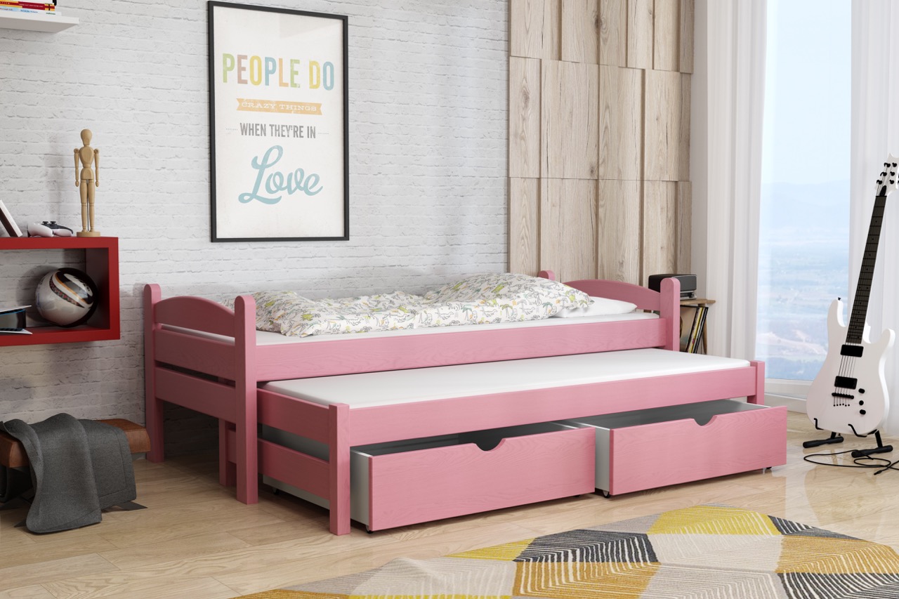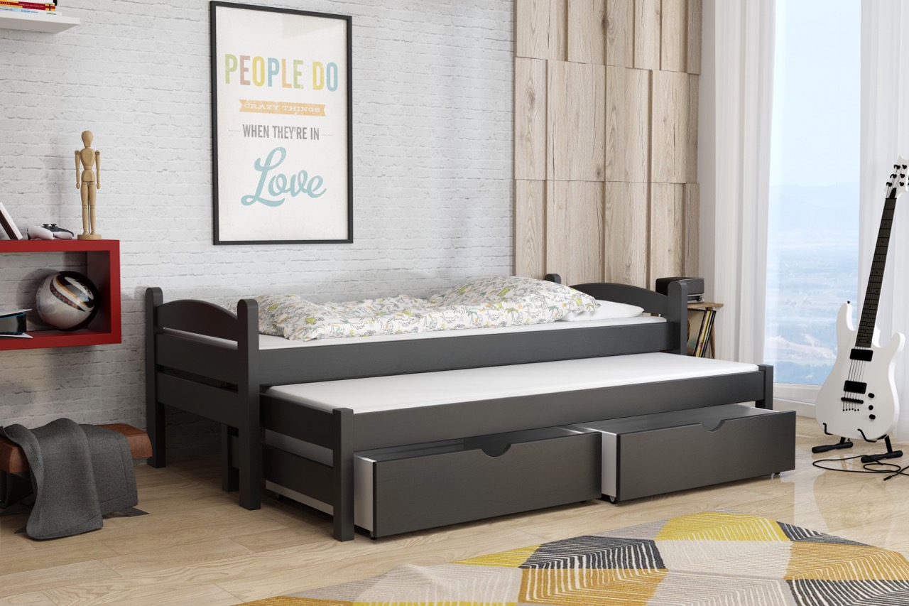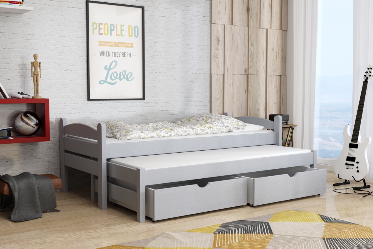Łóżko podwójne Patrycja to lekka, minimalistyczna konstrukcja z wysuwaną częścią i pojemnymi szufladami, która oszczędza miejsce i zapewnia komfortowy sen rodzeństwu lub gościom.