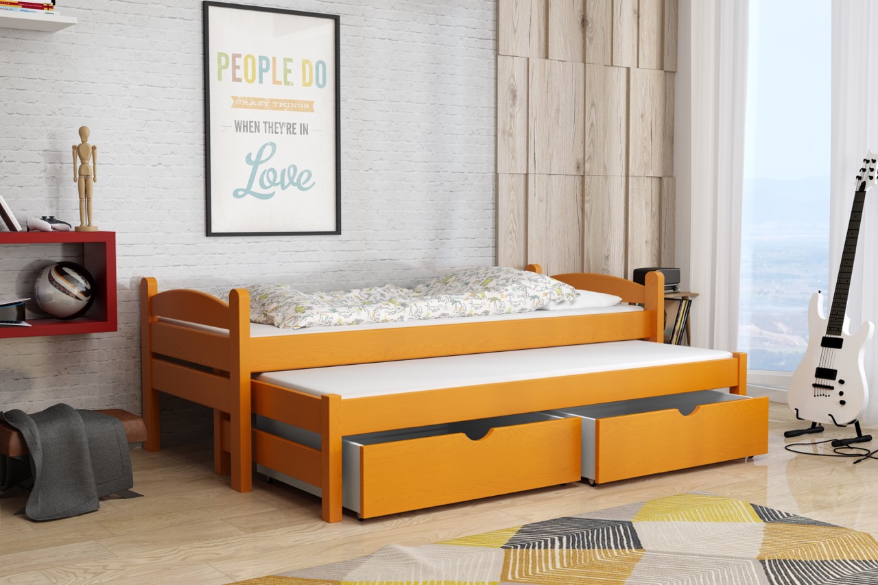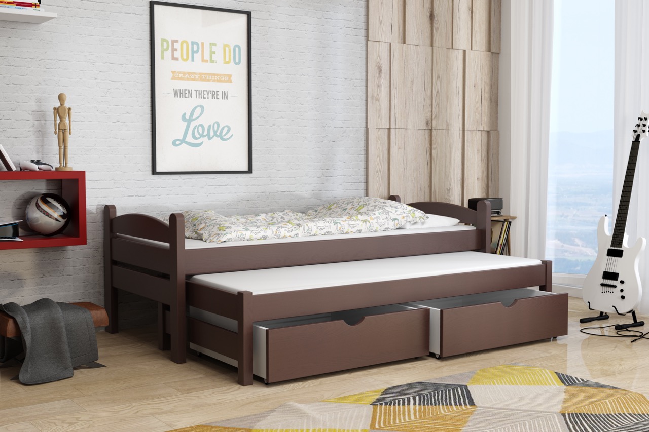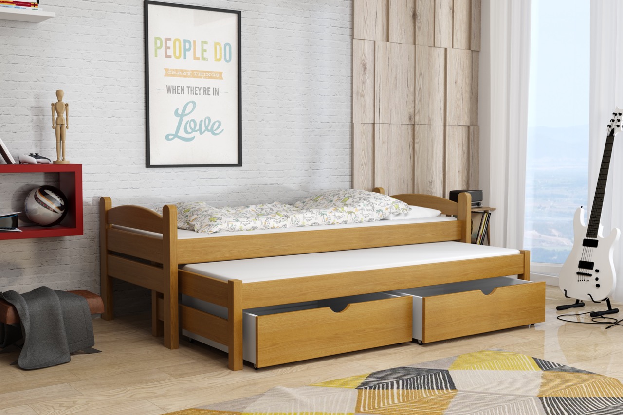 Łóżko podwójne Patrycja to lekka, minimalistyczna konstrukcja z wysuwaną częścią i pojemnymi szufladami, która oszczędza miejsce i zapewnia komfortowy sen rodzeństwu lub gościom.