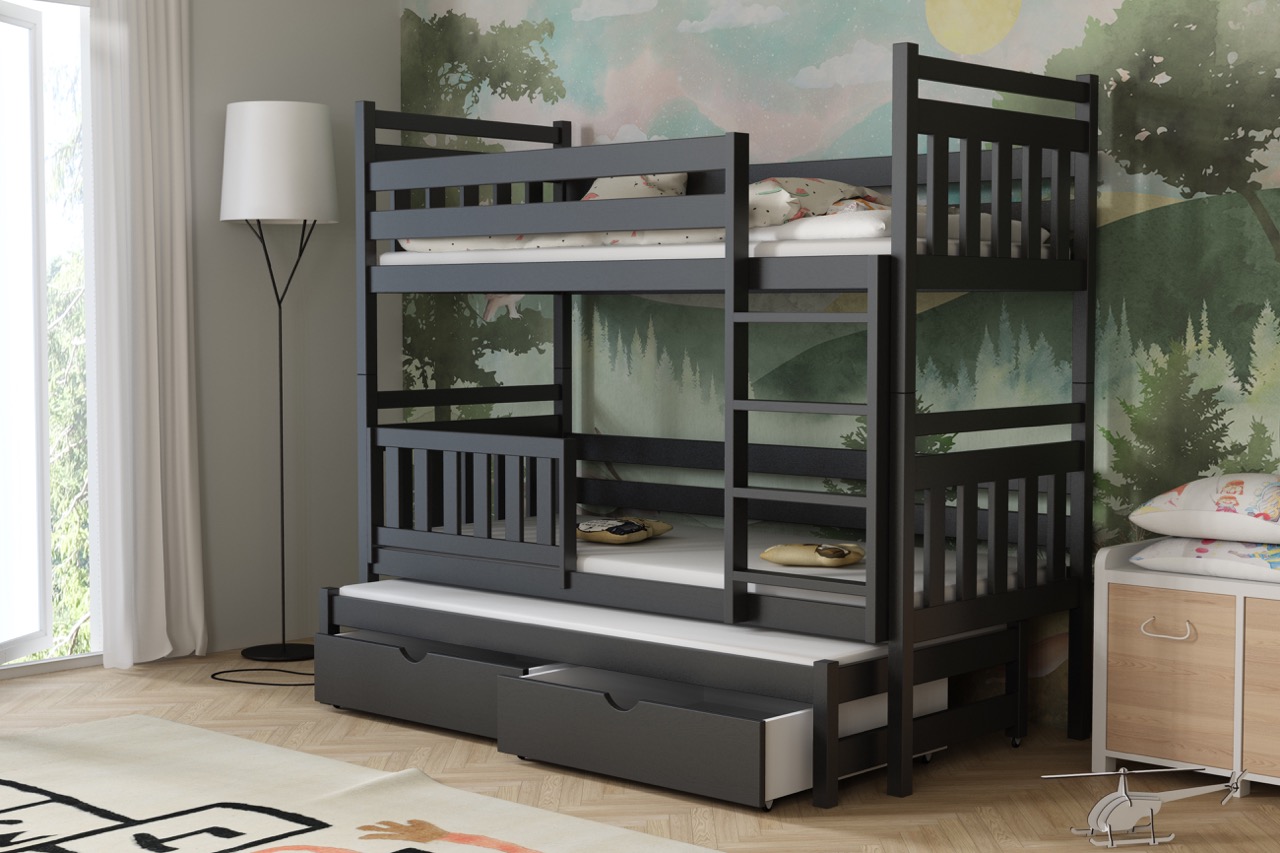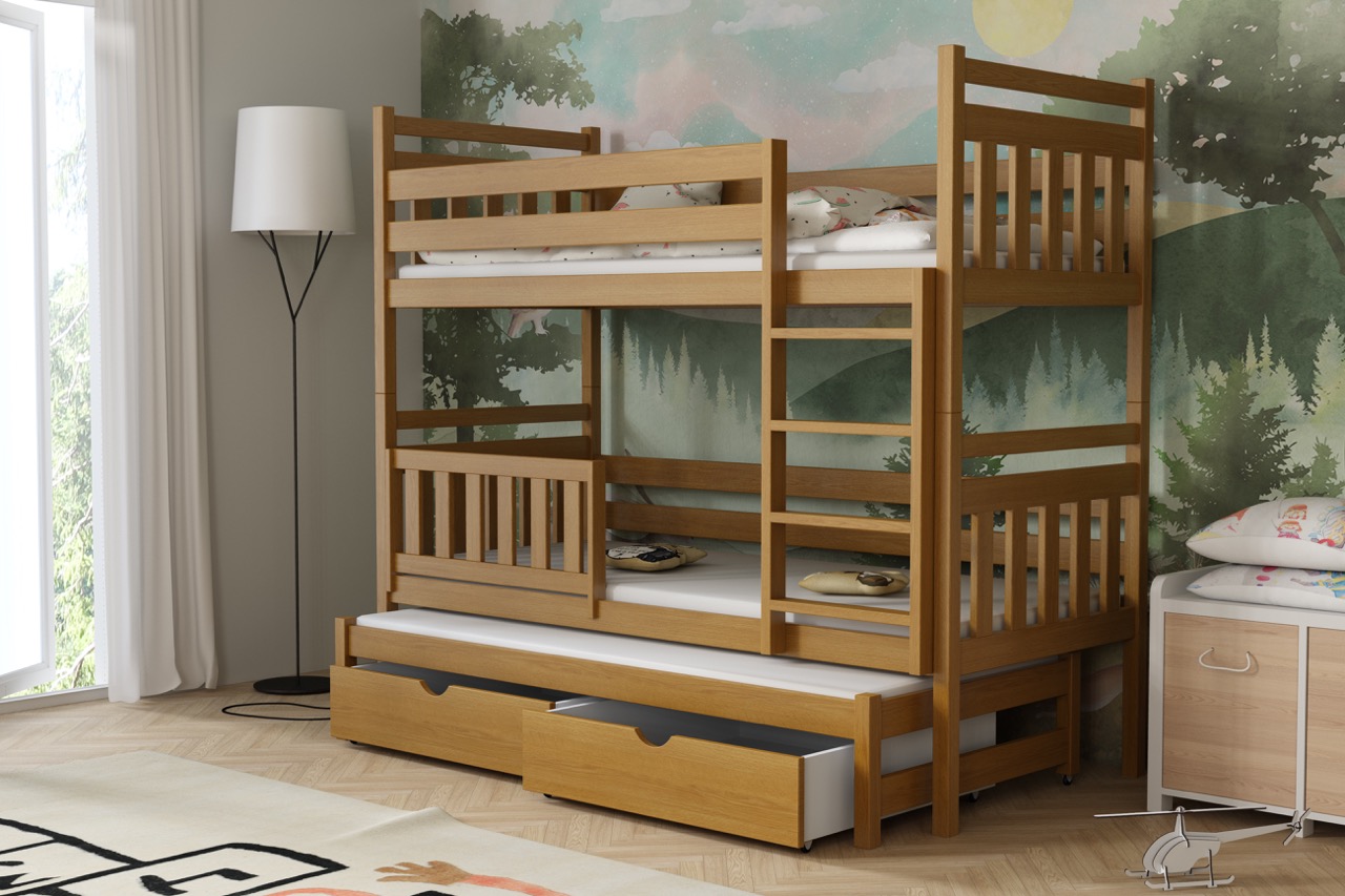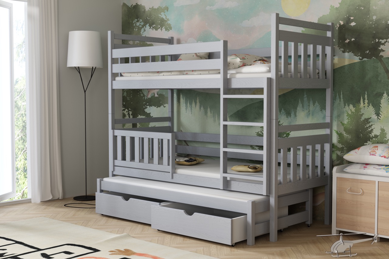 Łóżko potrójne Piotr to praktyczne i stylowe rozwiązanie, które zapewnia wygodne miejsce do spania dla trzech osób, oszczędzając przy tym przestrzeń w pokoju dziecięcym.