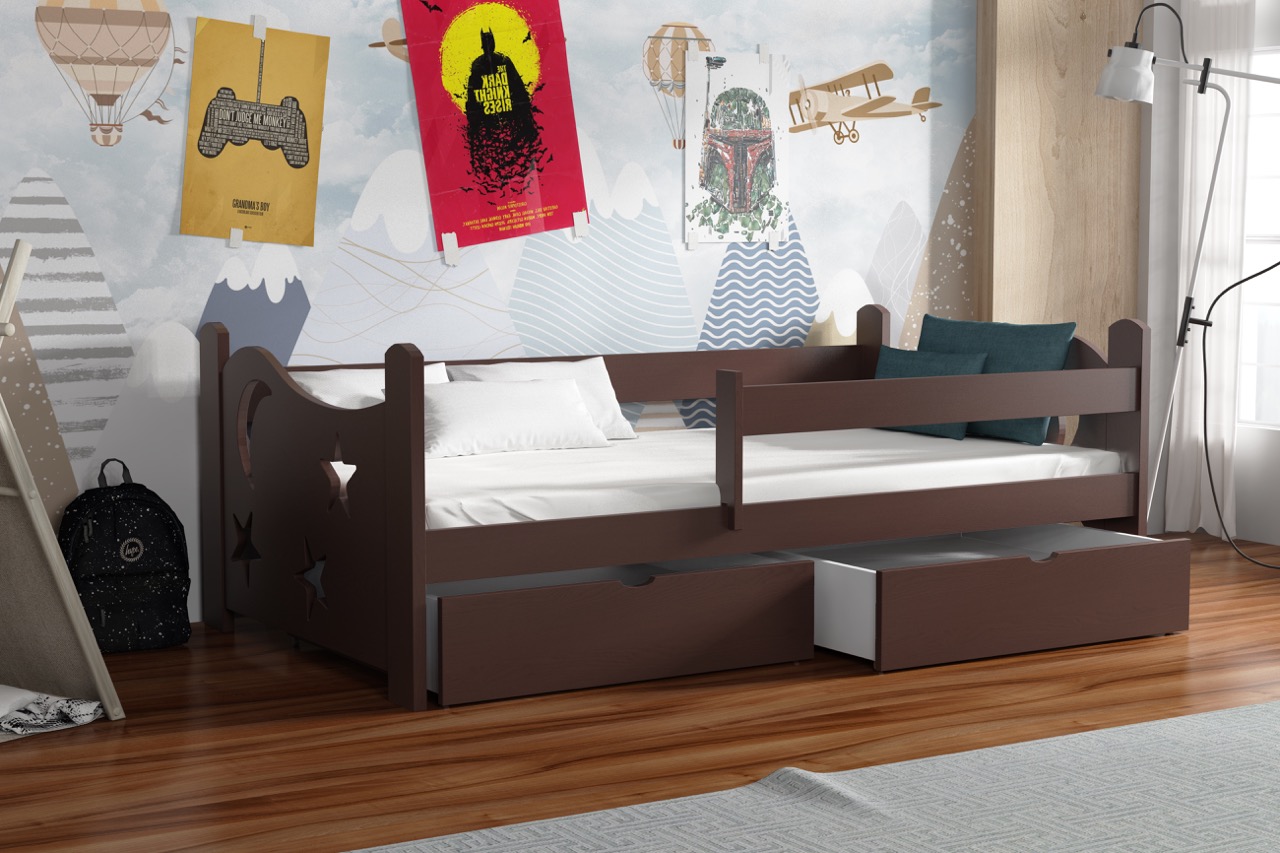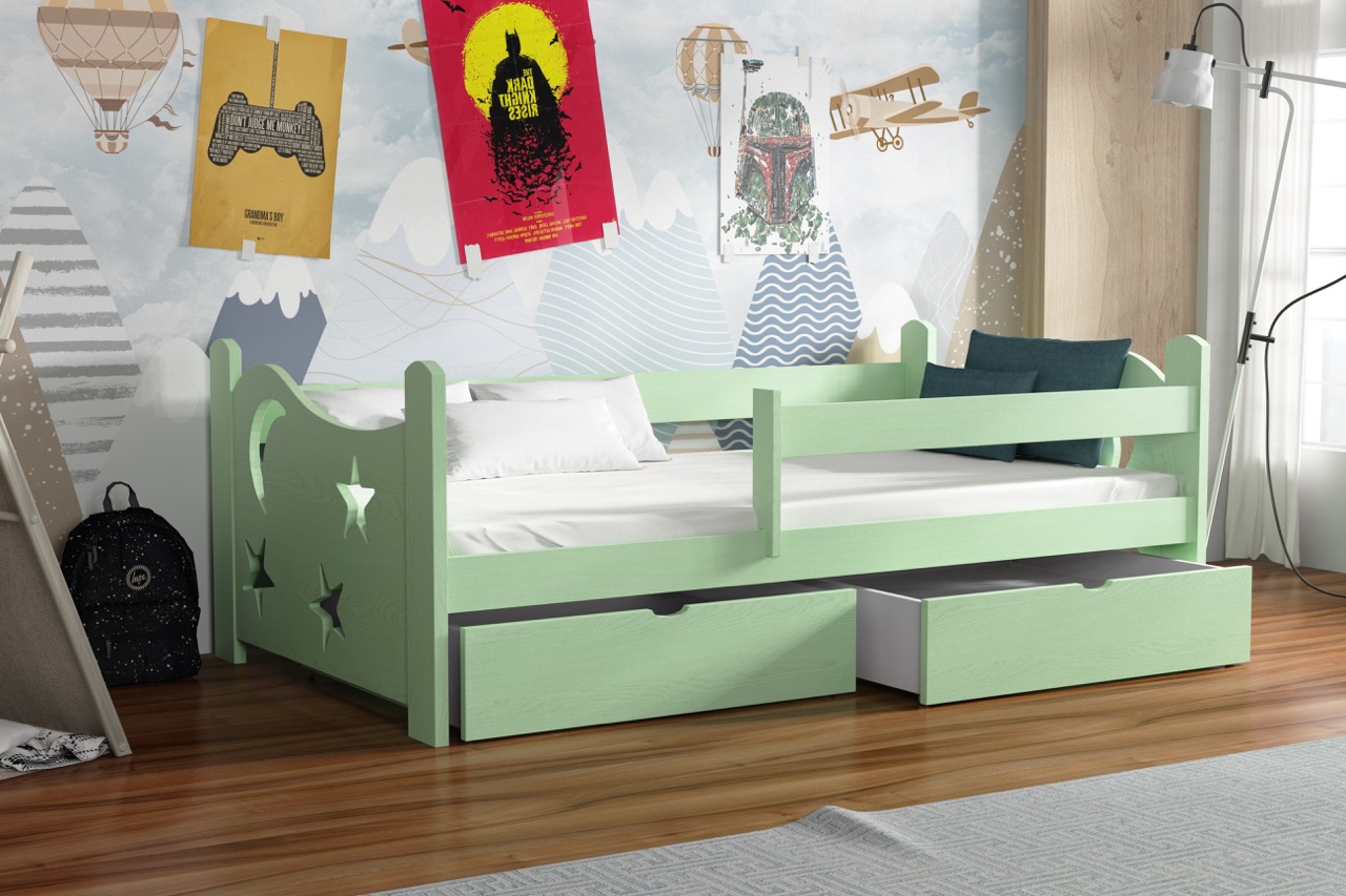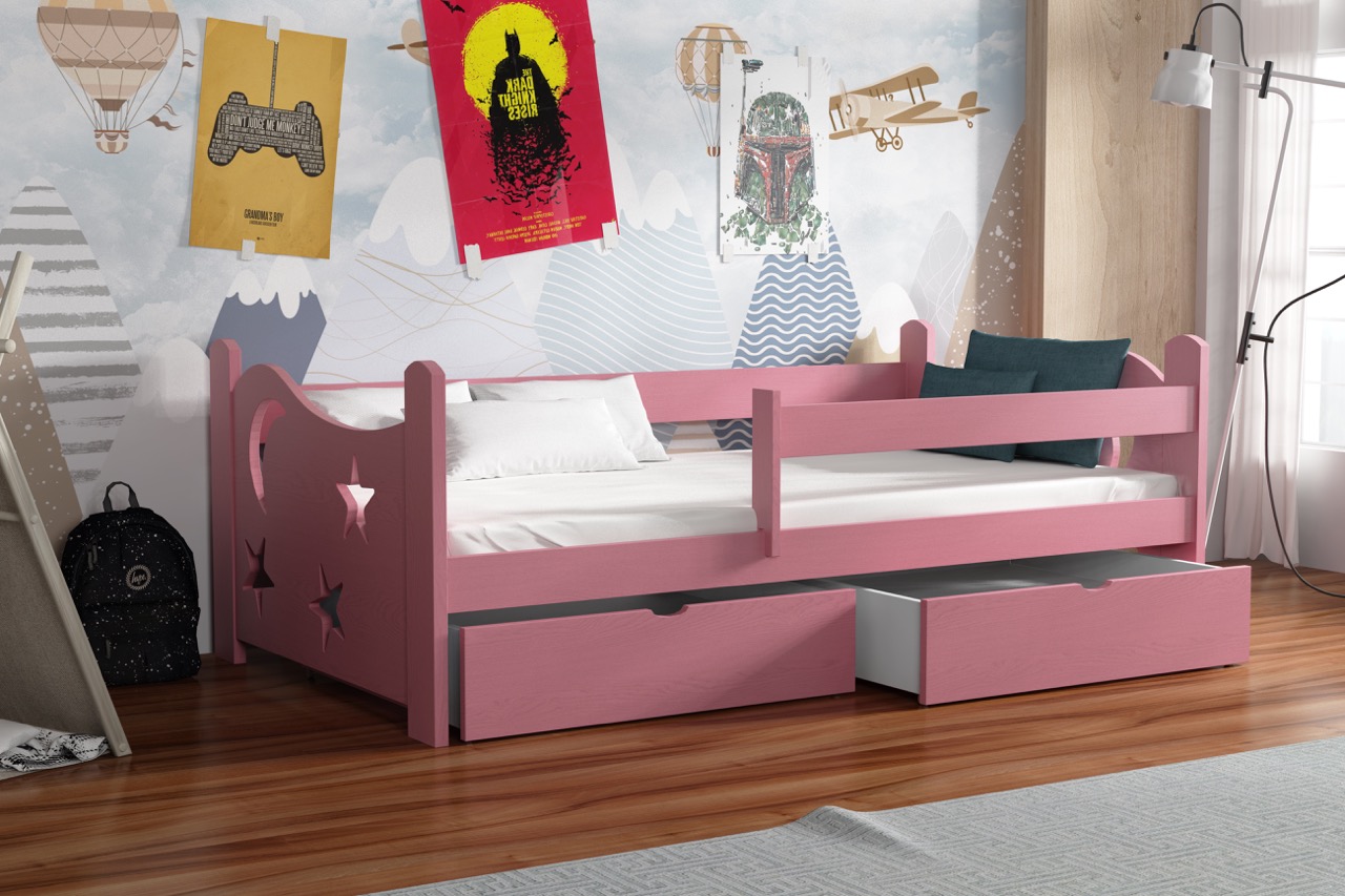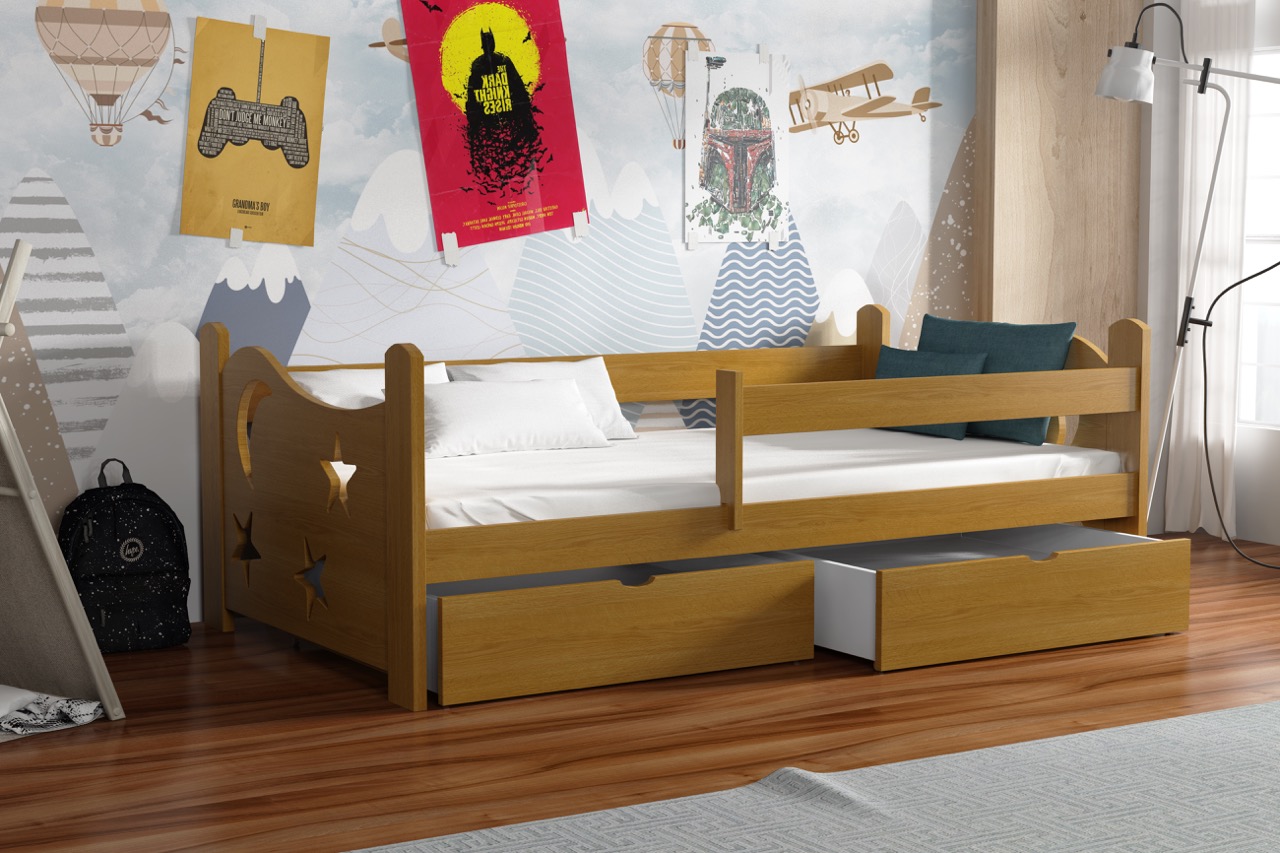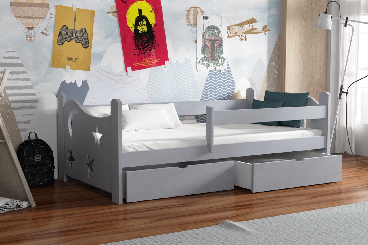 Łóżko pojedyncze Stars przeniesie Twoje dziecko w kosmiczny świat dzięki dekoracyjnym wycięciom w kształcie księżyca i gwiazd, a solidna konstrukcja z litej sosny i pojemne szuflady zapewnią komfort snu i funkcjonalne przechowywanie.