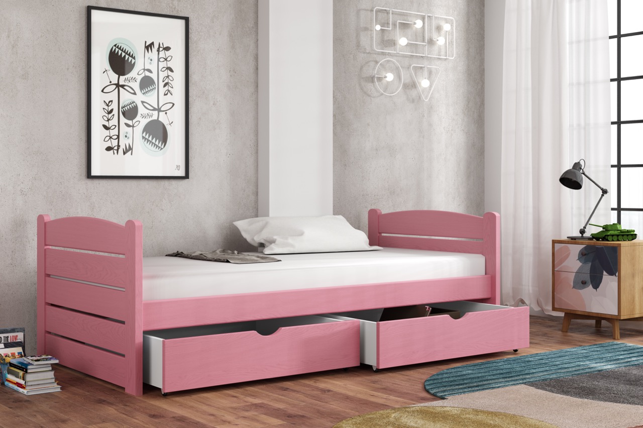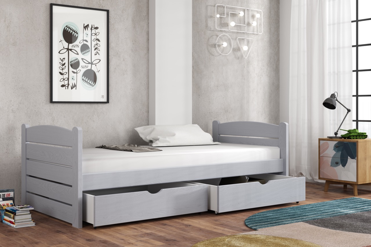 Łóżko Ula to subtelne, dziewczęce łóżko pojedyncze z zaokrąglonymi zagłówkami i solidną drewnianą konstrukcją, które zapewnia bezpieczny i komfortowy sen oraz elegancki, minimalistyczny wygląd.