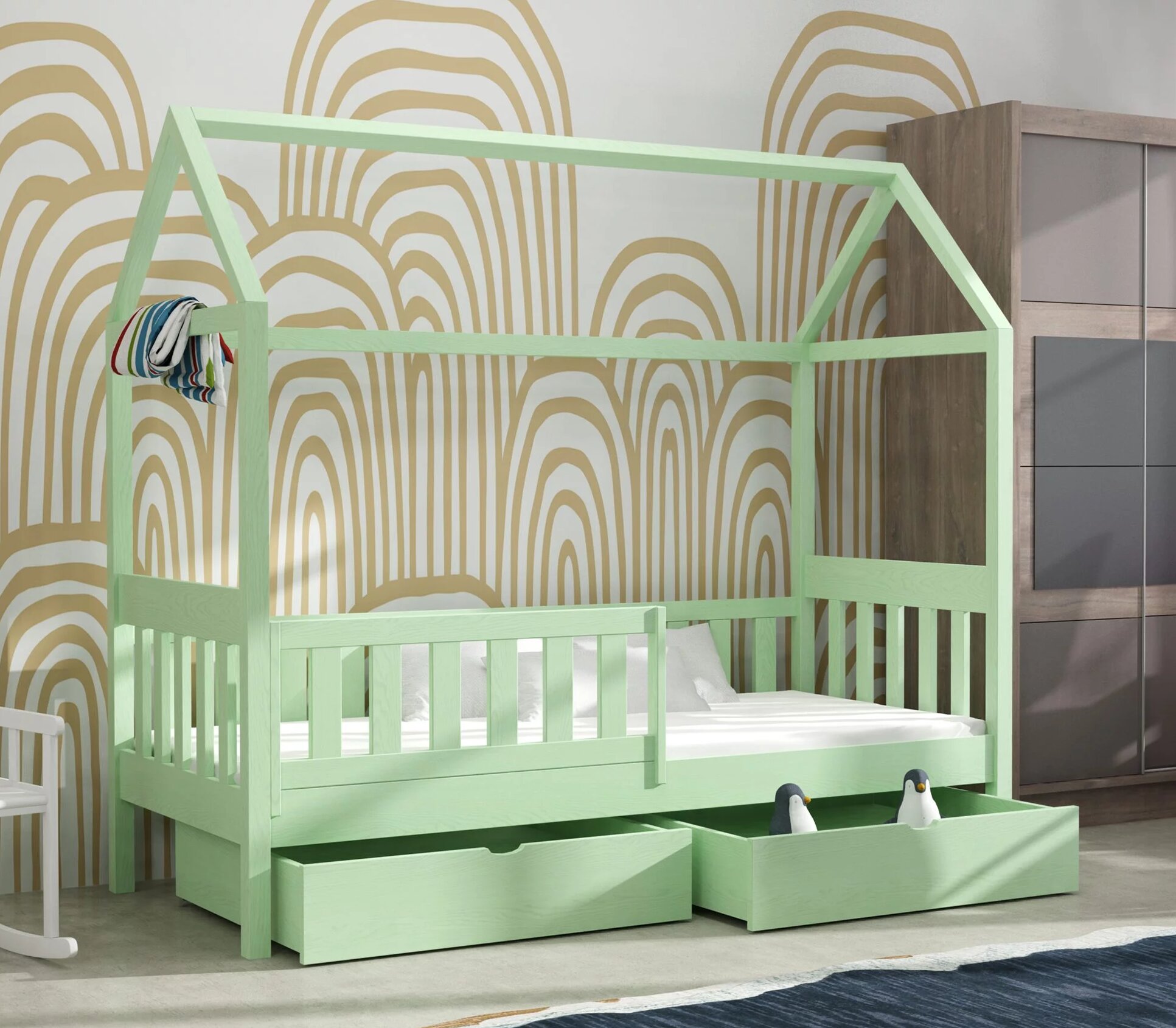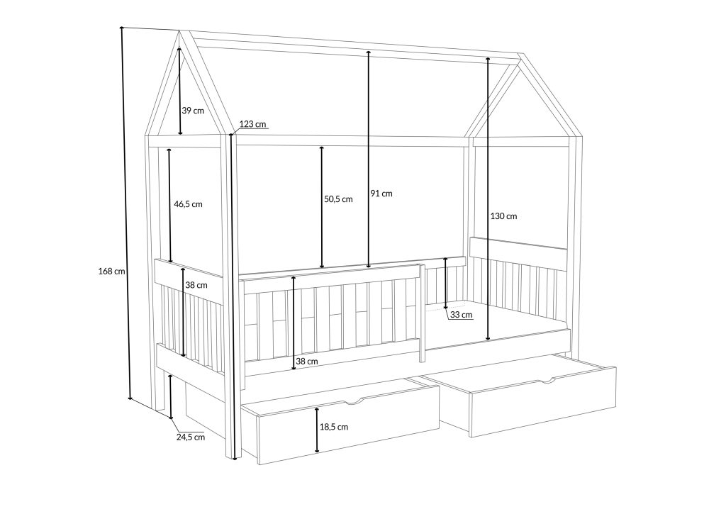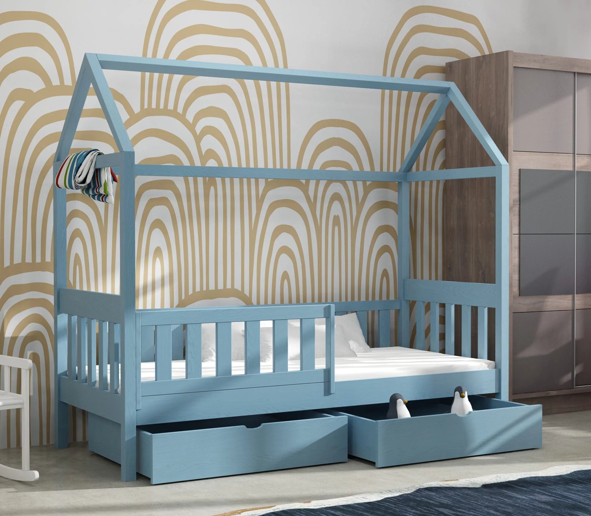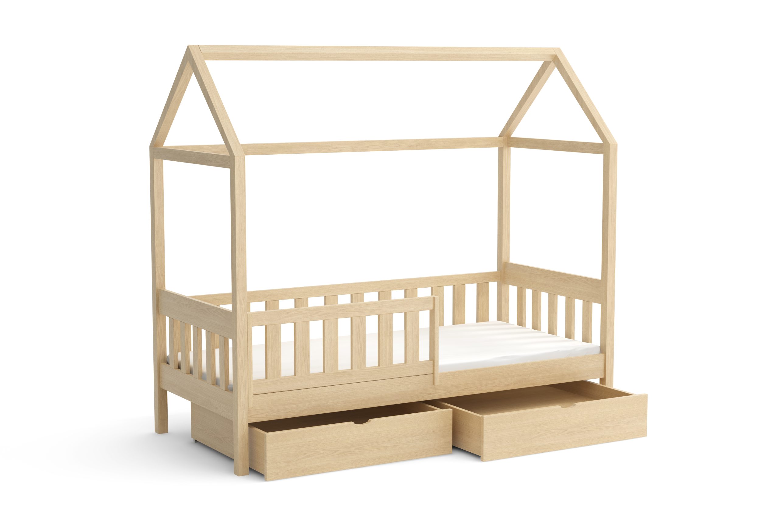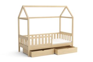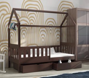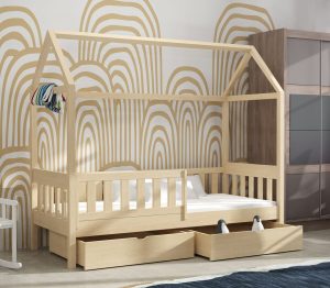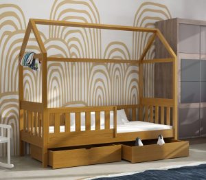 Łóżeczko domek Maciejka zostało wykonane z litego drewna sosnowego, które gwarantuje trwałość i odporność na uszkodzenia. Solidny stelaż z listew sprężynujących zapewnia stabilne podparcie materaca i komfortowy sen każdej nocy. Konstrukcja wytrzymuje obciążenie do 120 kg, co sprawia, że jest odpowiednia również w sytuacjach, gdy rodzic chce spędzić chwilę z dzieckiem w jego łóżku, np. podczas wieczornego czytania bajek.