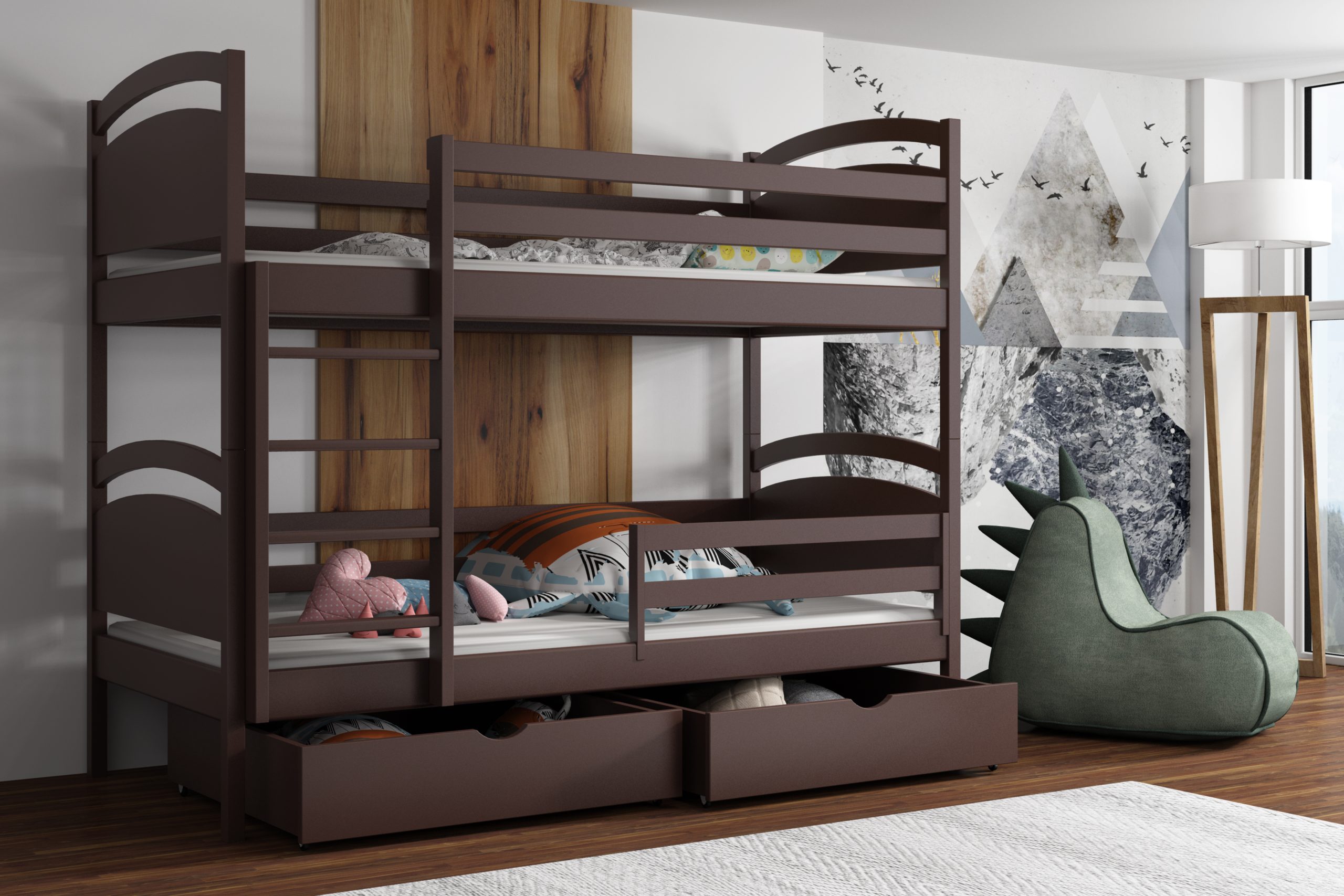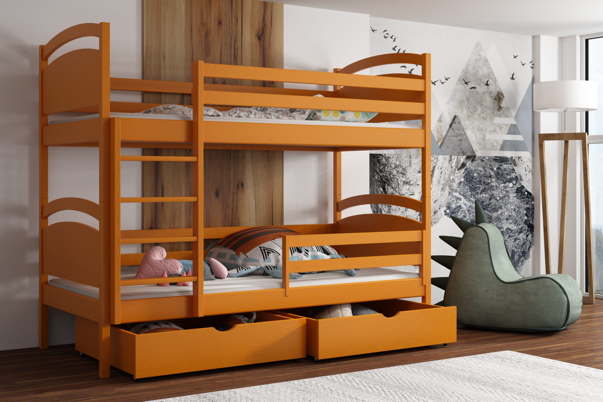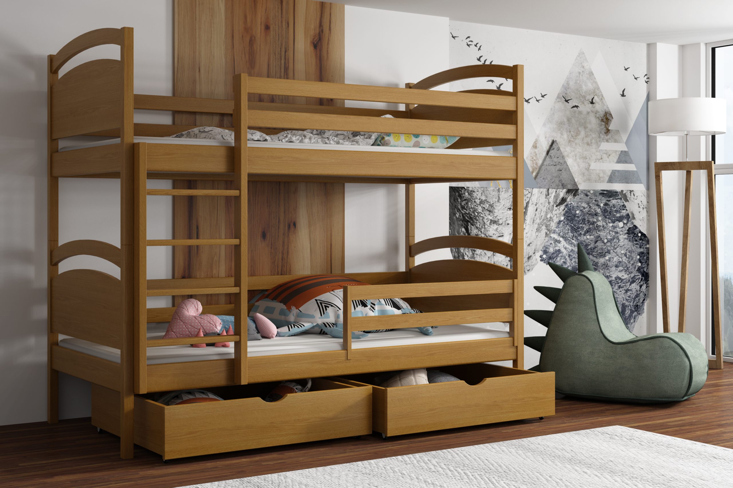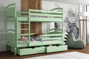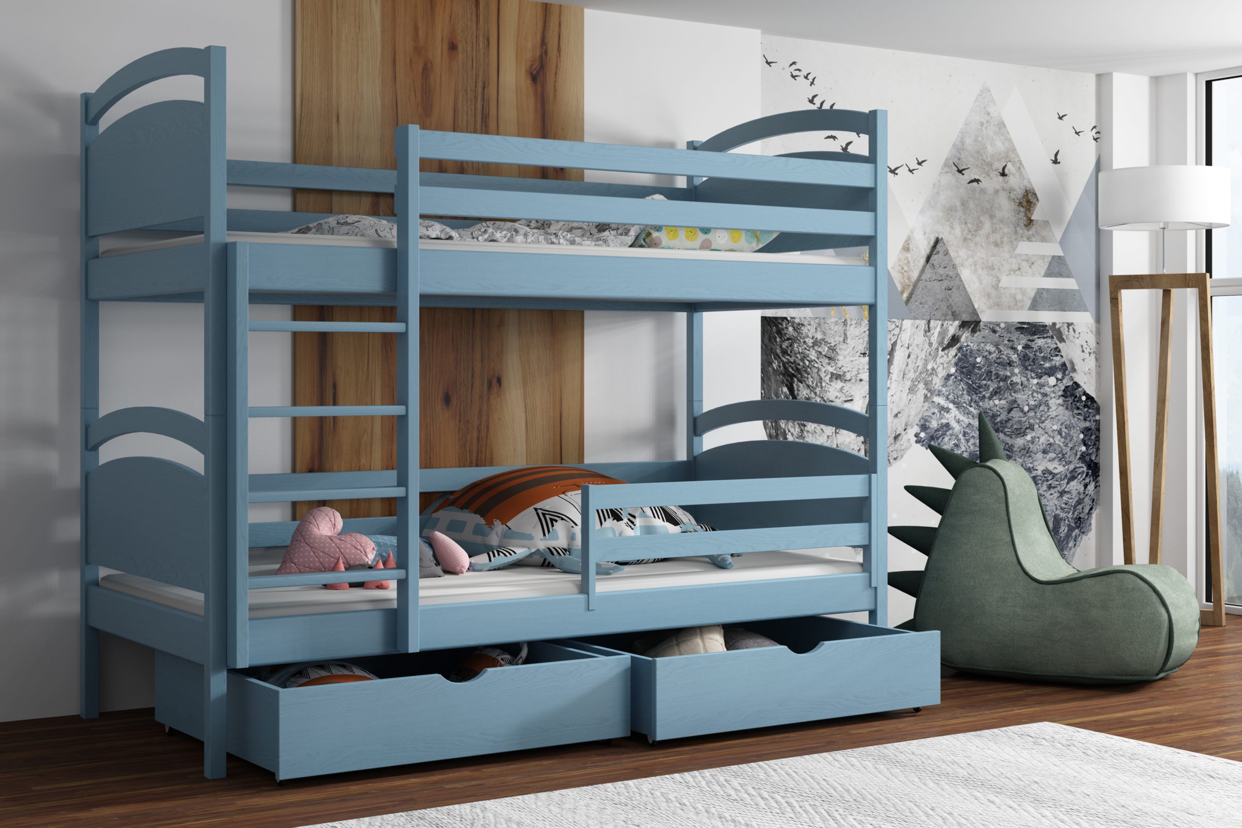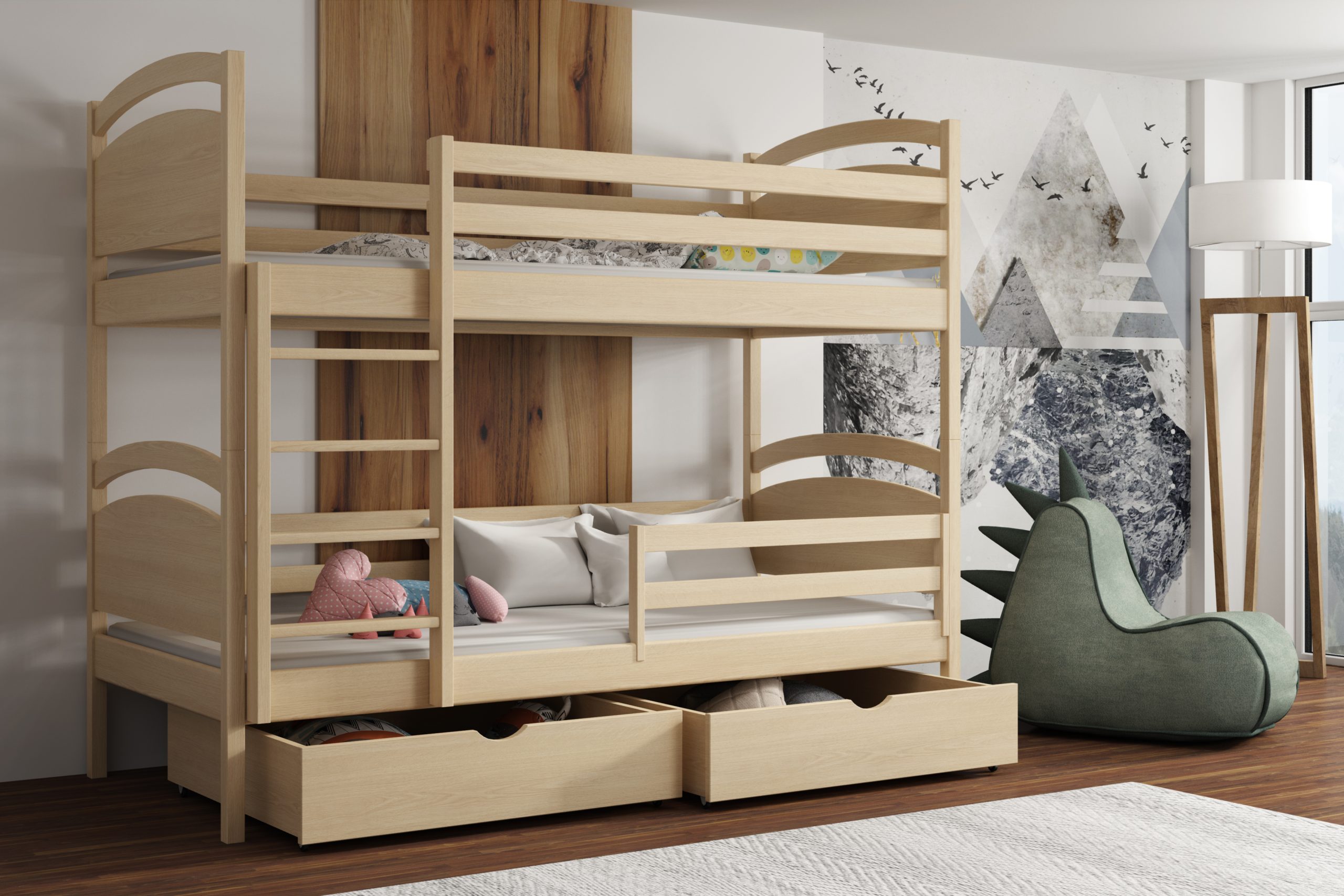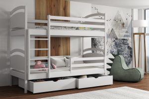 Łóżko piętrowe Marcelina łączy subtelny, lekki design z solidną konstrukcją z litego drewna sosnowego, oferując bezpieczne miejsce do snu na dwóch poziomach oraz dwie pojemne szuflady na zabawki i pościel.