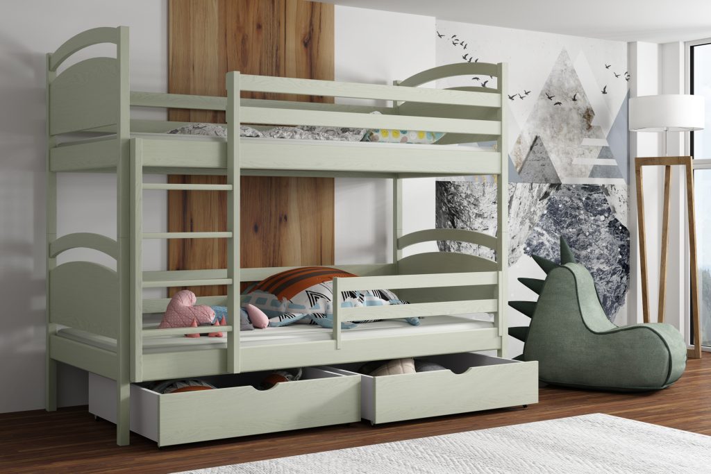 Model Marcelina wyróżnia się nie tylko elegancką linią, ale również praktycznością. Pod dolnym poziomem znajdują się dwie pojemne szuflady, idealne na pościel, zabawki czy ubrania, dzięki czemu w pokoju dzieci łatwiej utrzymać porządek. To świetne rozwiązanie zwłaszcza do niewielkich wnętrz, gdzie liczy się każda dodatkowa przestrzeń do przechowywania.