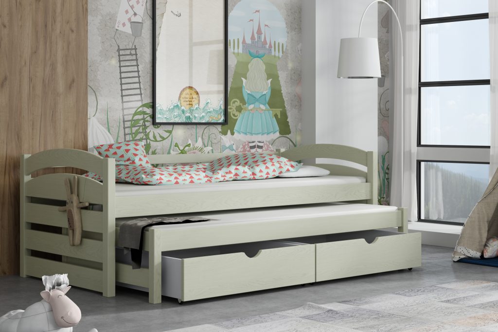 Łóżko Monika to praktyczne i stylowe rozwiązanie 2-w-1: pojedyncze łóżko z wysuwaną częścią do drugiego spania oraz dwiema pojemnymi szufladami, łączące estetykę z funkcjonalnością.