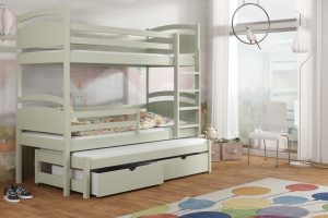 Łóżko potrójne Oliwia to przestronna, sosnowa konstrukcja z wysuwaną częścią do trzech materacy, zaokrąglonymi zagłówkami, szeroką drabinką i dwiema pojemnymi szufladami, łącząca minimalistyczny design z maksymalną funkcjonalnością.