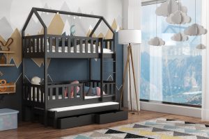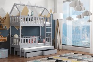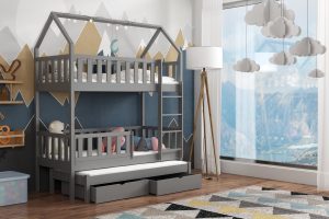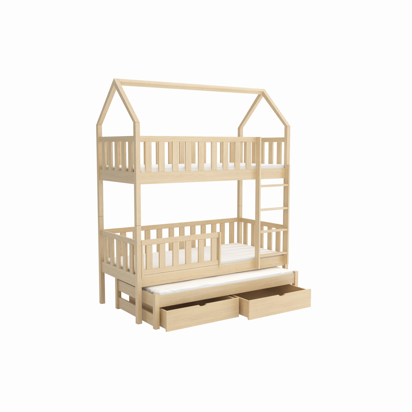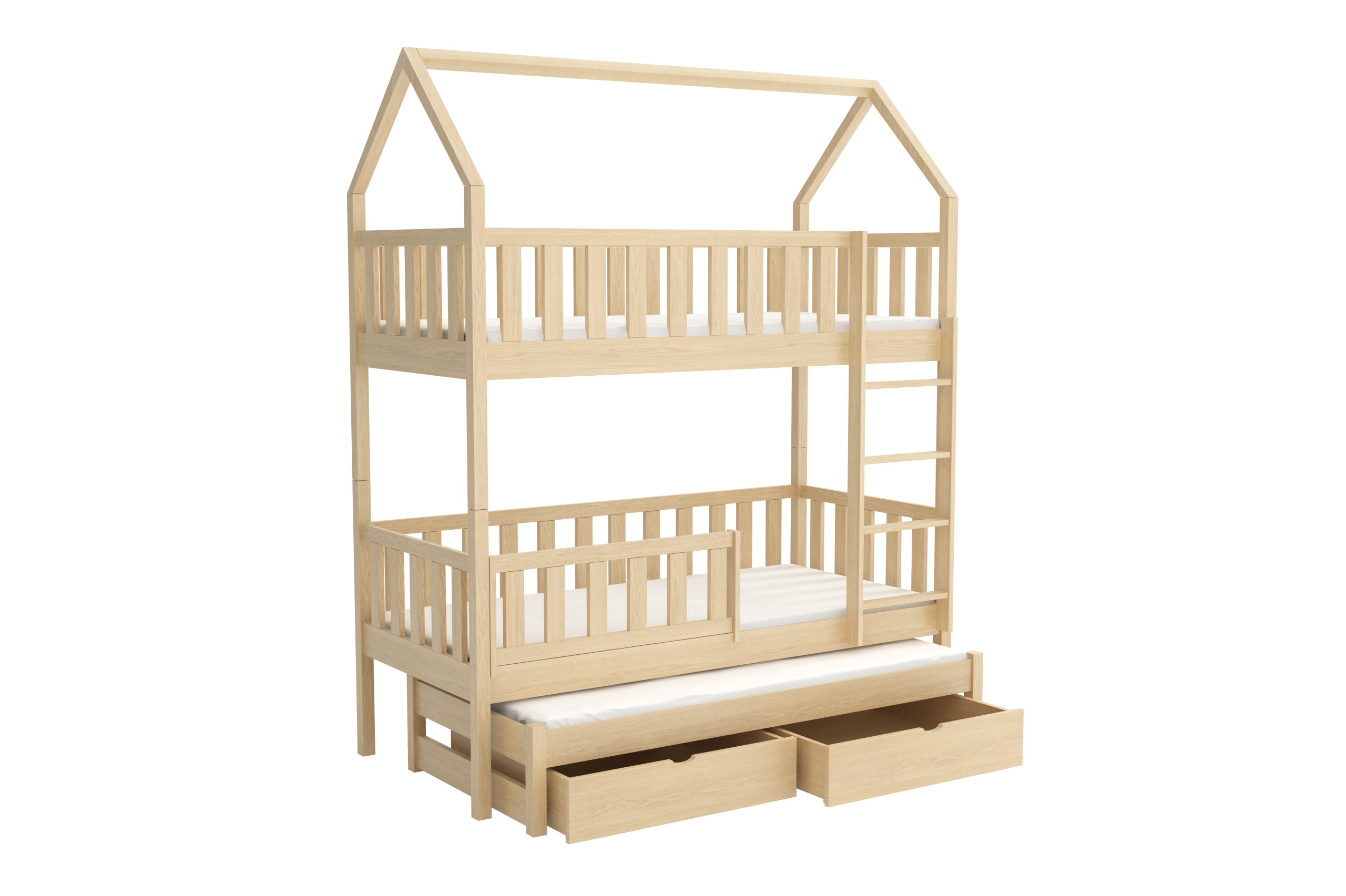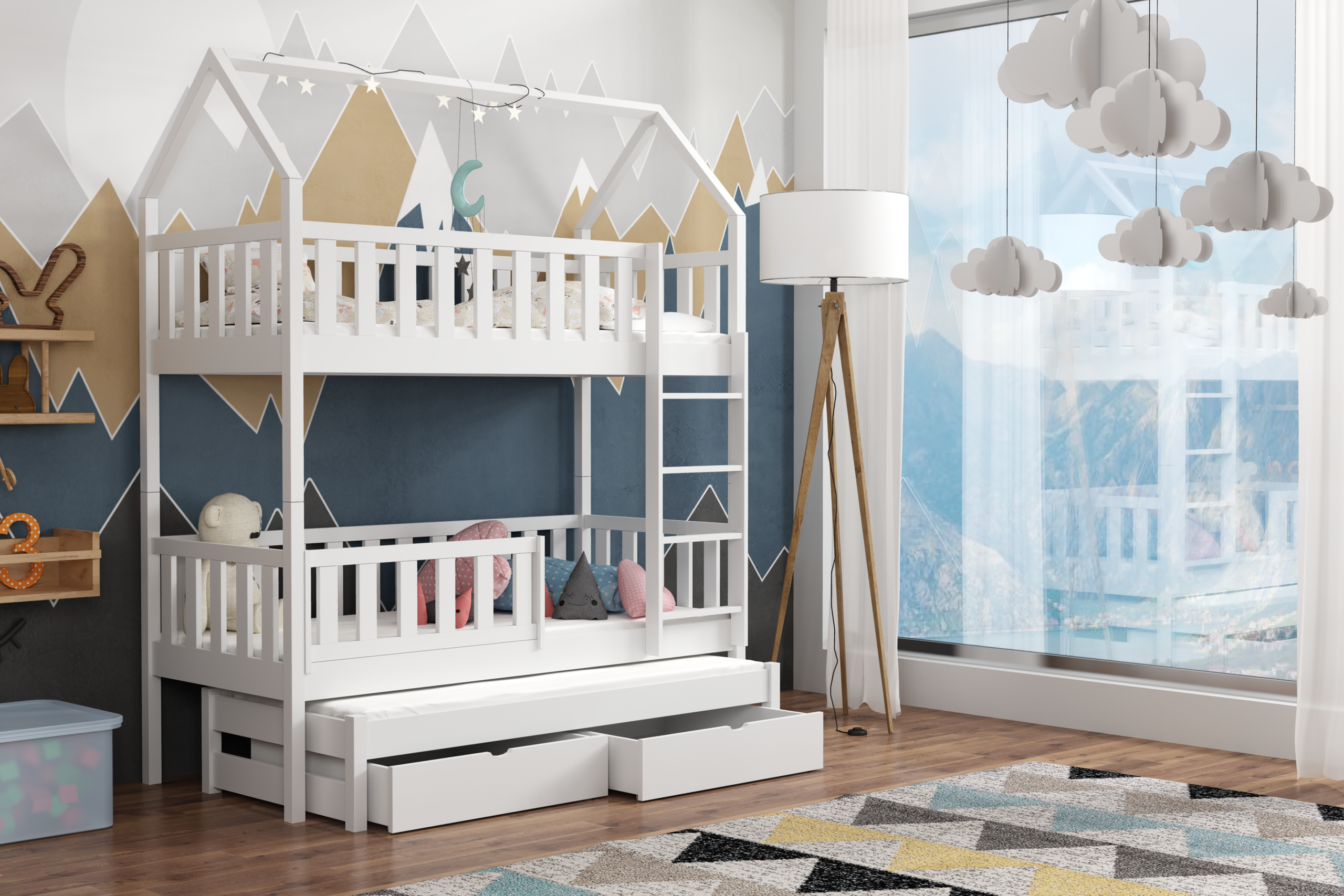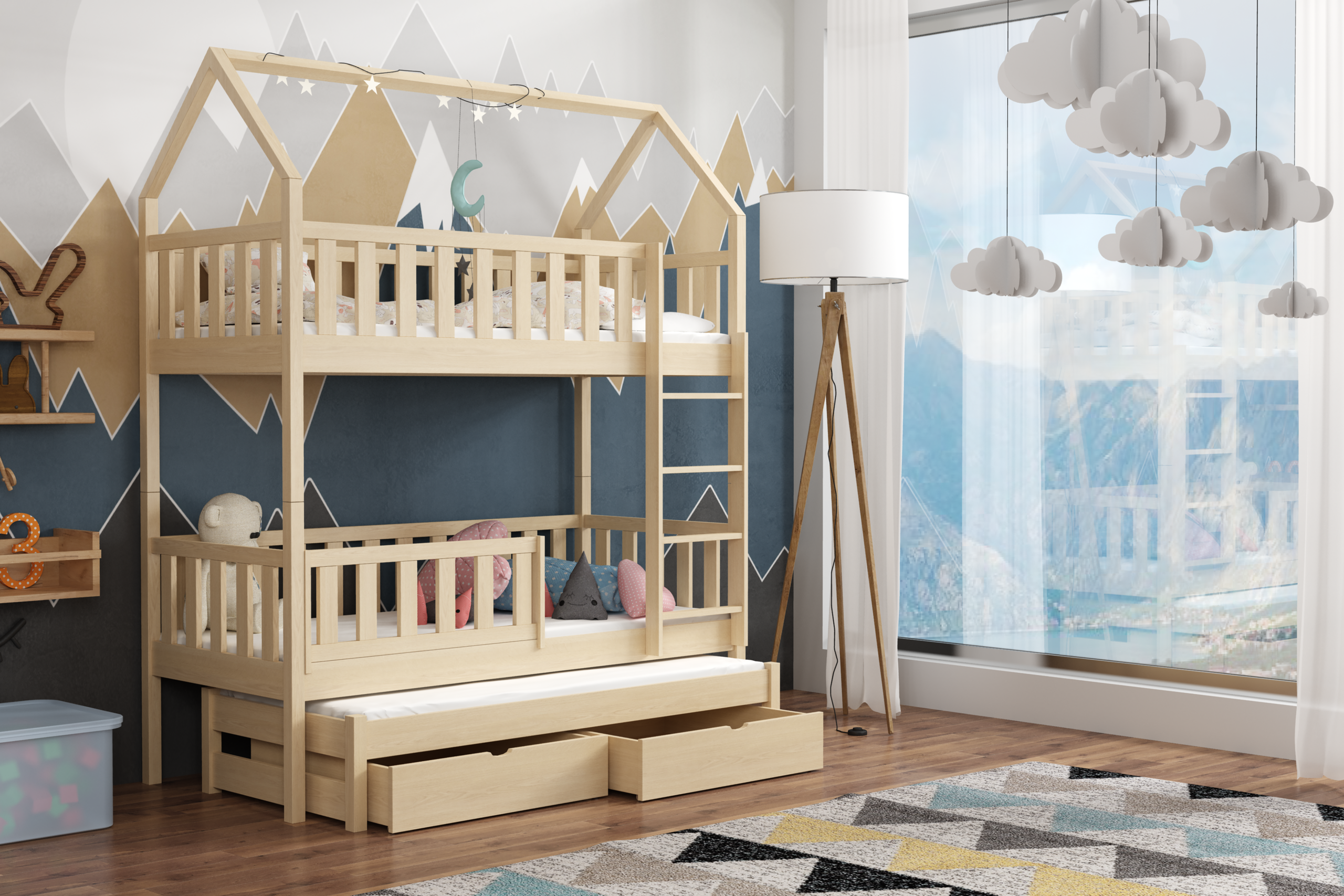 Łóżko domek potrójne Otis to trzyosobowy mebel o kompaktowej, piętrowej konstrukcji, który w dzień staje się polem nieograniczonych przygód, a w nocy zapewnia wygodny sen i dodatkowe miejsce do przechowywania w opcjonalnych szufladach.