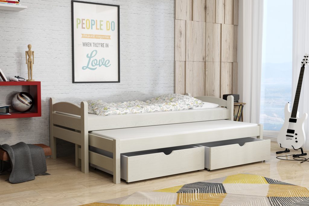 Łóżko podwójne Patrycja to lekka, minimalistyczna konstrukcja z wysuwaną częścią i pojemnymi szufladami, która oszczędza miejsce i zapewnia komfortowy sen rodzeństwu lub gościom.
