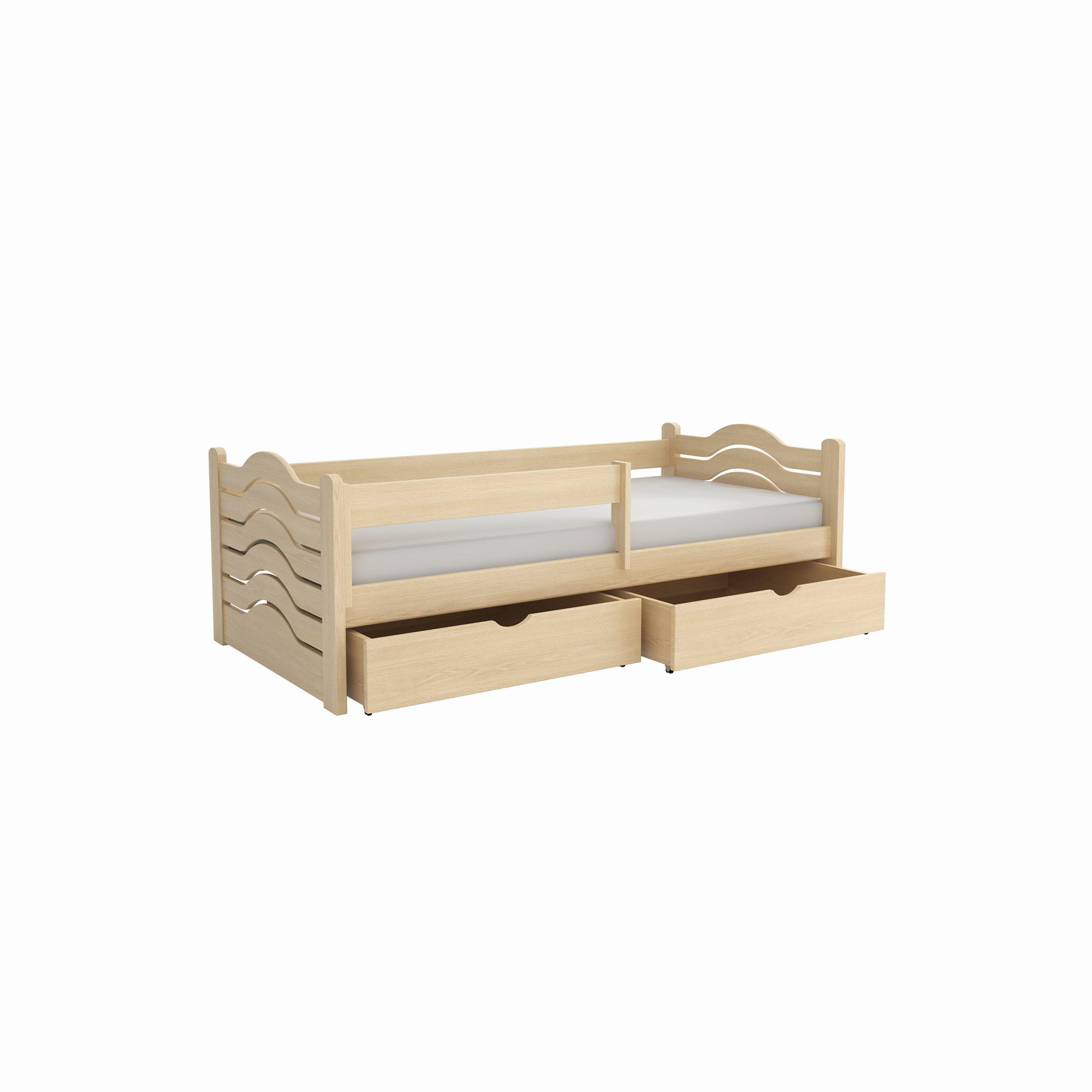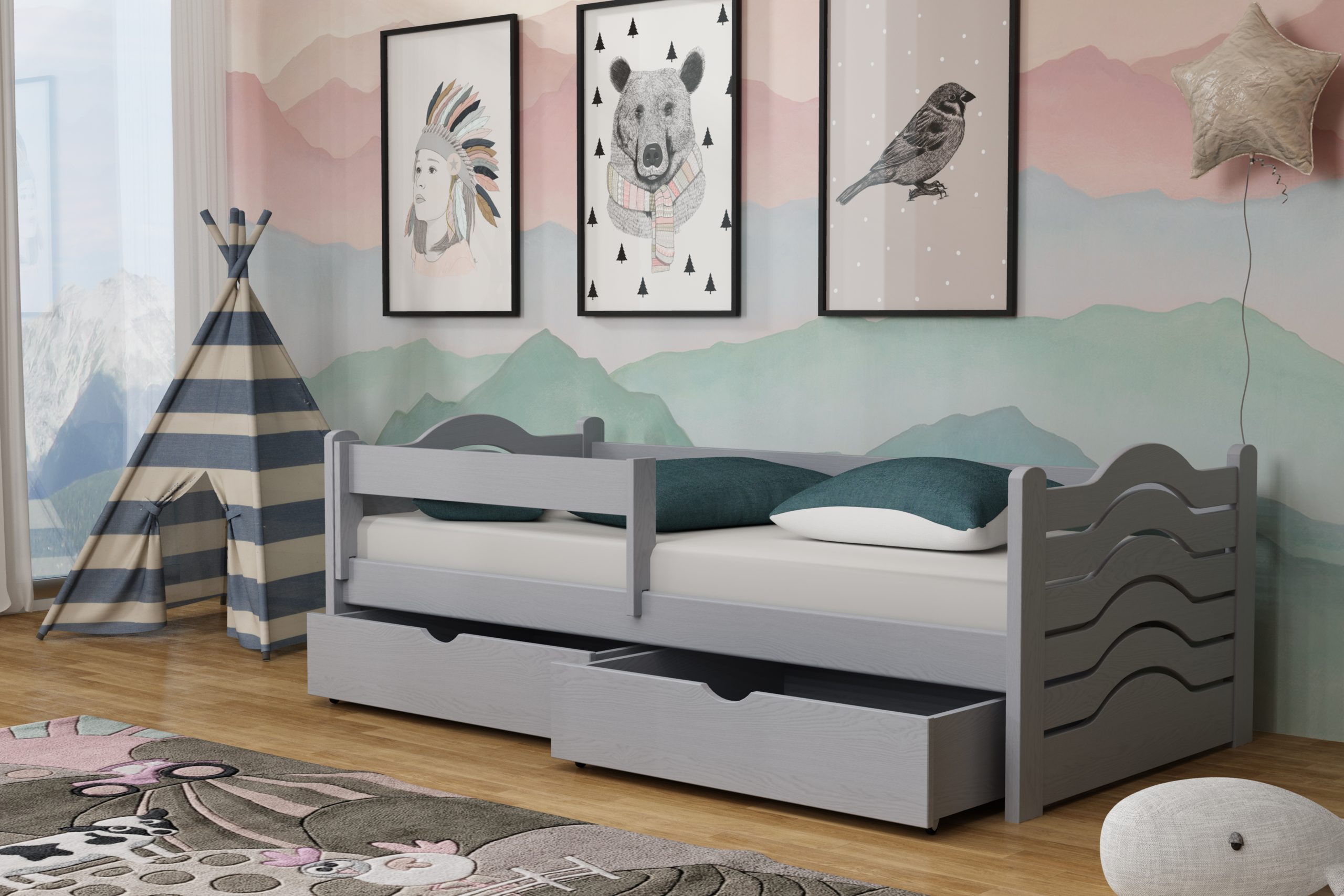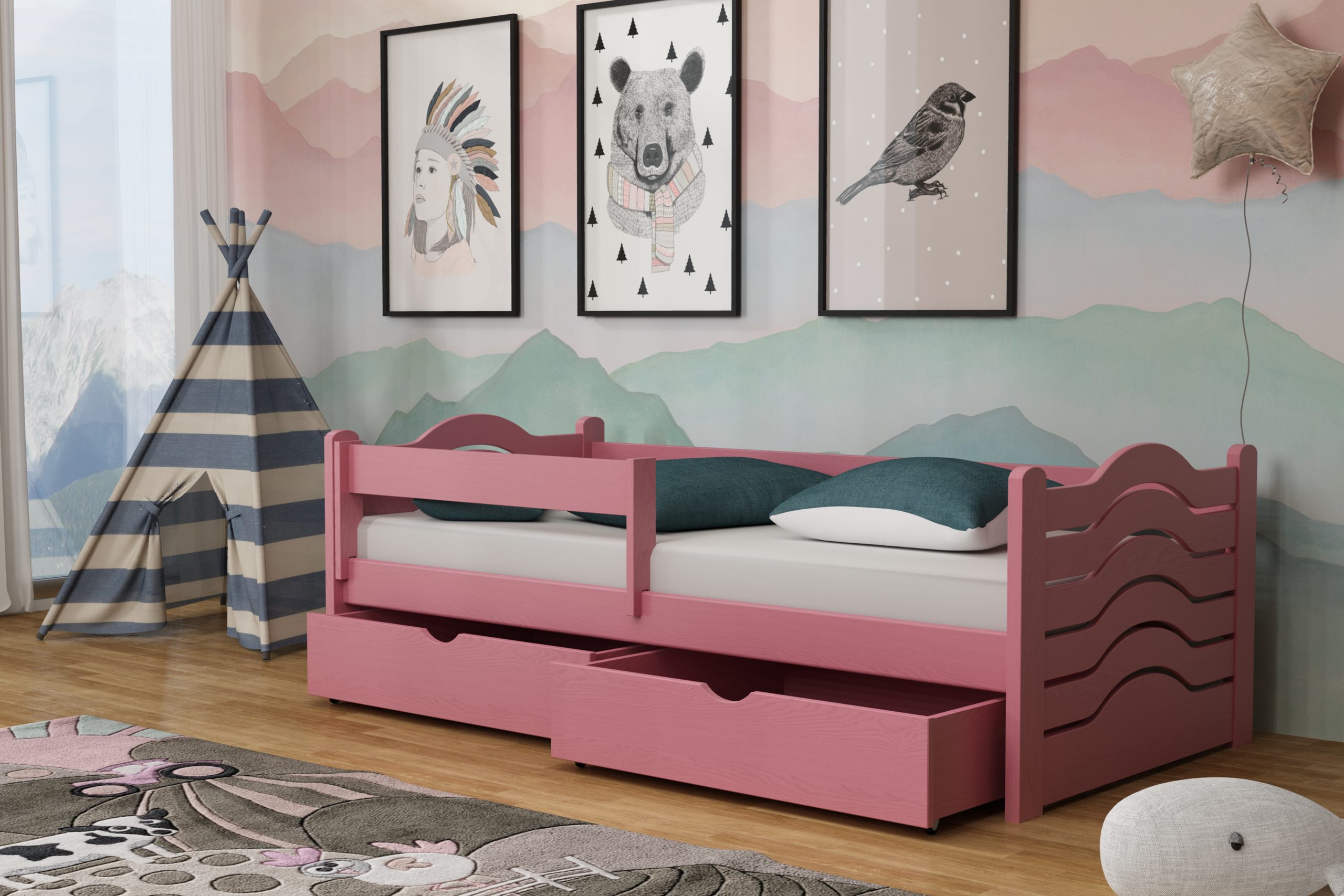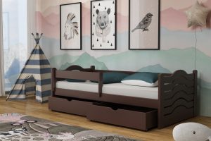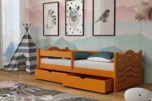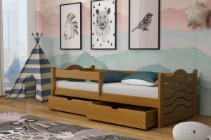 Łóżko Pinokio to pojedynczy mebel z litego drewna sosnowego, jego unikalne, pagórkowate wezgłowie pobudza wyobraźnię, a solidna konstrukcja i pojemne szuflady gwarantują bezpieczny i komfortowy sen przez wiele lat.