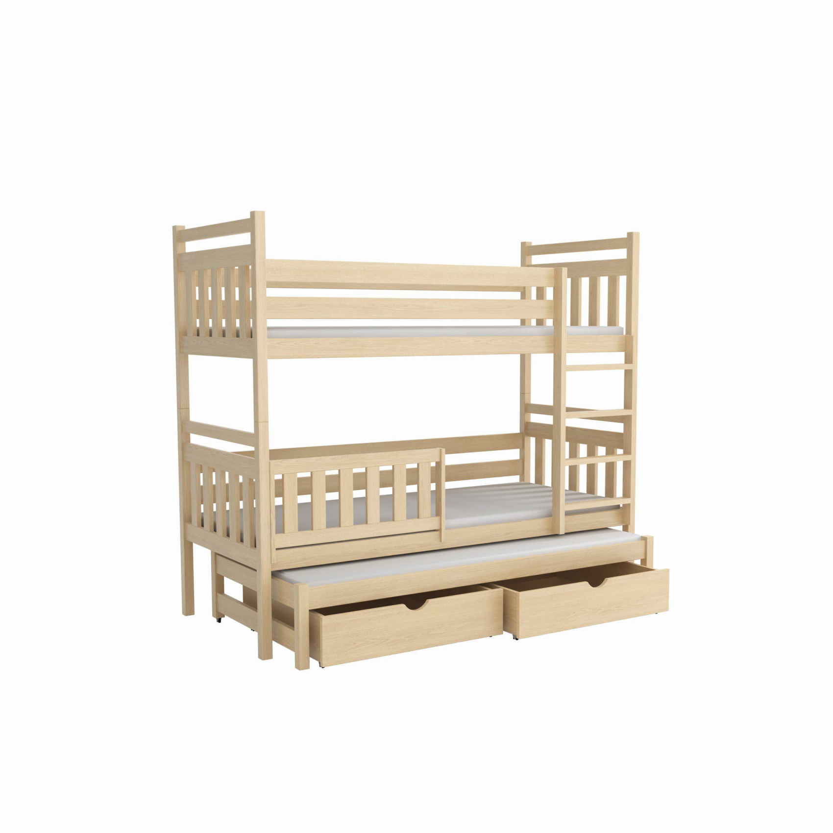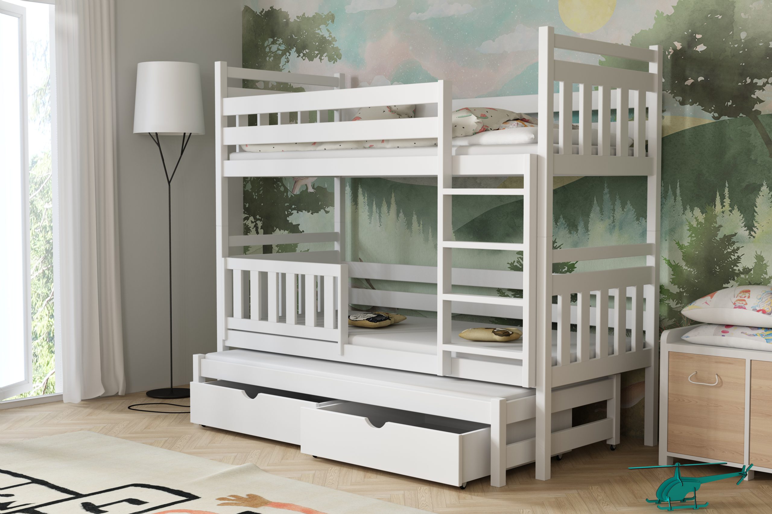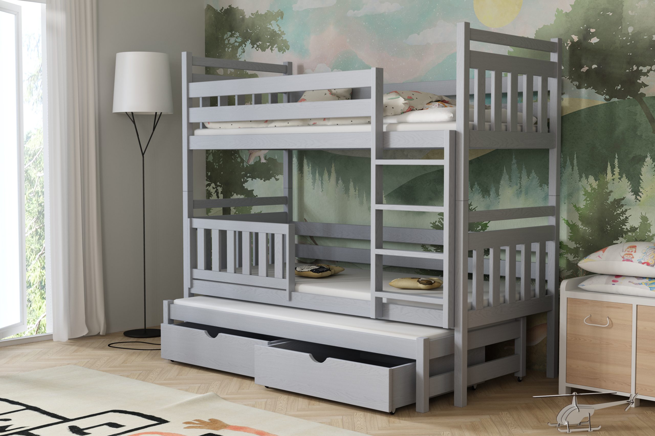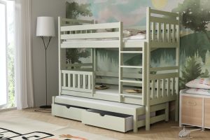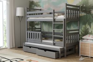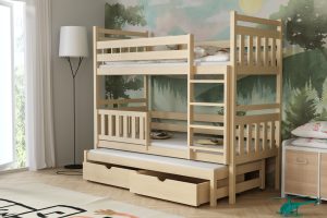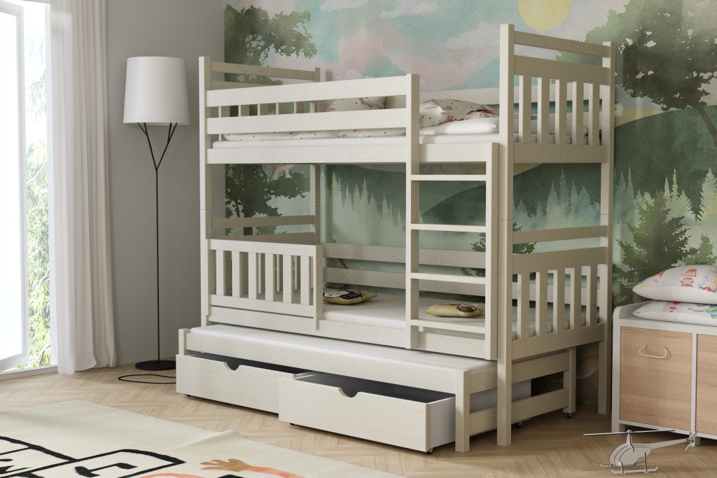Łóżko potrójne Piotr to praktyczne i stylowe rozwiązanie, które zapewnia wygodne miejsce do spania dla trzech osób, oszczędzając przy tym przestrzeń w pokoju dziecięcym.