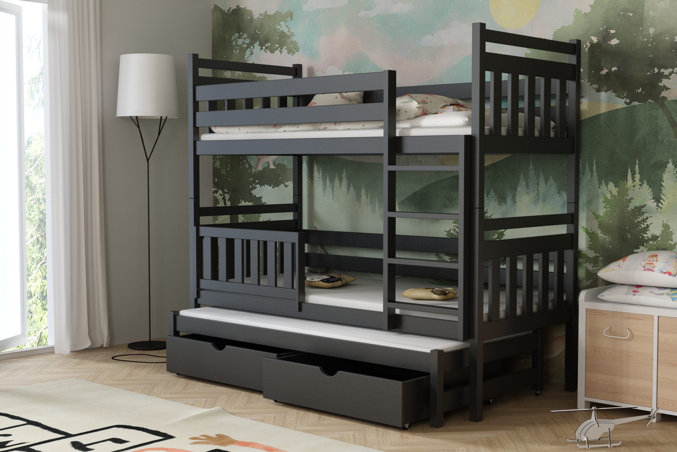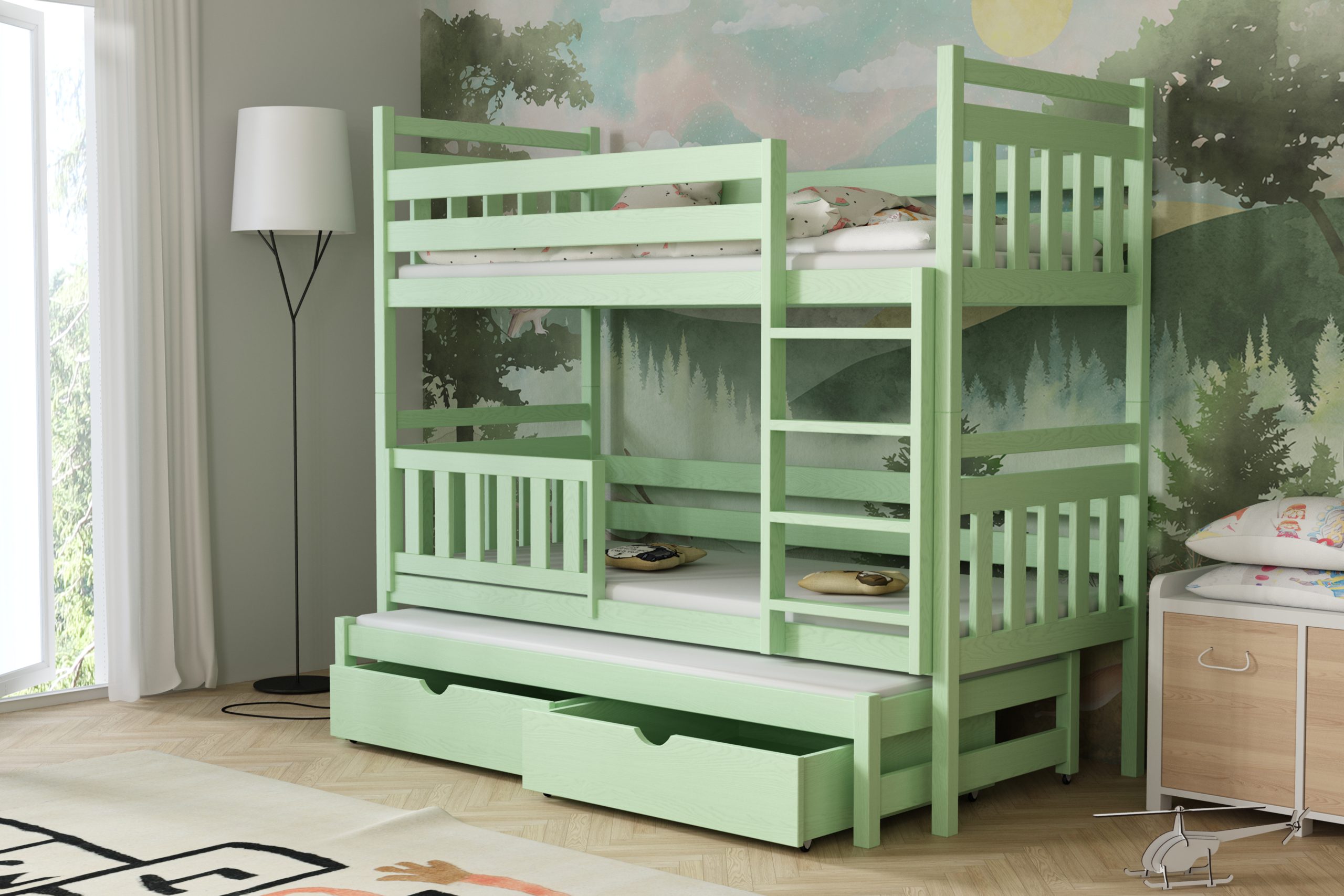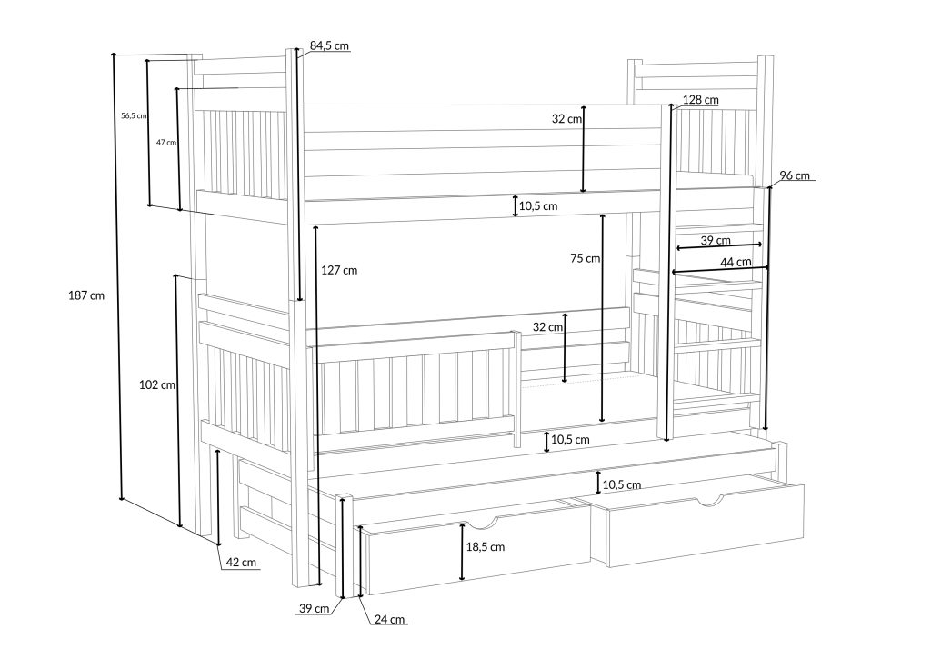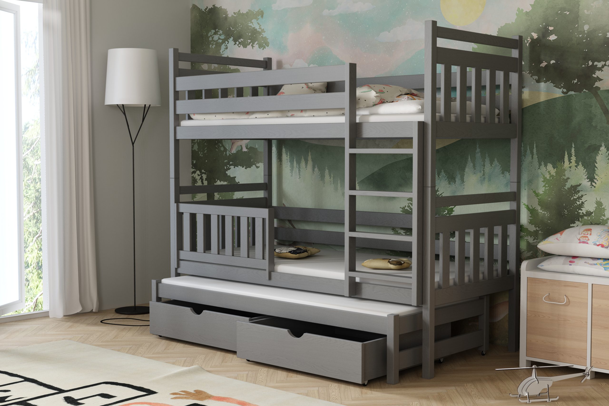 Łóżko potrójne Piotr to praktyczne i stylowe rozwiązanie, które zapewnia wygodne miejsce do spania dla trzech osób, oszczędzając przy tym przestrzeń w pokoju dziecięcym.