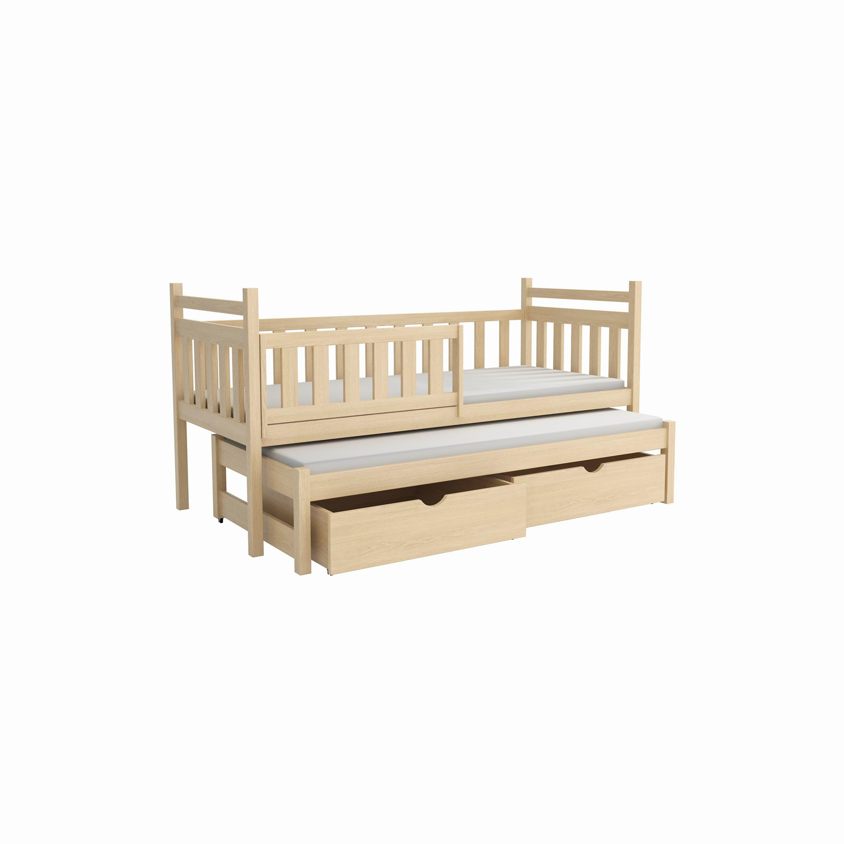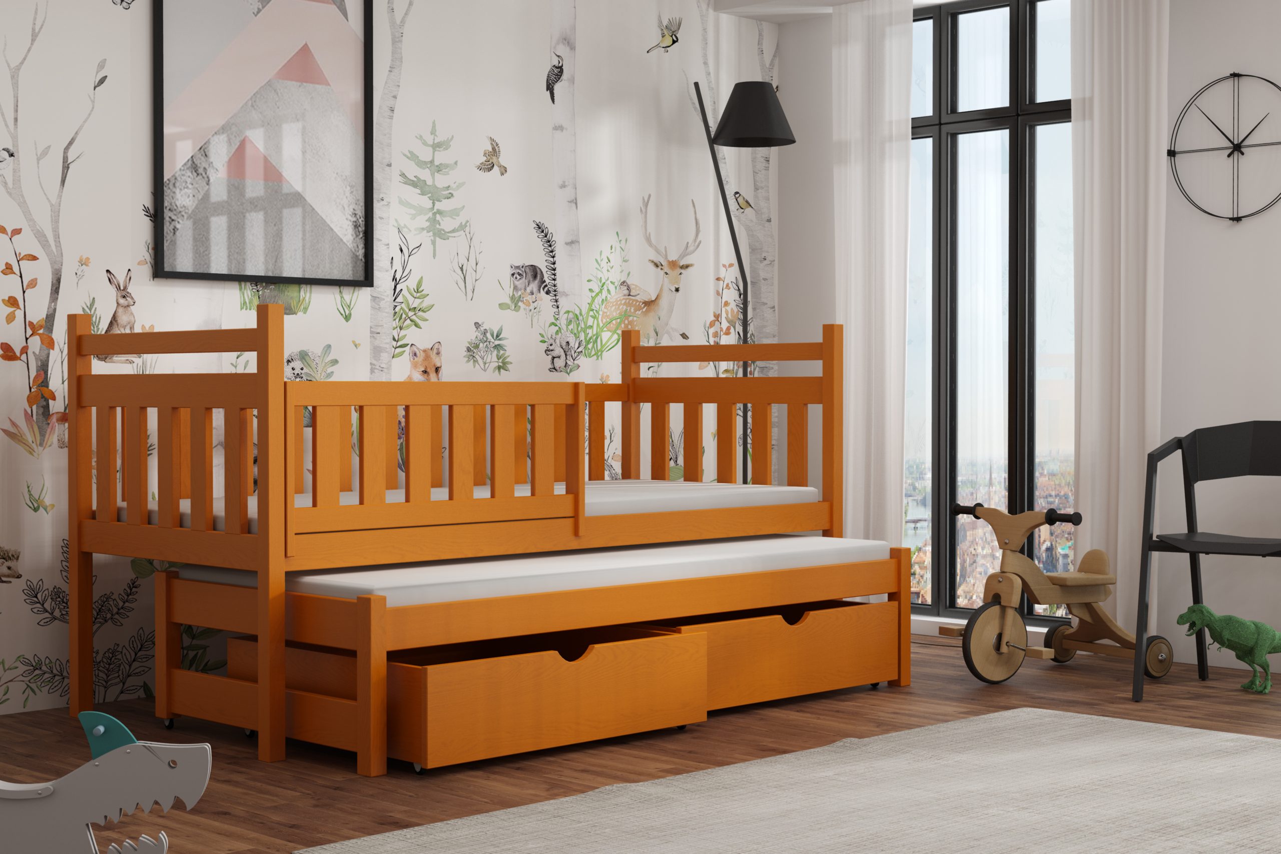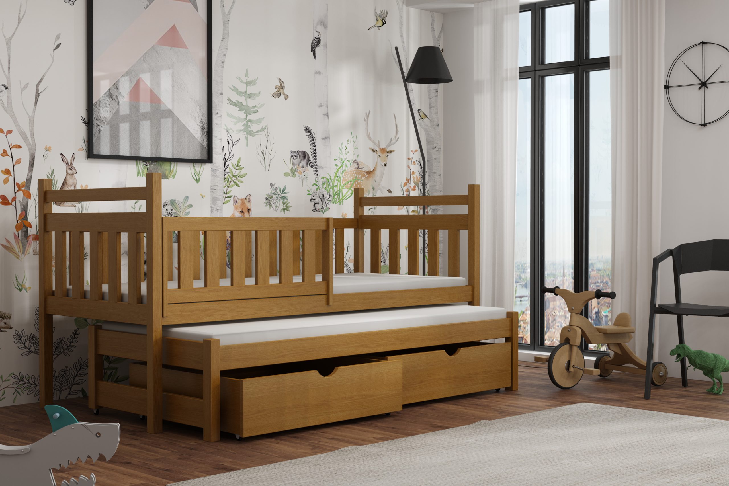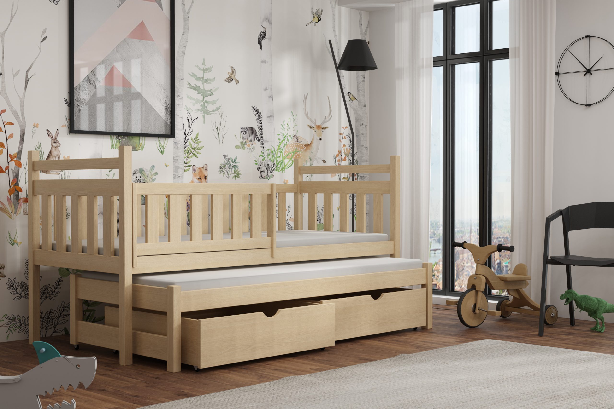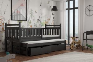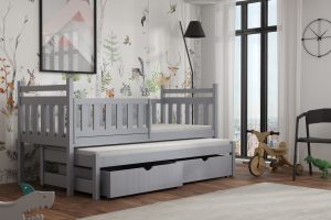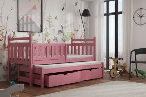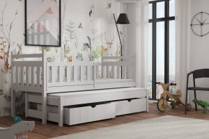 Łóżko podwójne Puchatek to solidne i przytulne rozwiązanie z wysuwanym posłaniem, łączące bezpieczeństwo, wygodę i oszczędność miejsca w dziecięcym pokoju