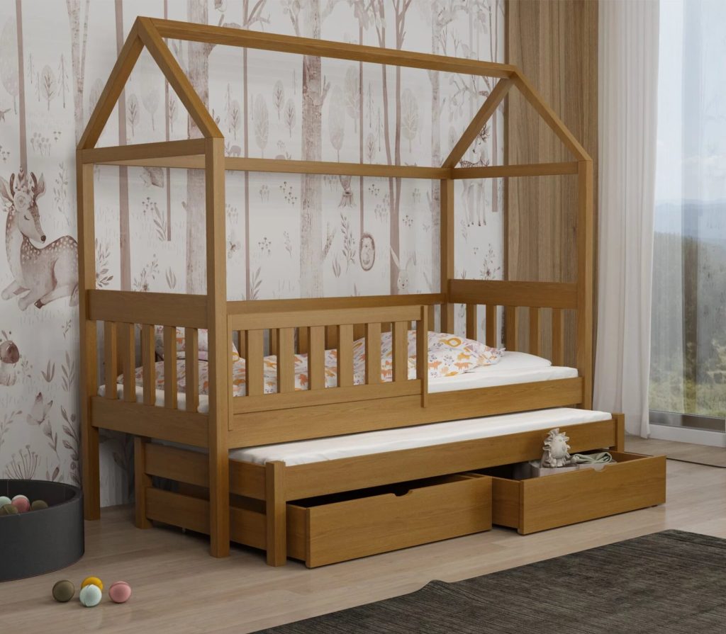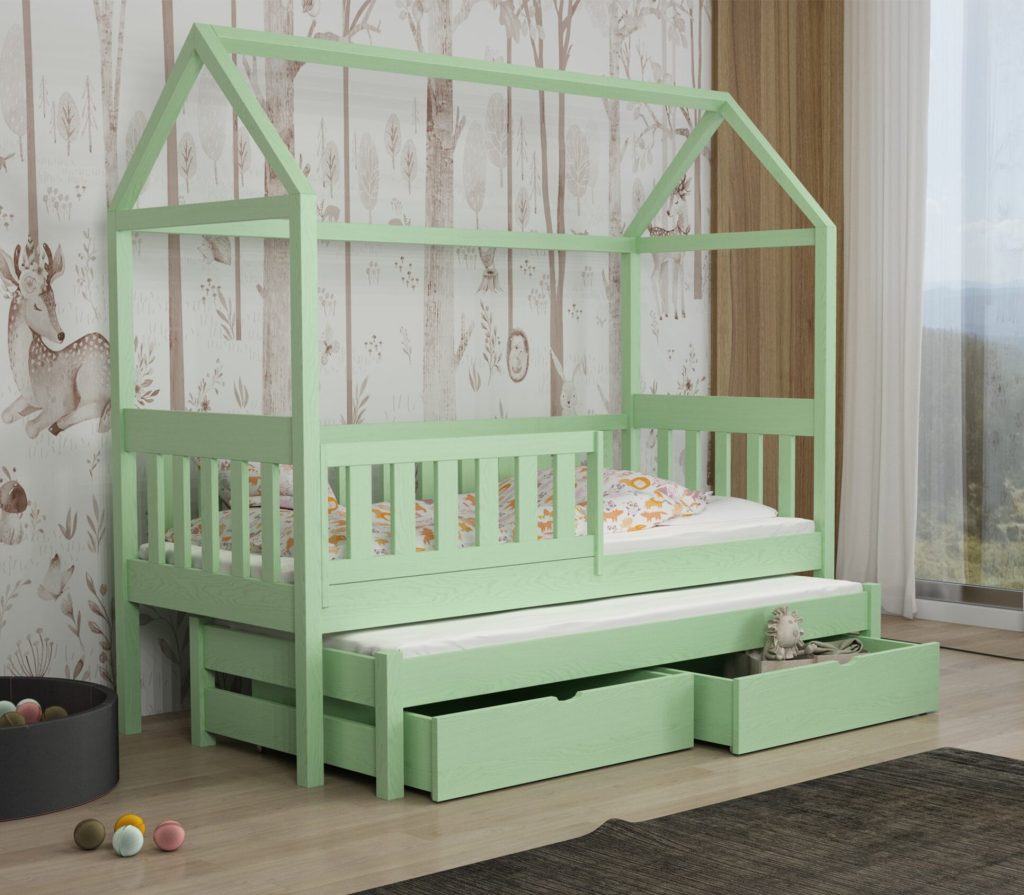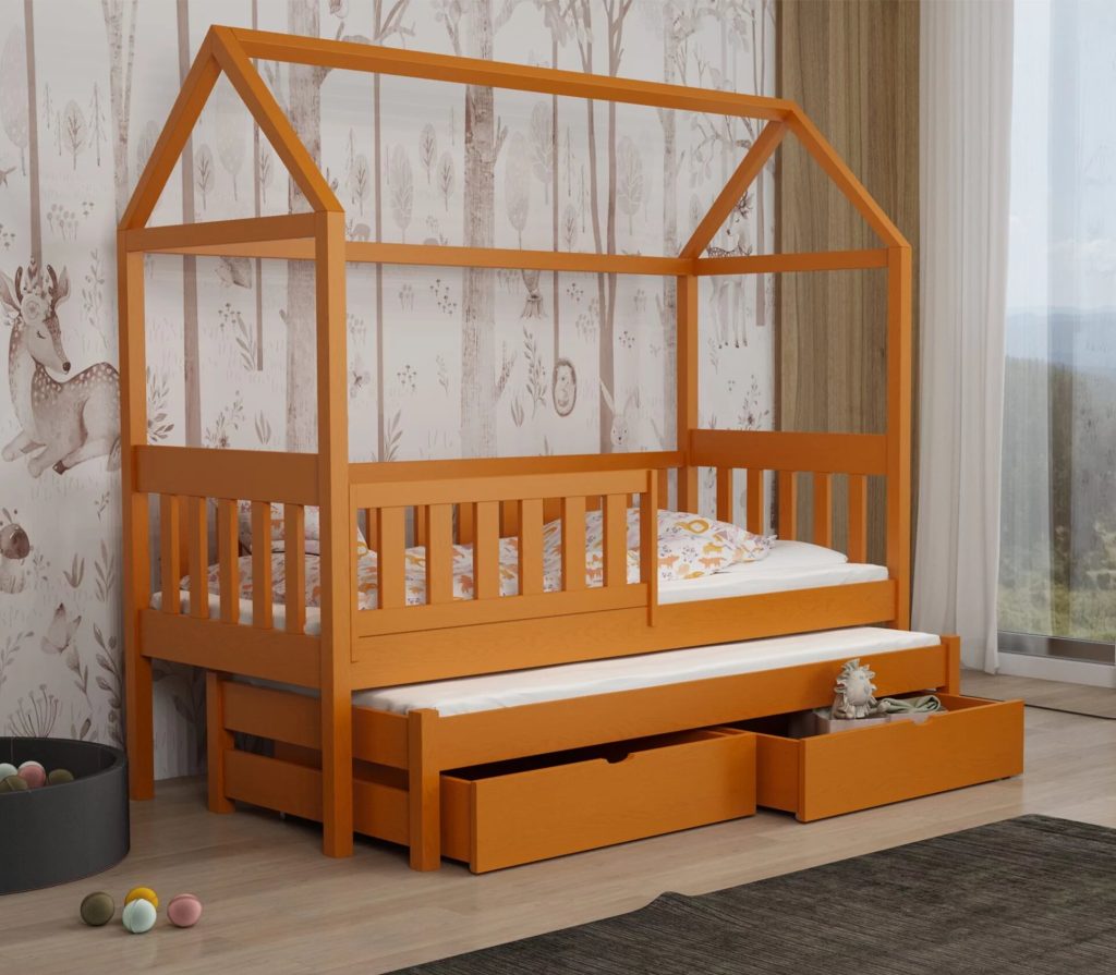 Łóżko Domek Podwójne Revo z litej sosny łączy bezpieczne barierki, wysuwane posłanie i pojemne szuflady z bajkowym kształtem domku, maksymalnie wykorzystując przestrzeń i pobudzając wyobraźnię dziecka. Dzięki 11 rozmiarom i 12 kolorom łatwo dopasujesz je do każdego pokoju.