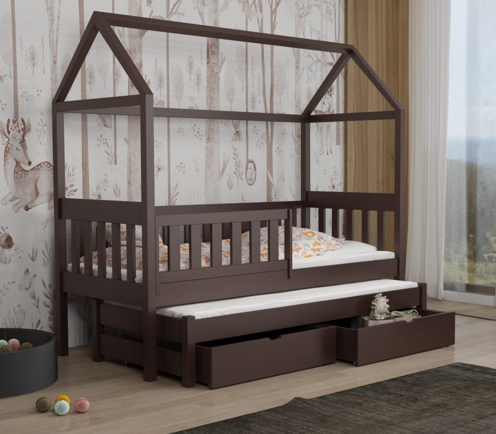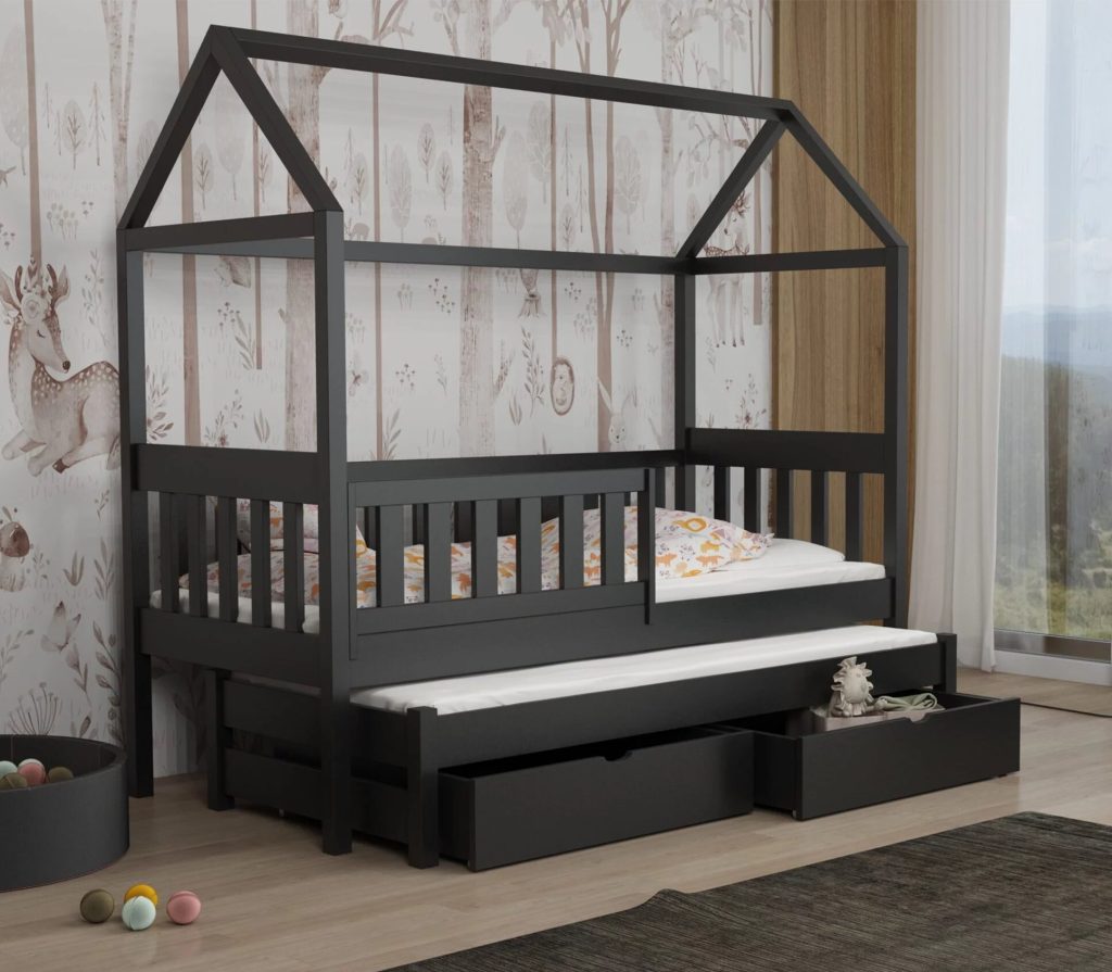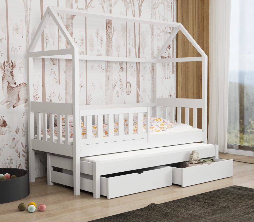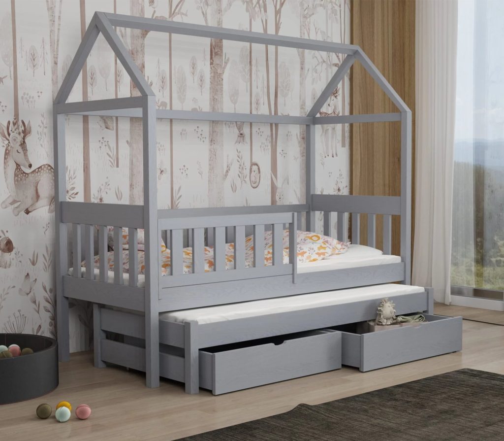 Łóżko Domek Podwójne Revo z litej sosny łączy bezpieczne barierki, wysuwane posłanie i pojemne szuflady z bajkowym kształtem domku, maksymalnie wykorzystując przestrzeń i pobudzając wyobraźnię dziecka. Dzięki 11 rozmiarom i 12 kolorom łatwo dopasujesz je do każdego pokoju.