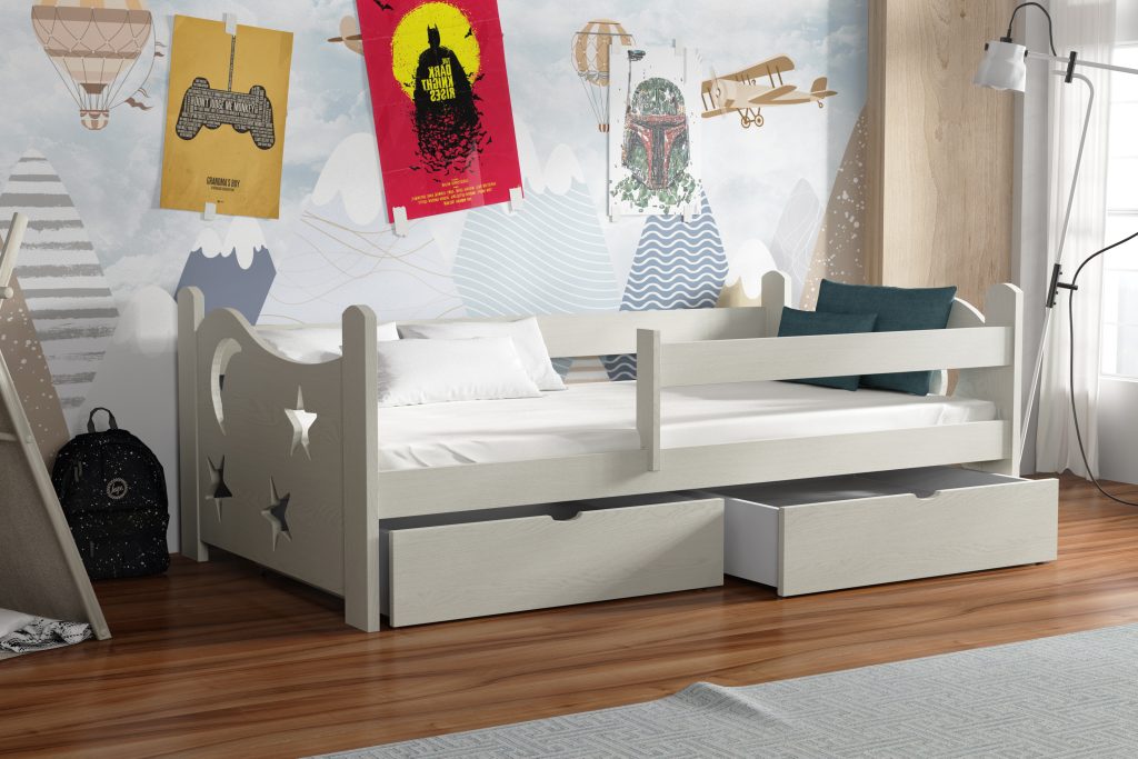 Łóżko pojedyncze Stars przeniesie Twoje dziecko w kosmiczny świat dzięki dekoracyjnym wycięciom w kształcie księżyca i gwiazd, a solidna konstrukcja z litej sosny i pojemne szuflady zapewnią komfort snu i funkcjonalne przechowywanie.