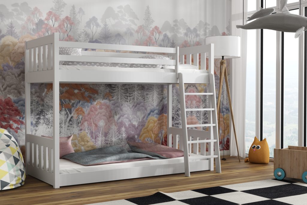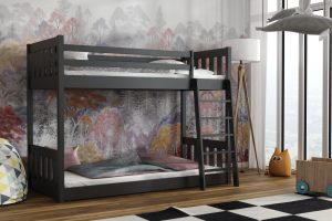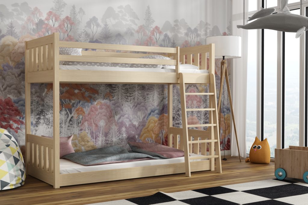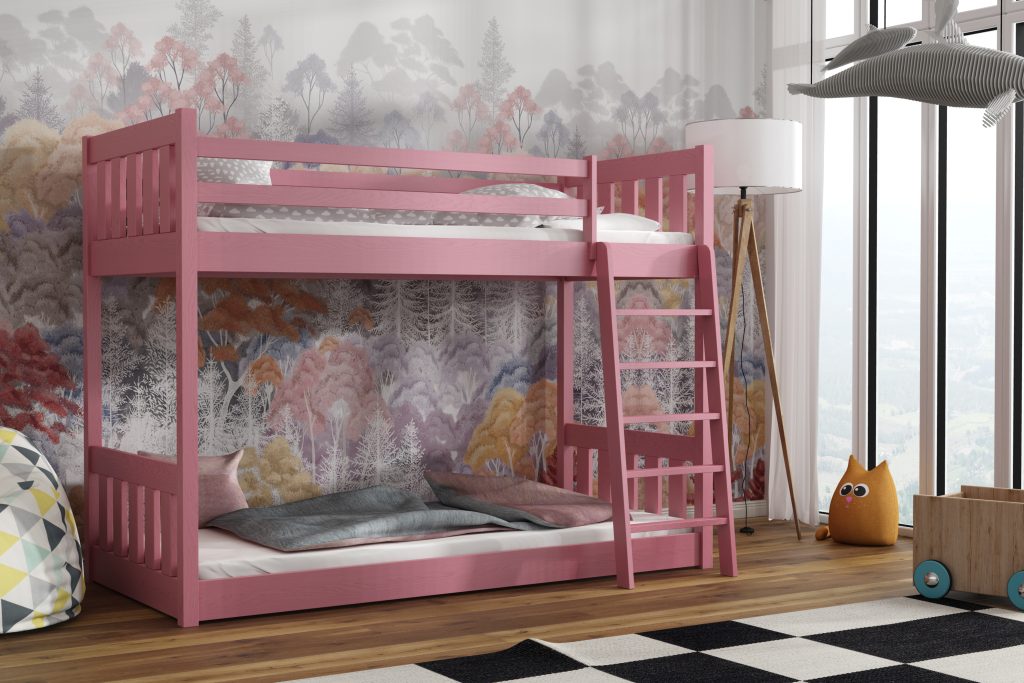Łóżko Szymon z litej sosny łączy skandynawski design z praktyczną antresolą, oferując solidne miejsce do snu i zabawy – dostępne w 11 rozmiarach i 12 kolorach.