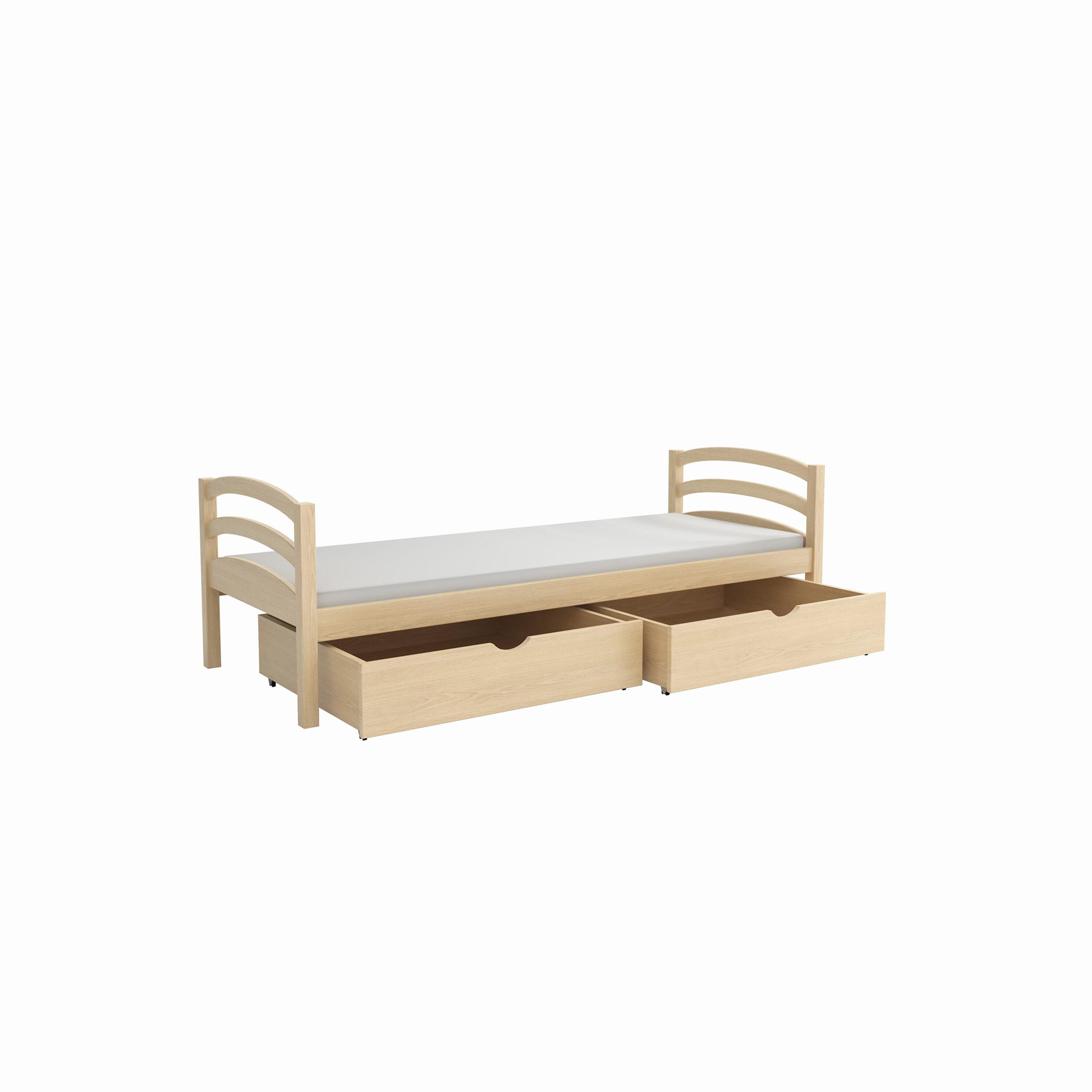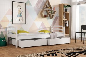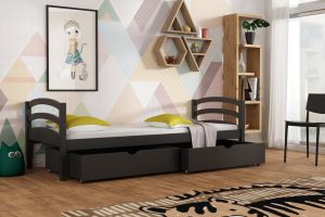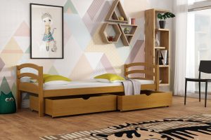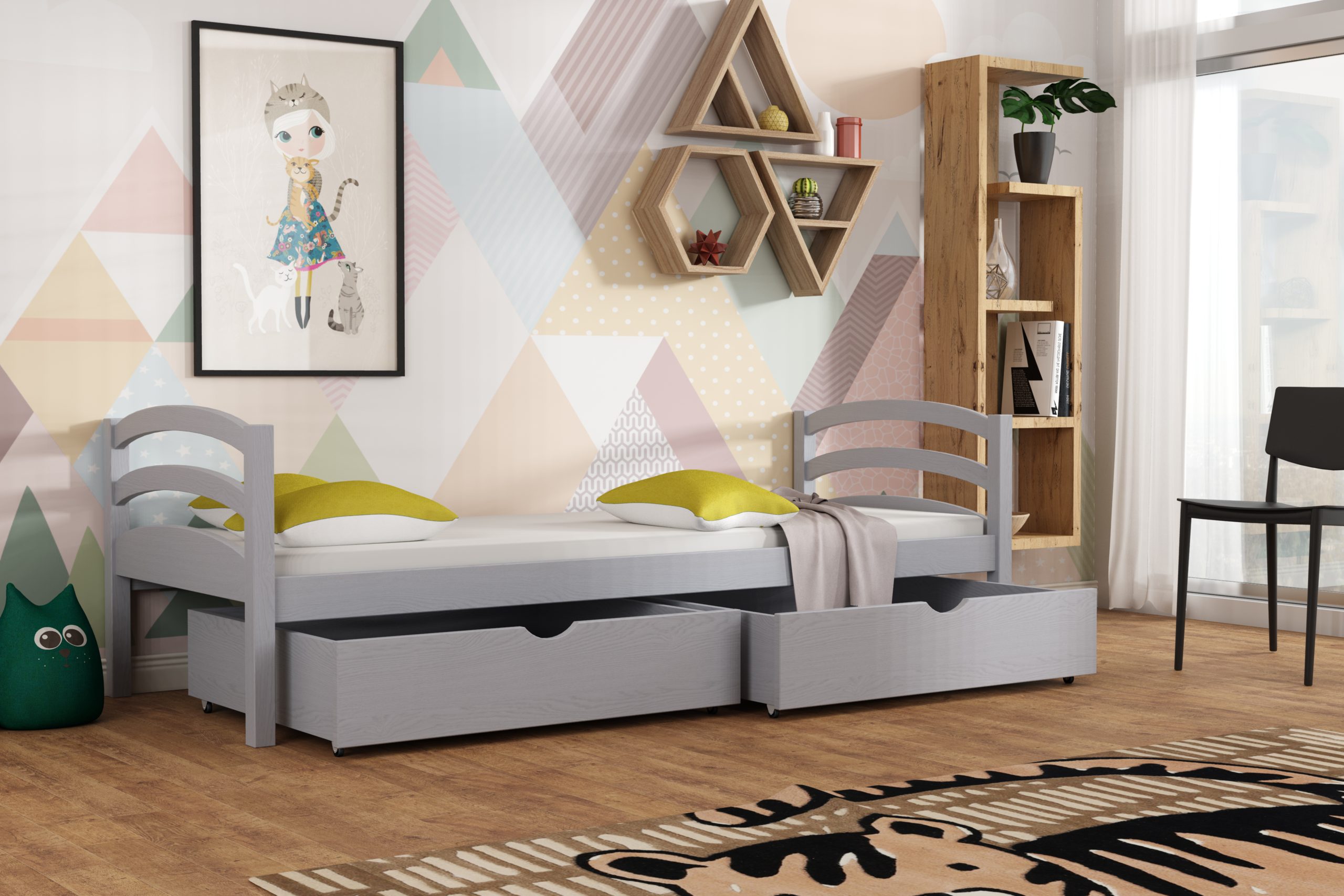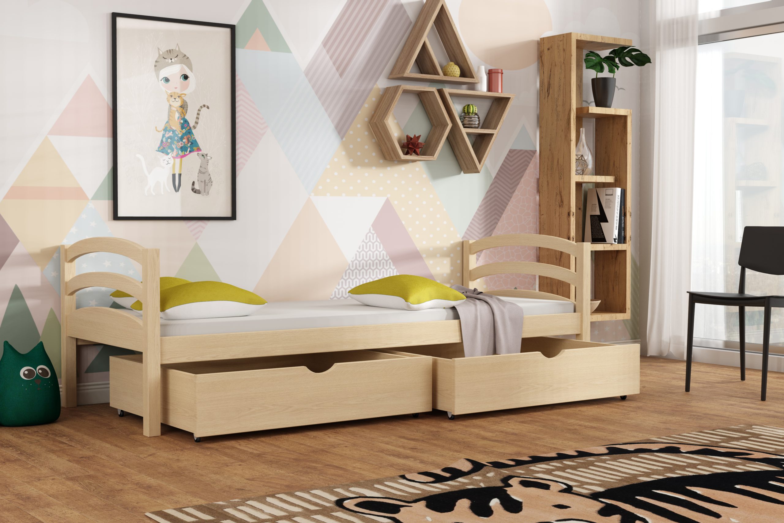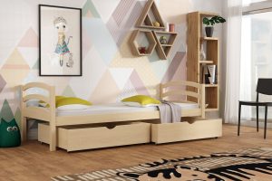 Łóżko Tornado łączy lekkość formy z solidną konstrukcją z litego drewna sosnowego, oferując nośność do 140 kg, zaokrąglone, bezpieczne zagłówki oraz pojemne szuflady – idealne do energicznych zabaw i zdrowego snu.