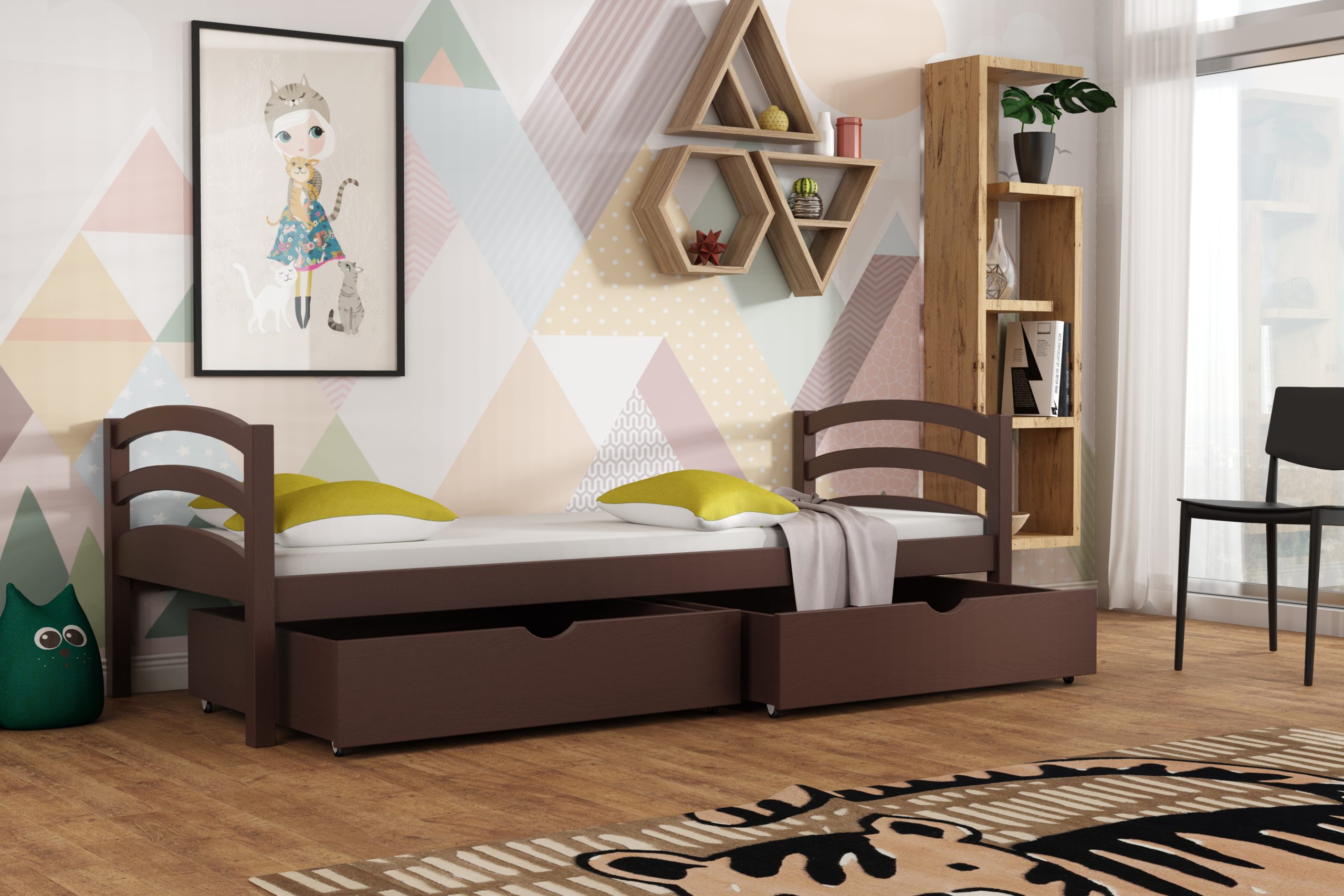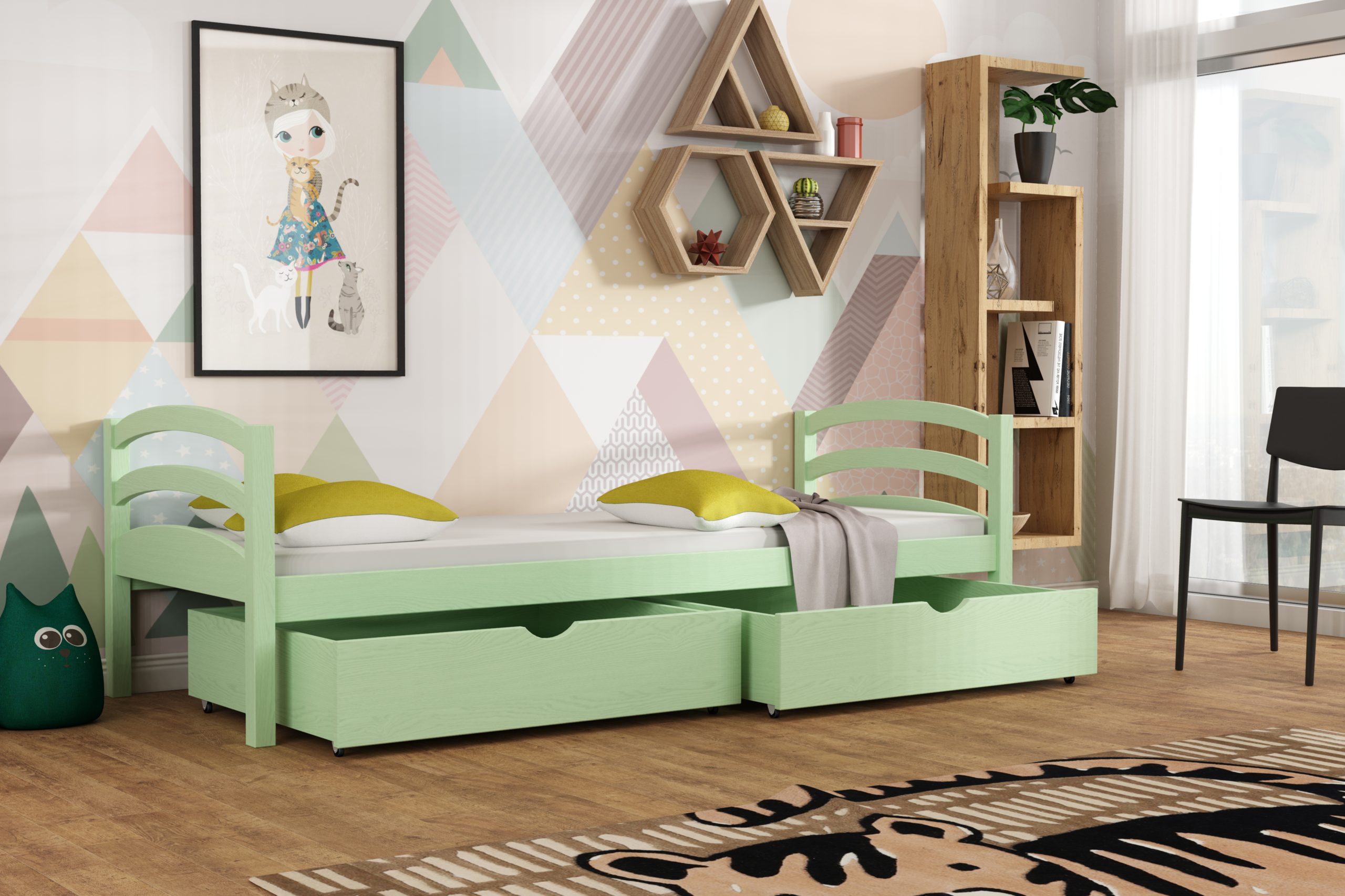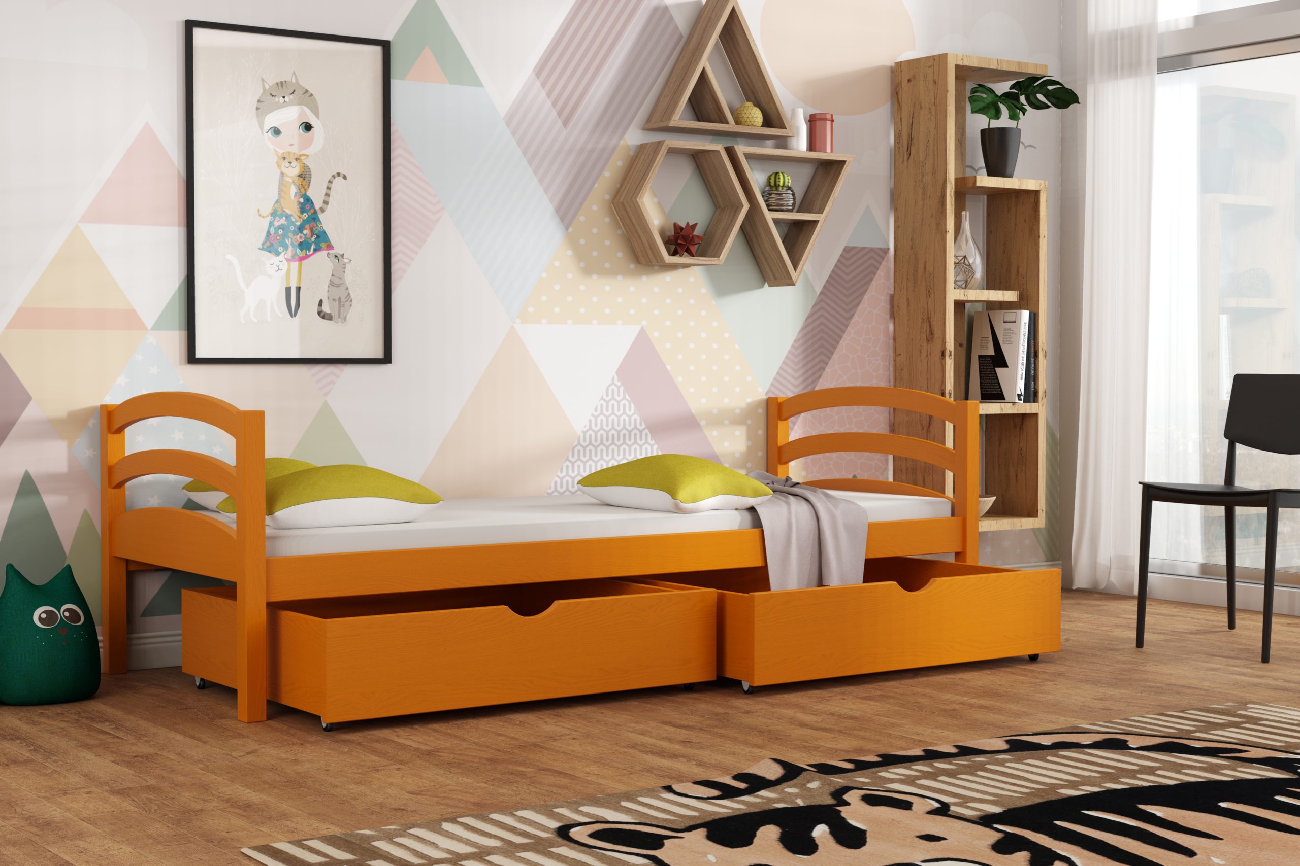 Łóżko Tornado łączy lekkość formy z solidną konstrukcją z litego drewna sosnowego, oferując nośność do 140 kg, zaokrąglone, bezpieczne zagłówki oraz pojemne szuflady – idealne do energicznych zabaw i zdrowego snu.